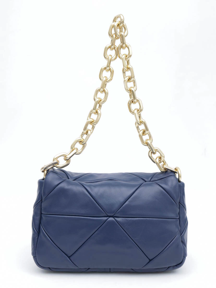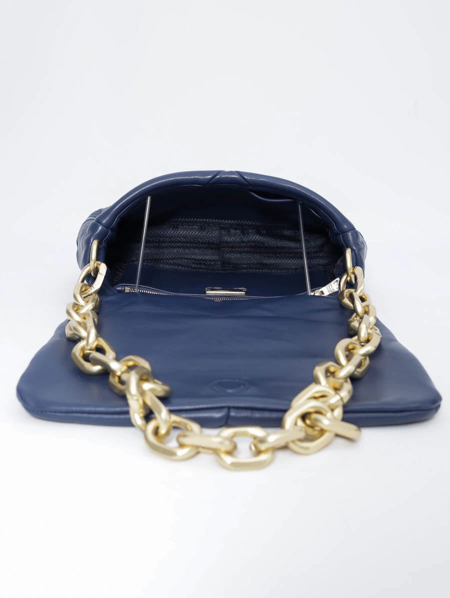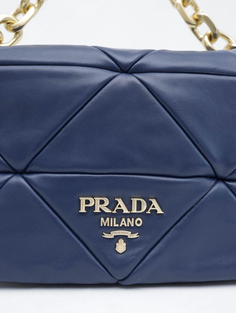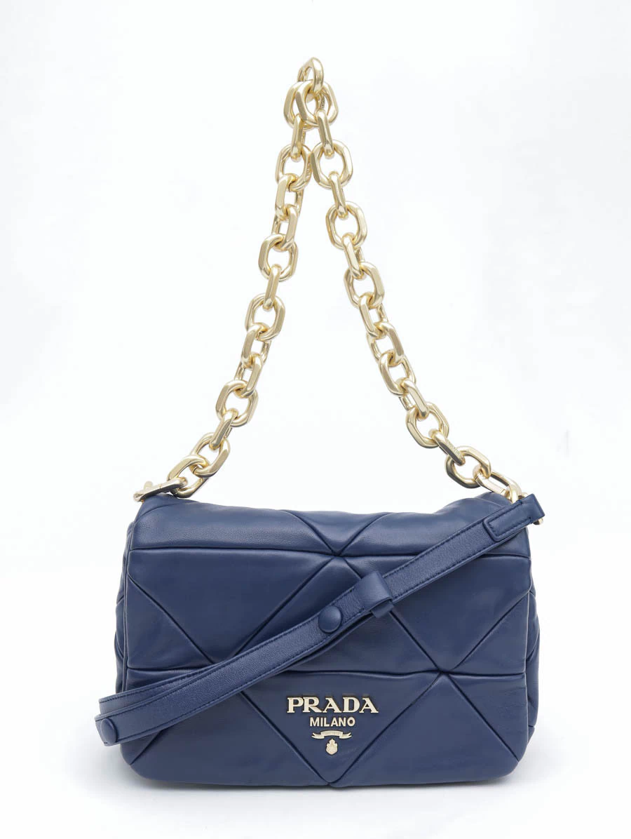 Bolsa Original Prada System em Nappa Patchproduzida em couro Prada Nappa na cor azul marinho e ferragens champanhe. Apresenta alças de ombro em correntes, alça longa removível com ajuste de comprimento, abertura flap com fecho oculto magnético, interior em couro e nylon com dois bolsos.