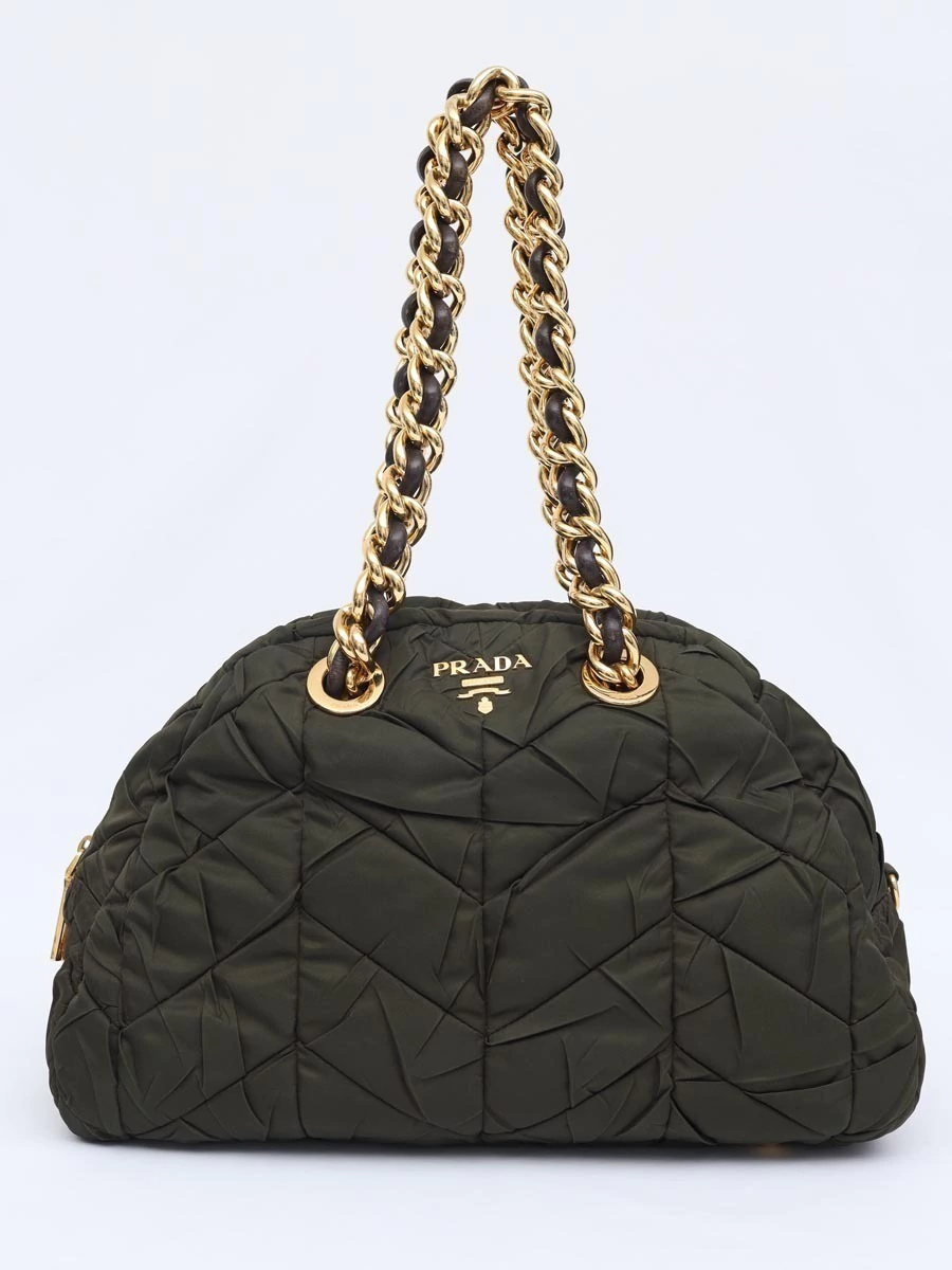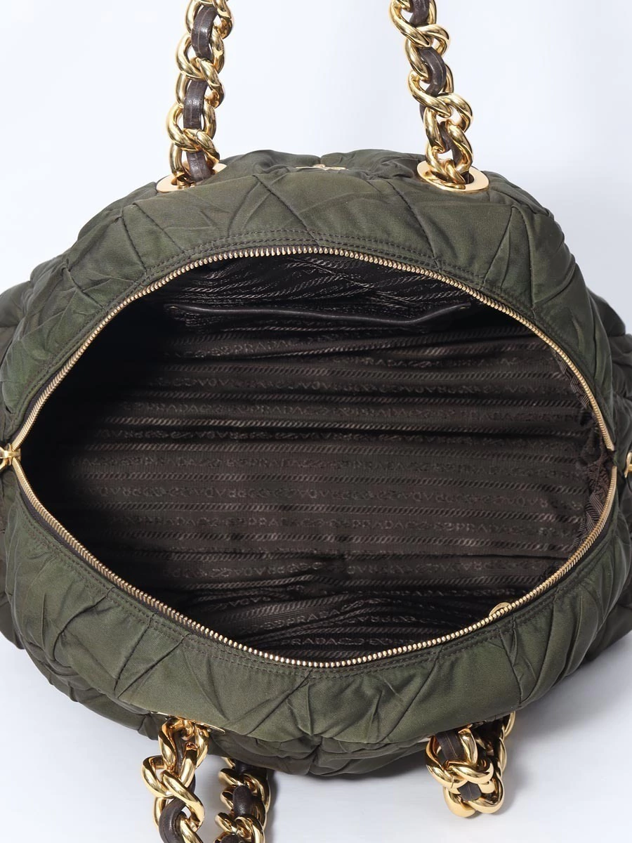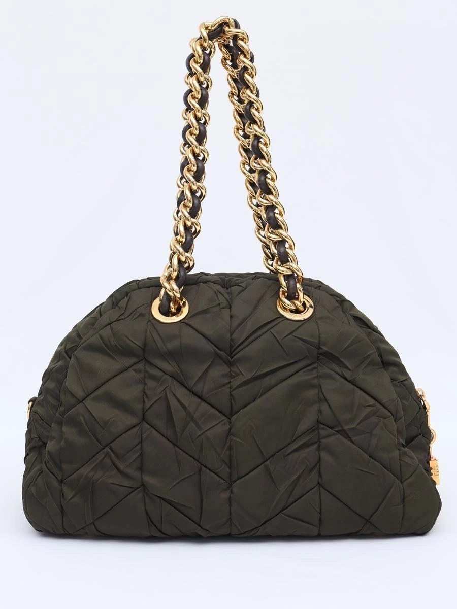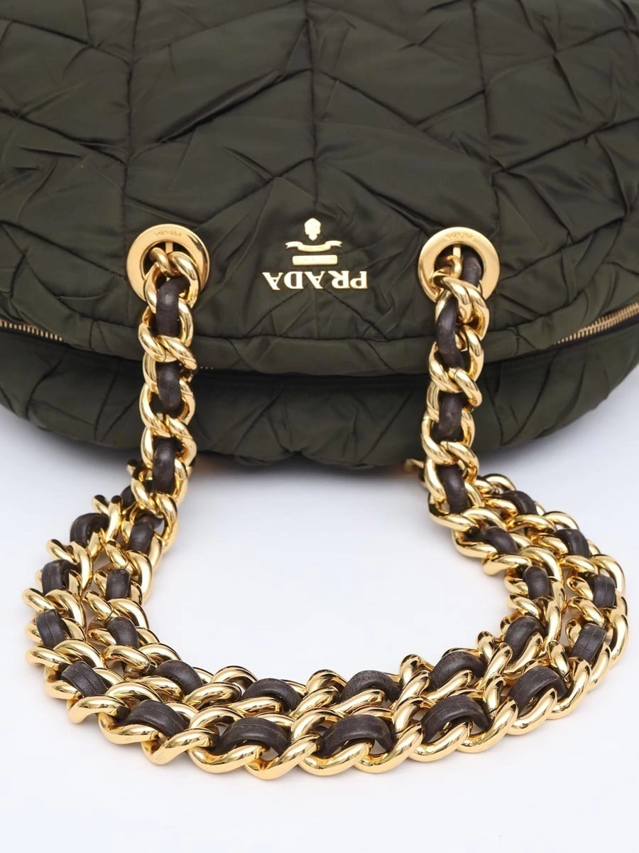 Autêntica Bolsa Prada Tessuto Chain Shoulder é uma opção perfeita para usar todos os dias! Produzida em nylon ultra resistente "Prada Tessuto" na cor verde oliva e imponentes alças de ombro com correntes douradas e couro entrelaçado, o modelo apresenta abertura superior com zíper, cadeado para maior segurança no fechamento e interior super espaçoso com dois bolsos.