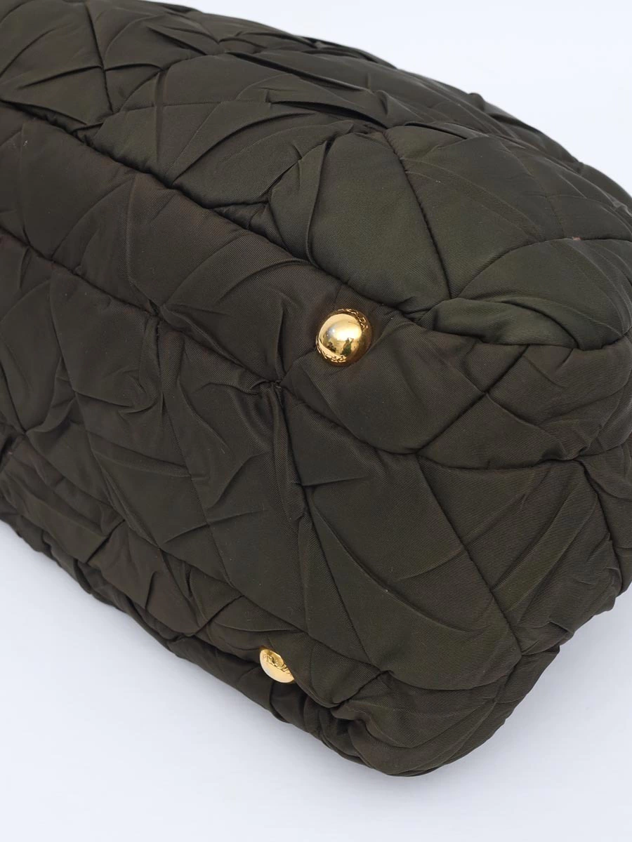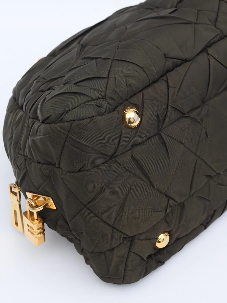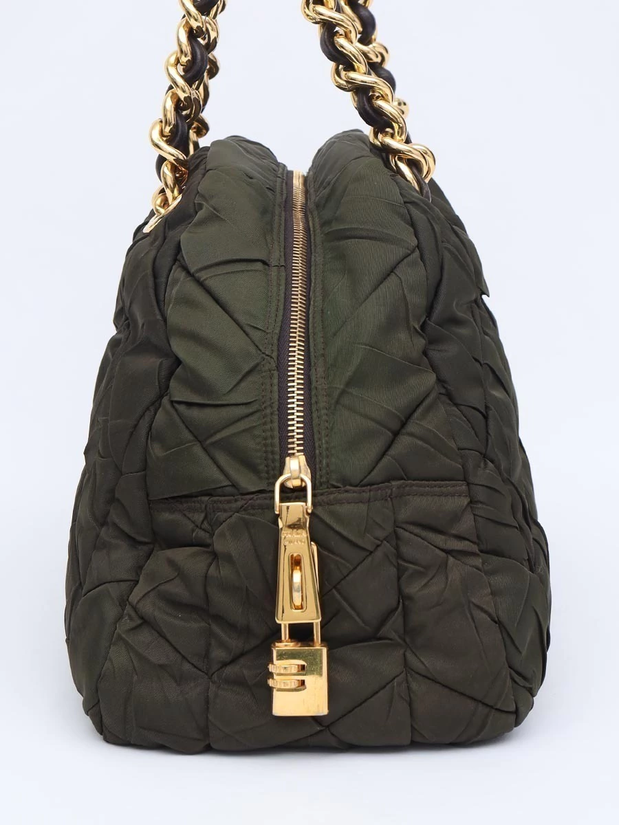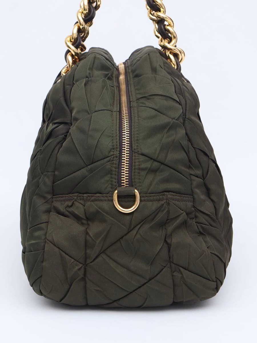 Autêntica Bolsa Prada Tessuto Chain Shoulder é uma opção perfeita para usar todos os dias! Produzida em nylon ultra resistente "Prada Tessuto" na cor verde oliva e imponentes alças de ombro com correntes douradas e couro entrelaçado, o modelo apresenta abertura superior com zíper, cadeado para maior segurança no fechamento e interior super espaçoso com dois bolsos.