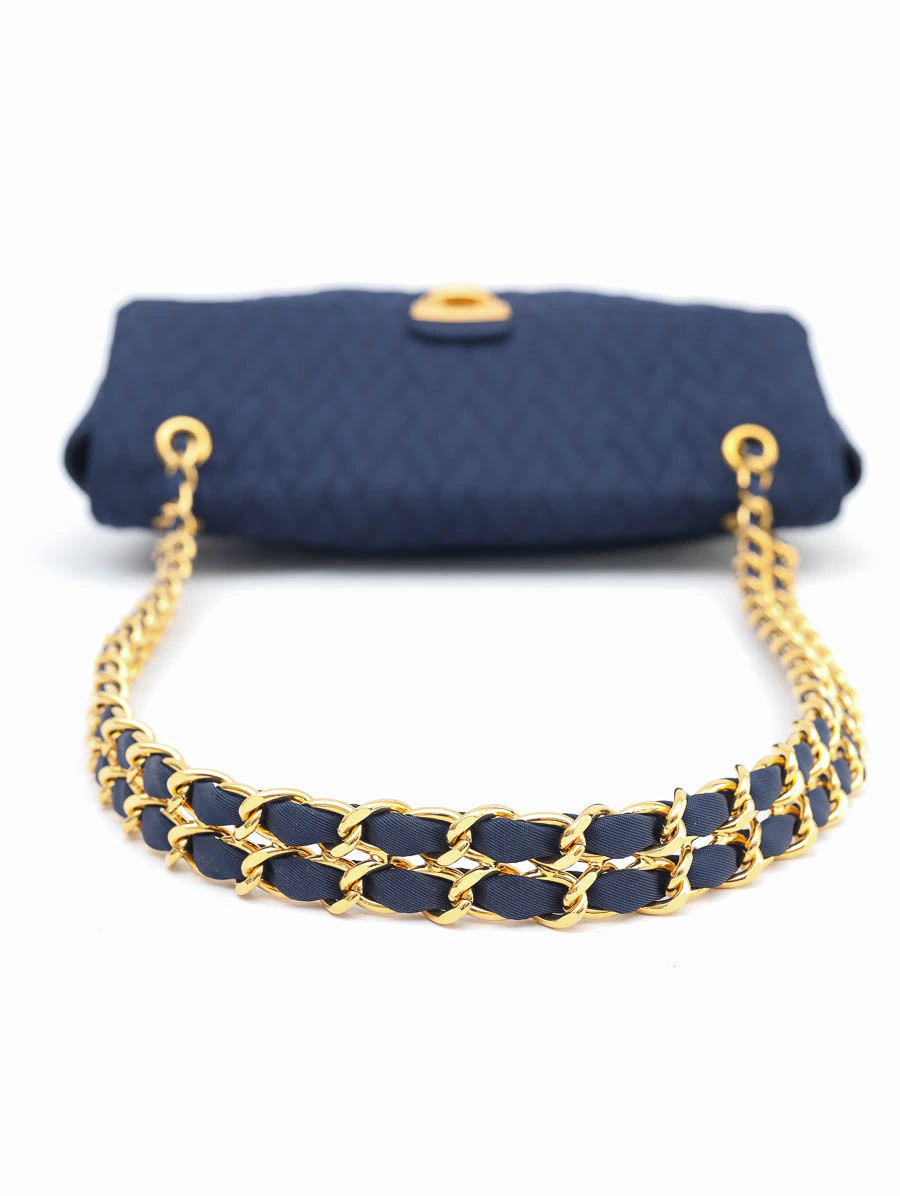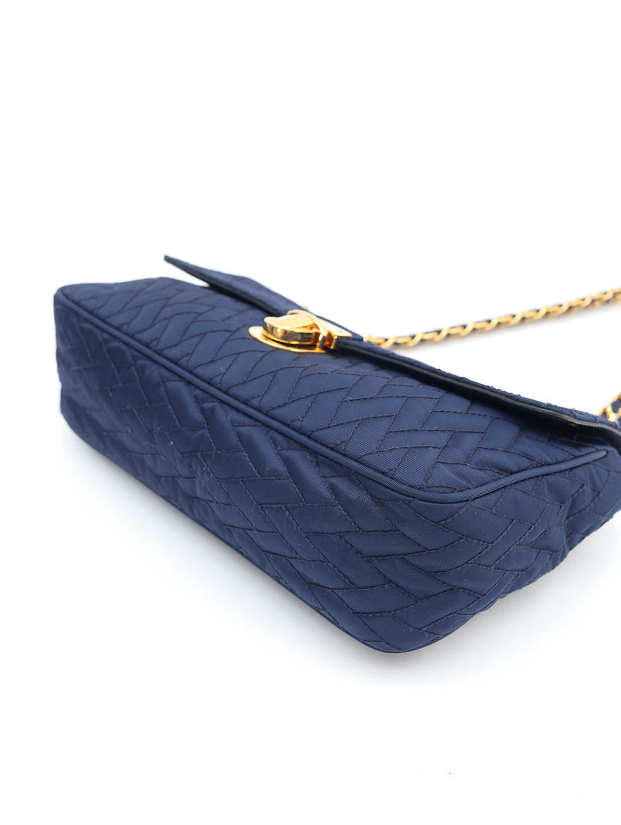 Bolsa Prada Tessuto Shoulder Bag produzida em nylon na cor azulcom metais dourados. Apresenta compartimento único com dois bolsos, sendo um com zíper e um aberto, fecho de encaixe e alça de ombro em correntes.