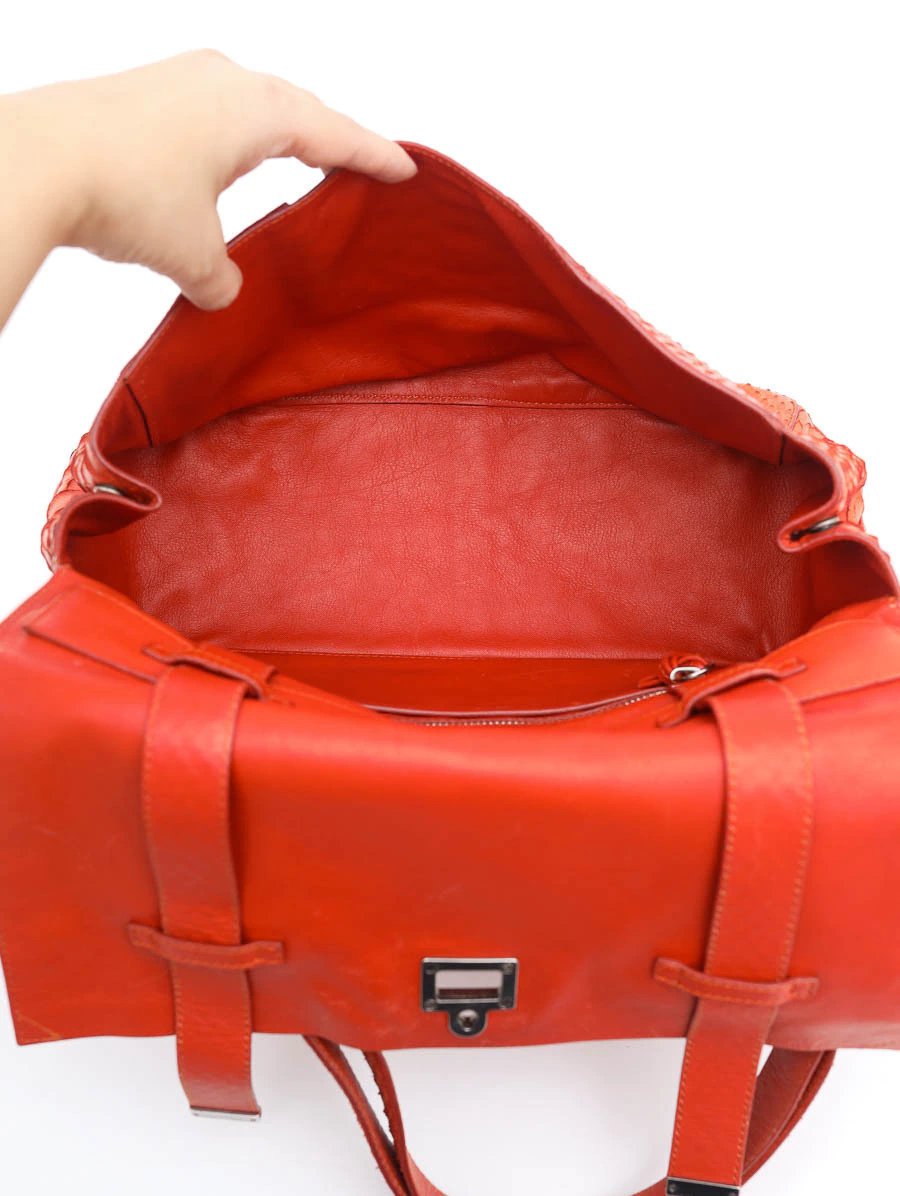 A bolsa apresenta marcas de uso, como pequenas manchinhas no couro exterior e no revestimento interno. Apesar dessas características, elas não comprometem sua beleza ou funcionalidade, mantendo a autenticidade e o charme de uma peça.