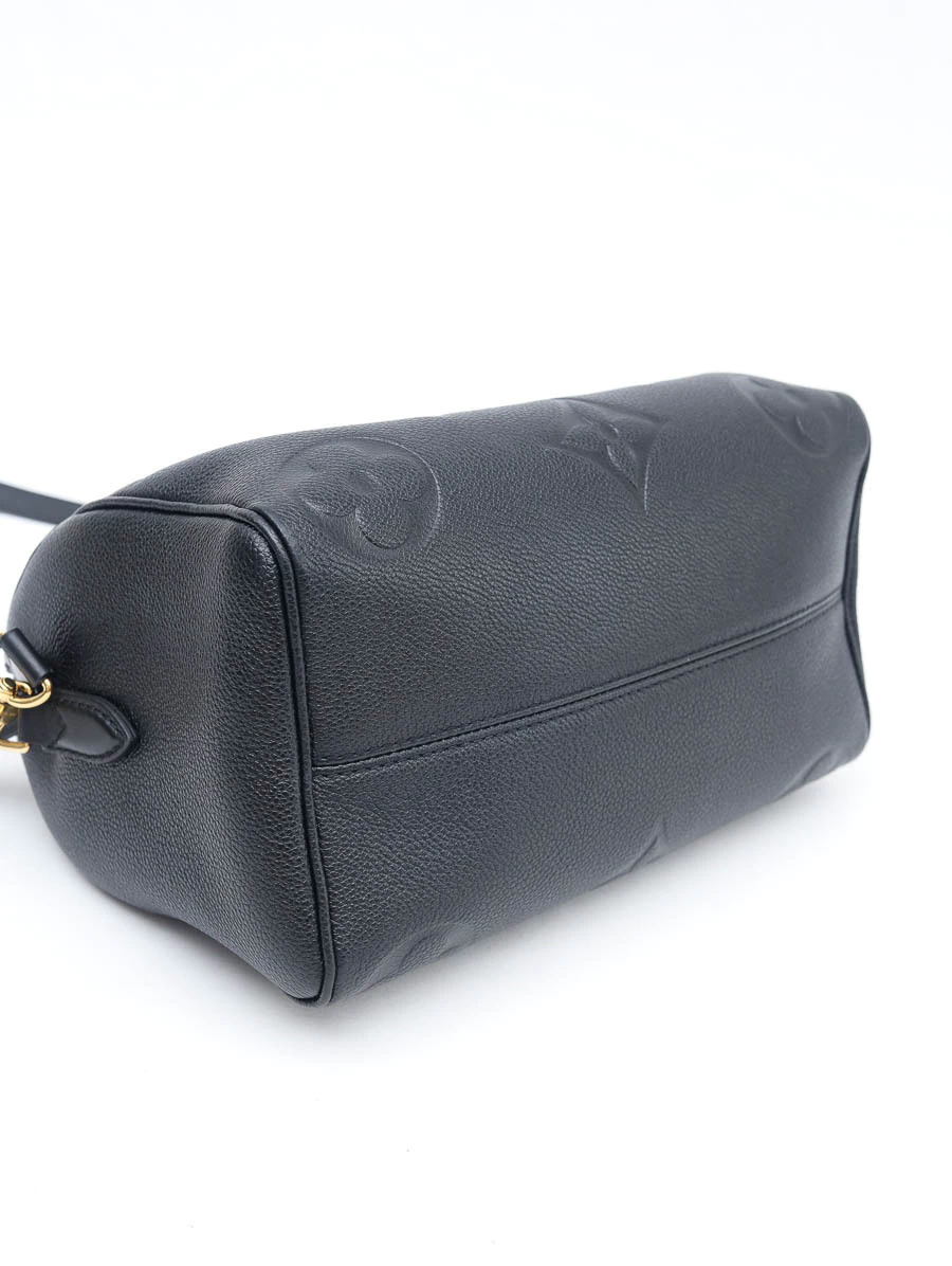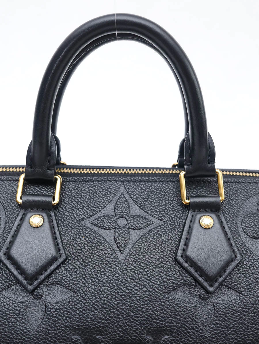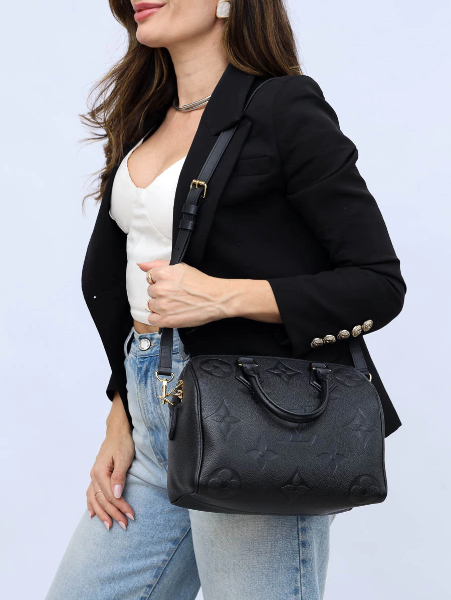Bolsa Speedy Bandoulière 25 em couro preto Monogram Empreinte, com estrutura firme, alça de mão e tiracolo removível. Modelo clássico e versátil, ideal para o dia a dia com toque sofisticado.