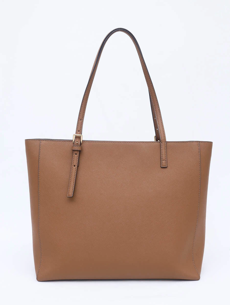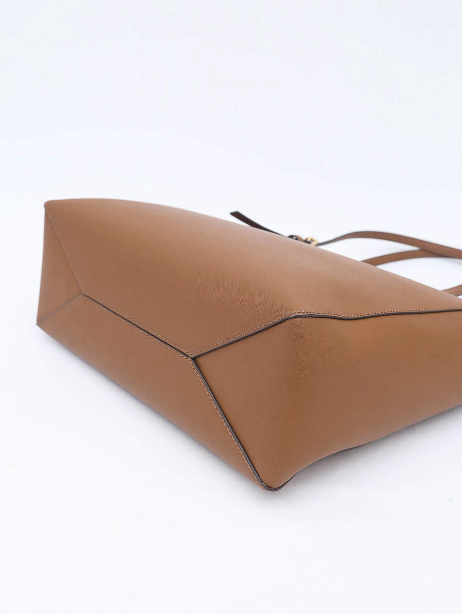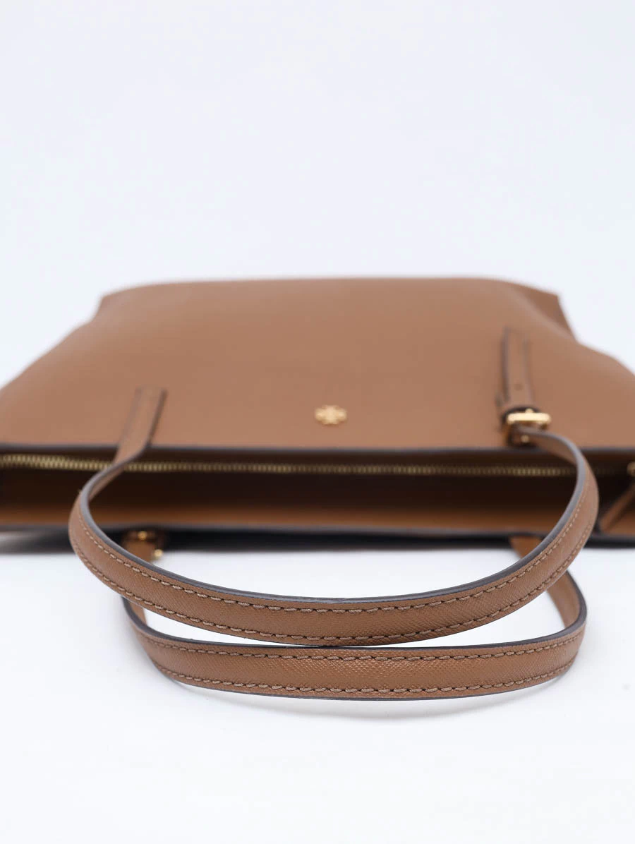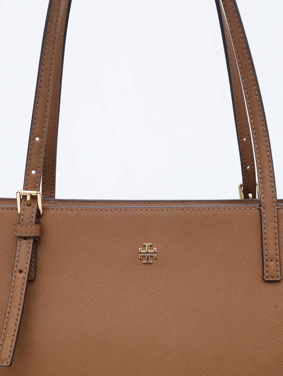 Bolsa Tory Burch Emerson Buckle Tote Saffiano Original. Esta elegante bolsa tote foi confeccionada em couro Saffiano marrom de alta qualidade, com detalhes em metais dourados que garantem sofisticação ao modelo. Suas alças de ombro ajustáveis proporcionam conforto e praticidade para o uso diário. A abertura superior com zíper oferece segurança, enquanto o interior conta com um bolso maior com zíper e um bolso adicional aberto, ideais para organizar seus itens essenciais.