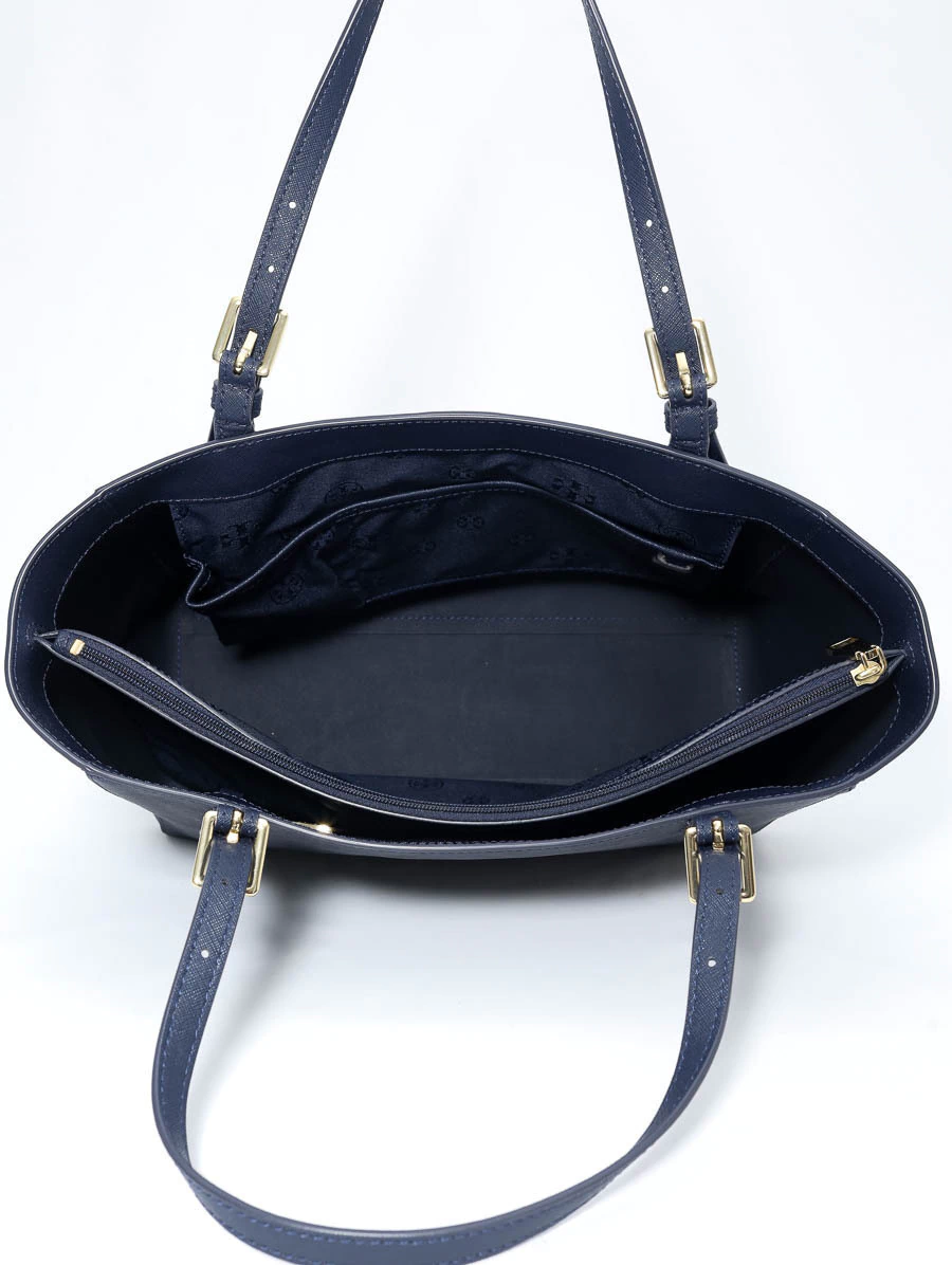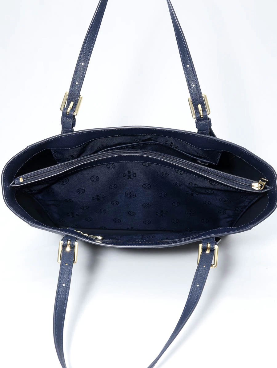 Bolsa Tory Burch Emerson Buckle Tote Saffiano confeccionada em couro Saffiano na cor azul marinho, com detalhes em metais dourados que garantem sofisticação ao modelo. Suas alças de ombro ajustáveis proporcionam conforto e praticidade para o uso diário. A abertura superior com zíper oferece segurança, enquanto o interior conta com um bolso maior com zíper e dois compartimentos grandes abertos.