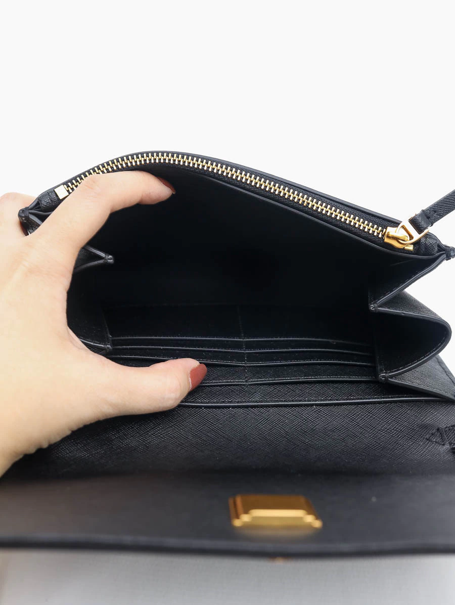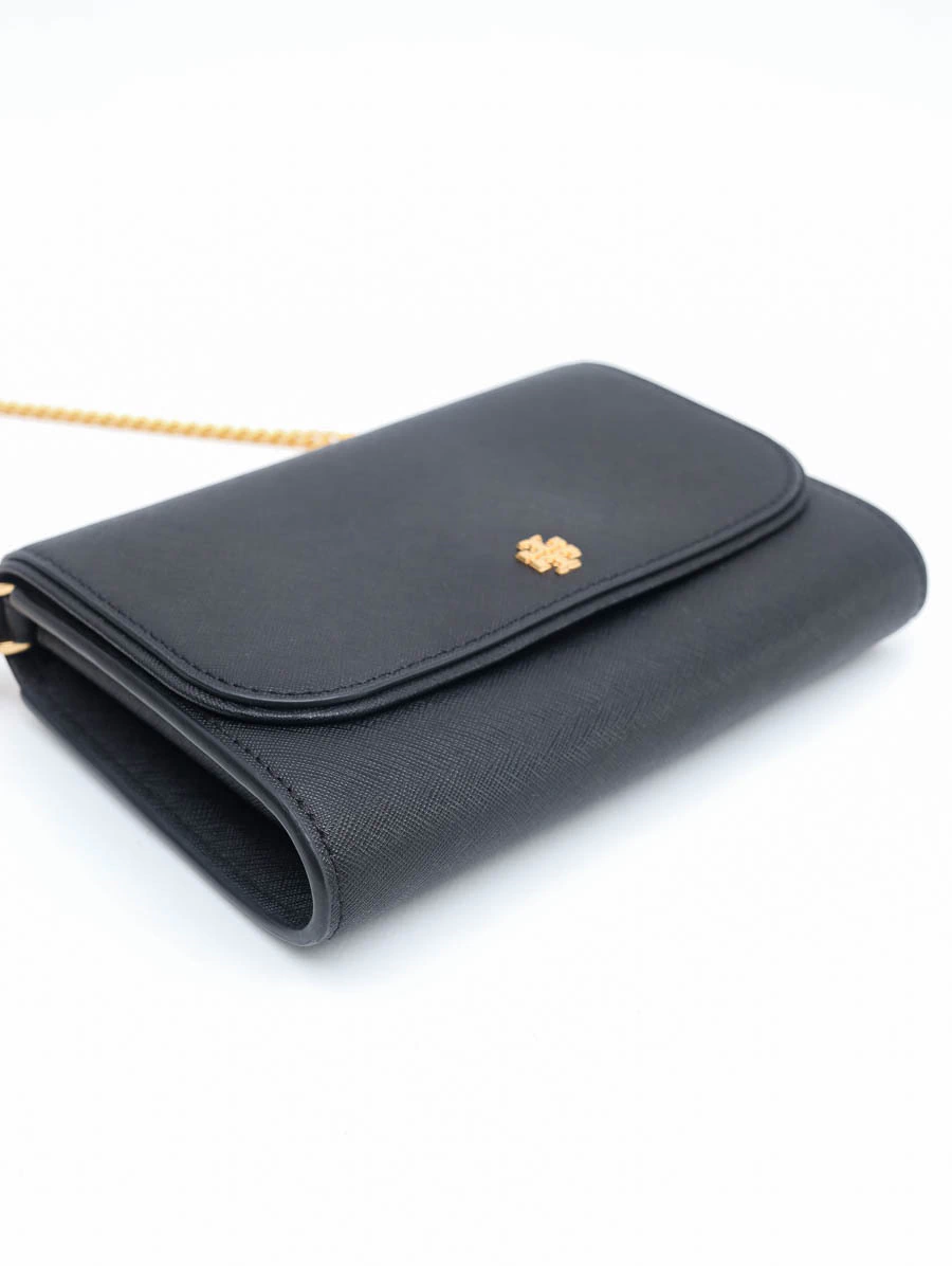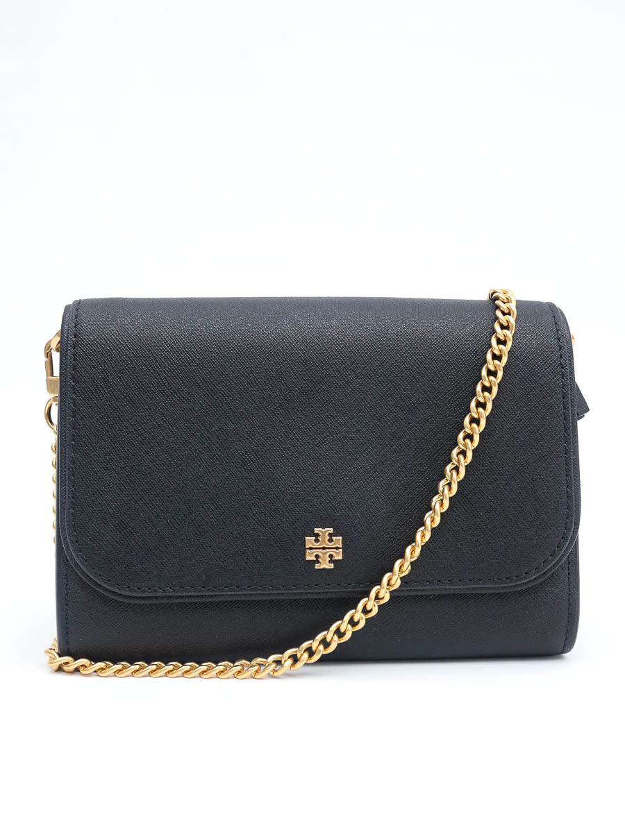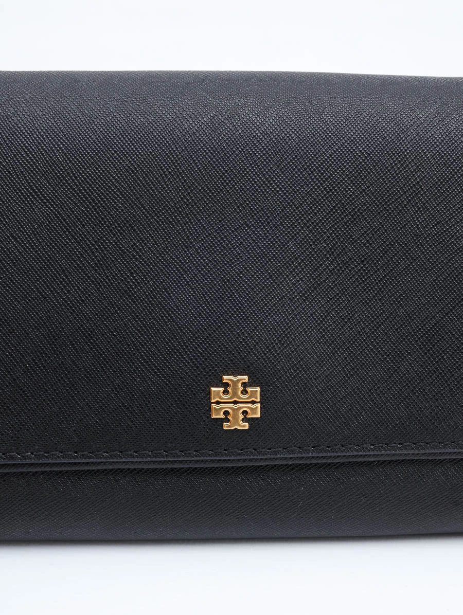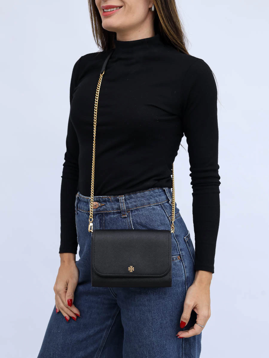 A Bolsa Tory Burch Emerson Flap é uma peça de muita elegância e funcionalidade, confeccionada em couro saffiano na clássica cor preta. Com um design compacto e uma aba flap com fecho magnético, esta bolsa é perfeita para transportar documentos, itens de maquiagem, e celulares de tamanho plus. A alça crossbody com correntes adiciona um toque de charme, complementado pelo icônico logo frontal da marca. O interior em couro oferece organização prática com 8 slots para cartões, um pequeno compartimento com zíper, além de um compartimento principal espaçoso, equilibrando estilo com utilidade.