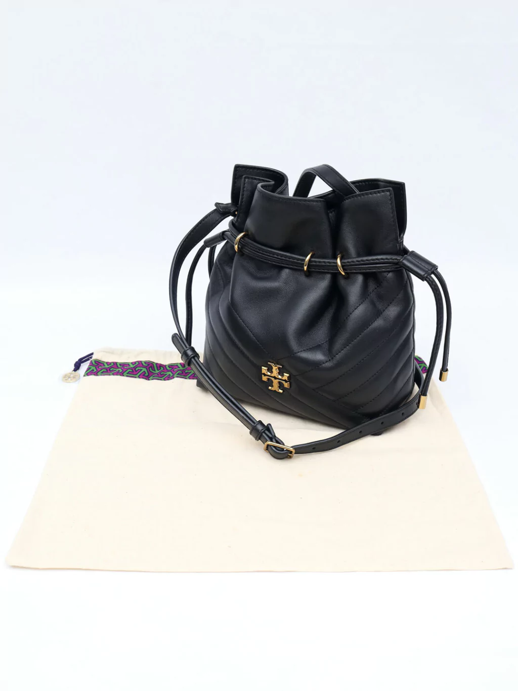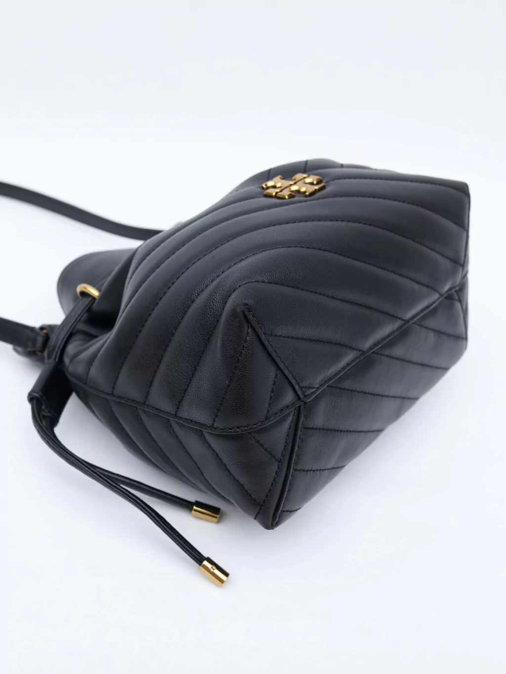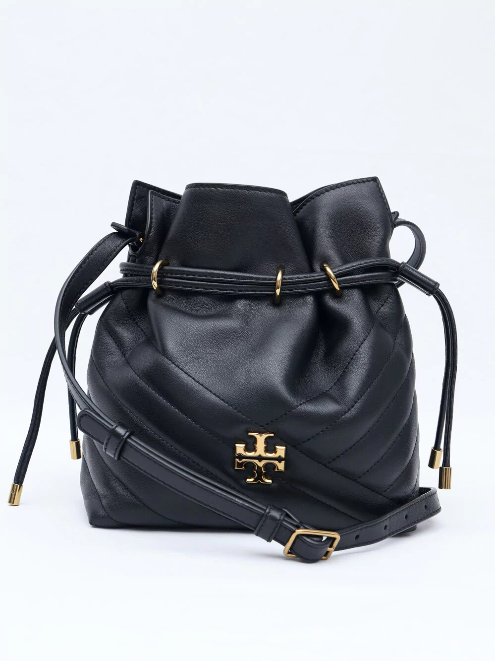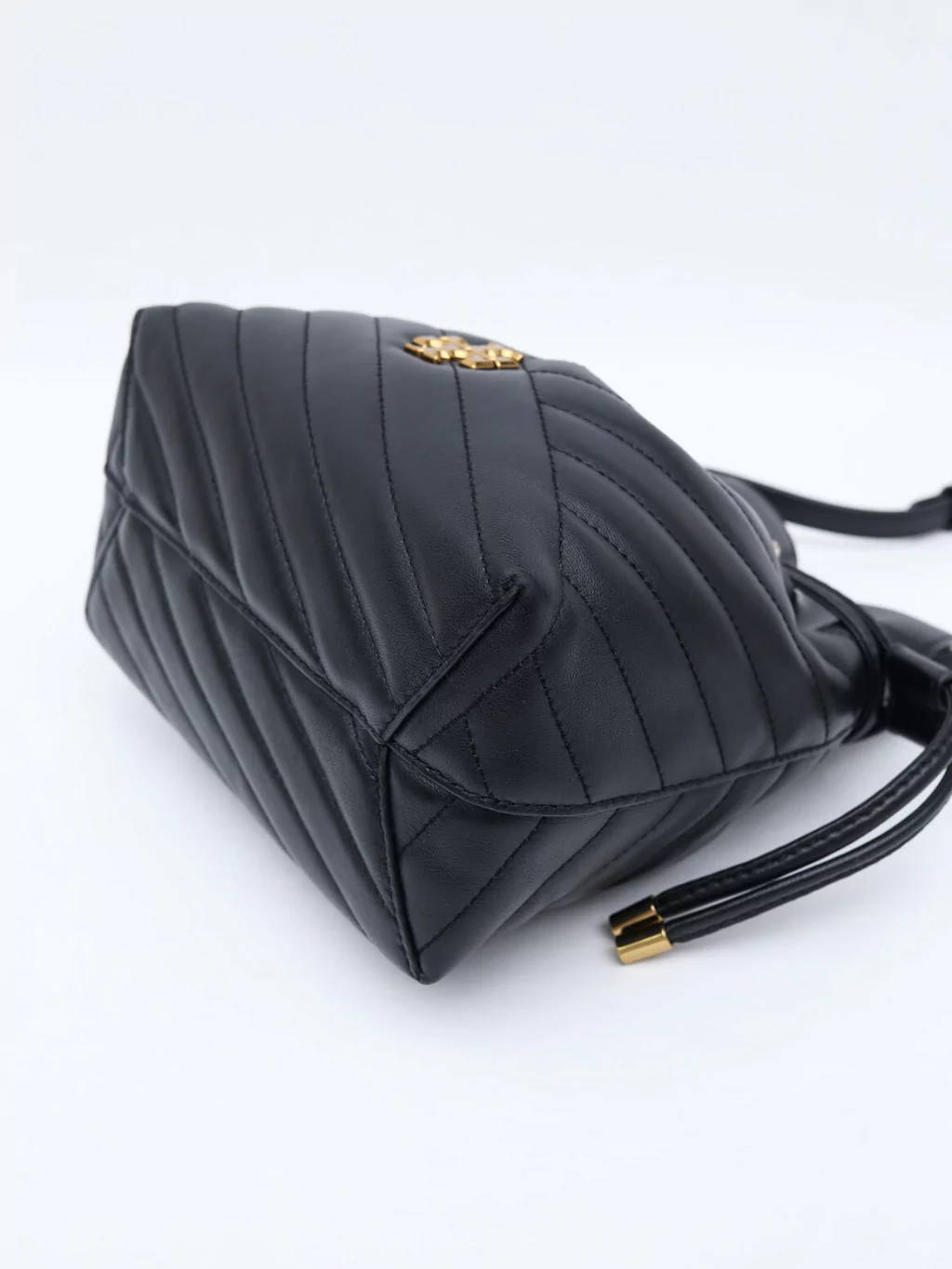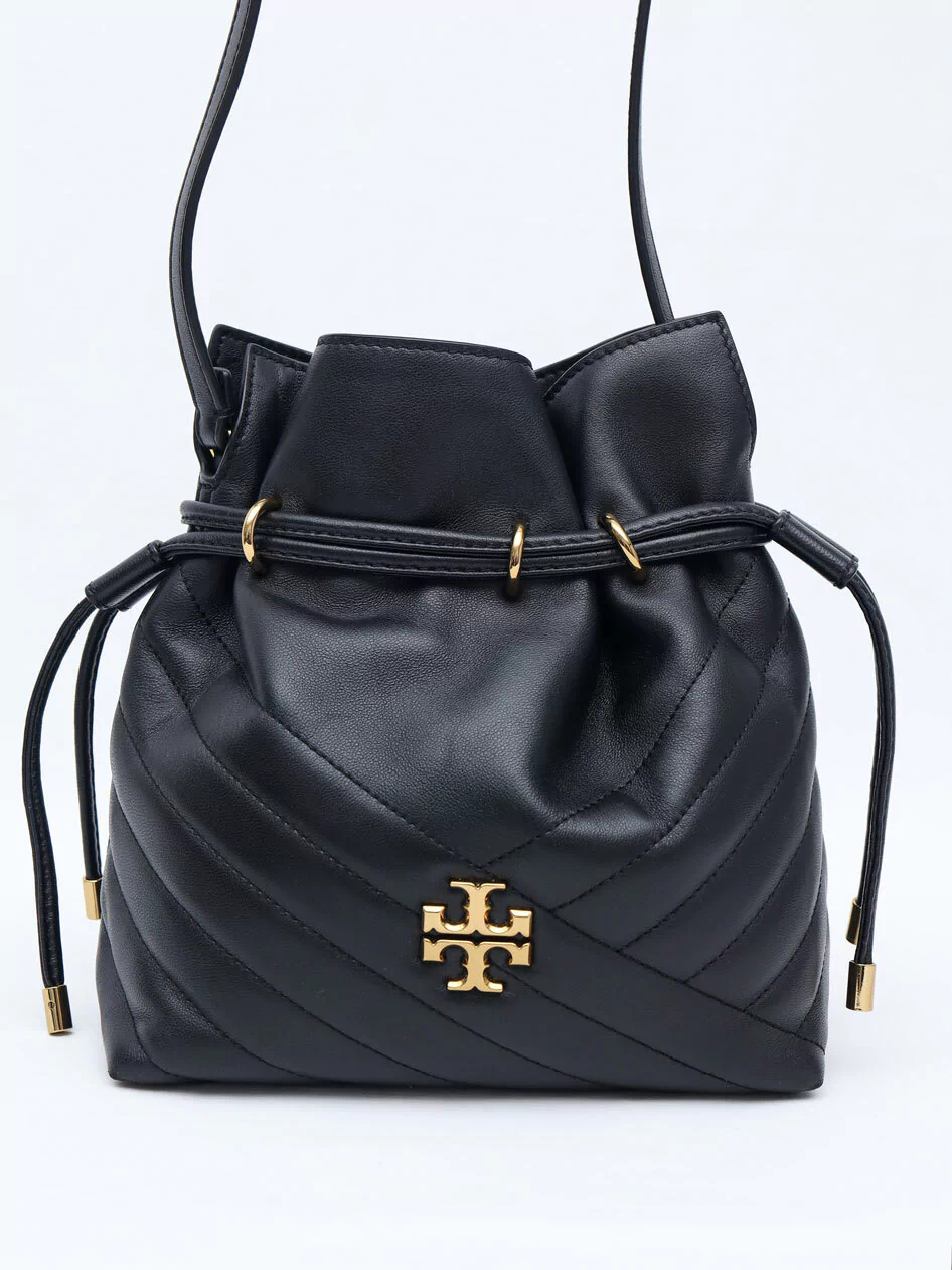 ABolsa Original Tory Burch Kira Chevron Drawstringé uma bolsa charmosa e uma maravilhosa opção para usar tanto durante o dia quanto à noite. Produzida em couro preto acolchoado e um lindíssimo logo Tory Burch Kira em metal dourado, o modelo apresenta abertura superior com fechamento através de cordões enforcadores de couro, alça longa com ajuste de comprimento e interior em tecido sarja com um bolso com zíper.