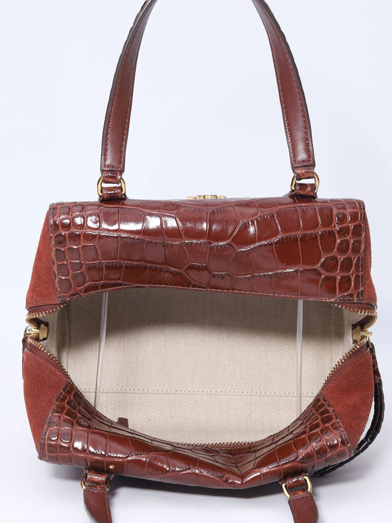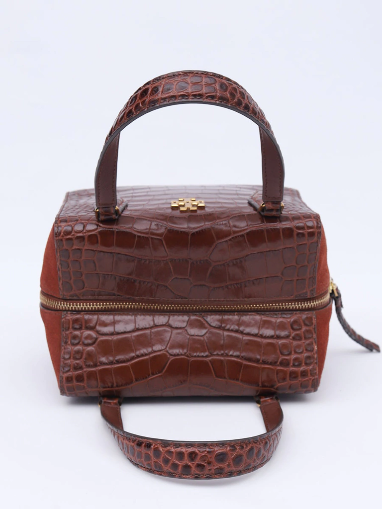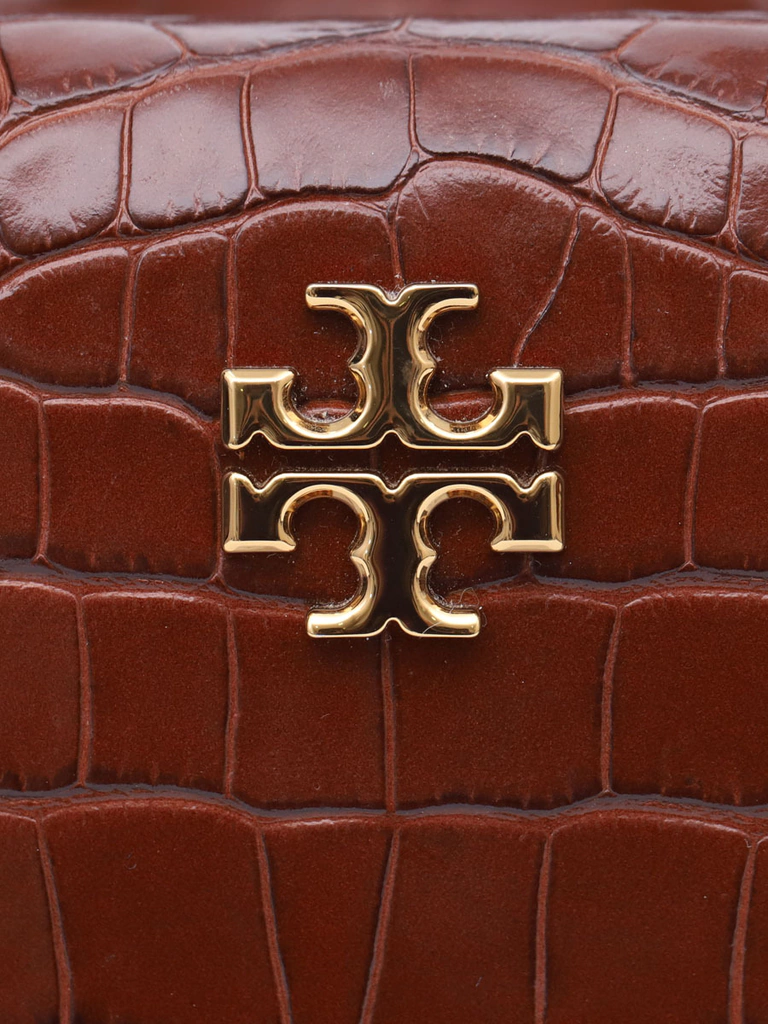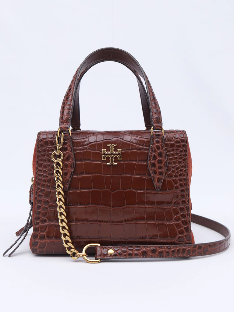 Bolsa Autêntica Tory Burch Kira Embossed Small Satchel produzida em couro estruturado com estampa em relevo croco, detalhes em couro camurça nas laterais e metais dourados. Apresenta alças de mão, uma alça longa removível com ajuste de comprimento e uma abertura superior com dois zíperes com práticos puxadores em tiras de couro. Seu interior em tecido jacquard com um bolso com zíper é de fácil acesso e apresenta grande capacidade de armazenamento devido a boa profundidade do modelo.