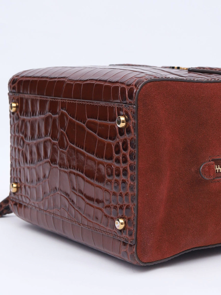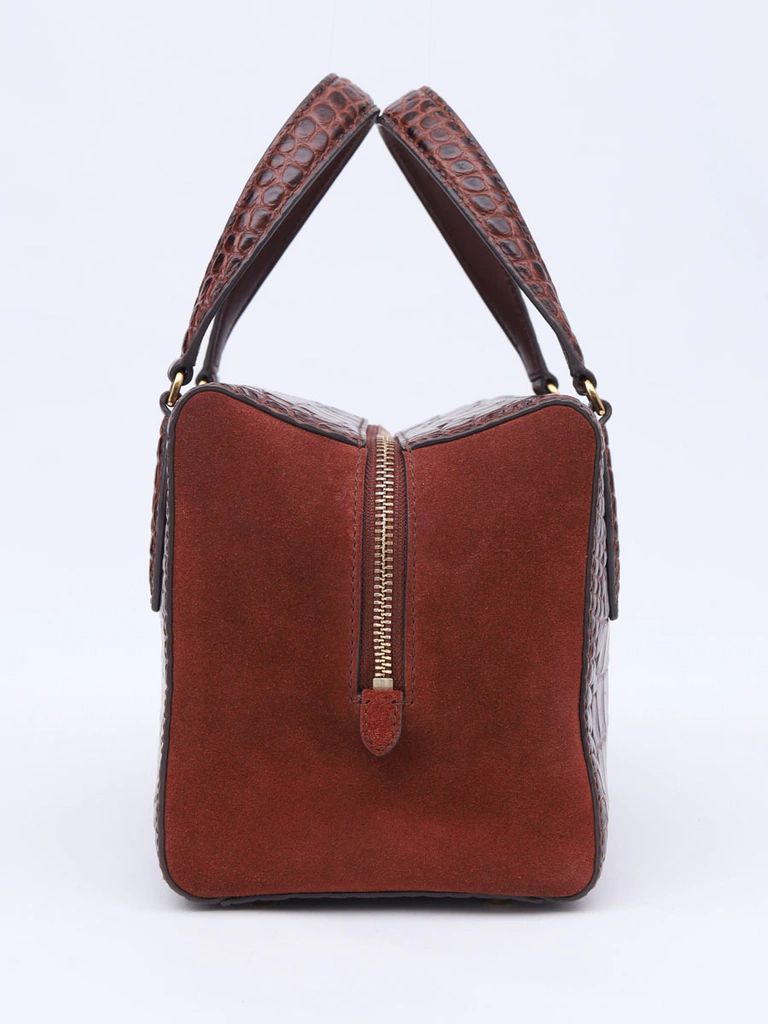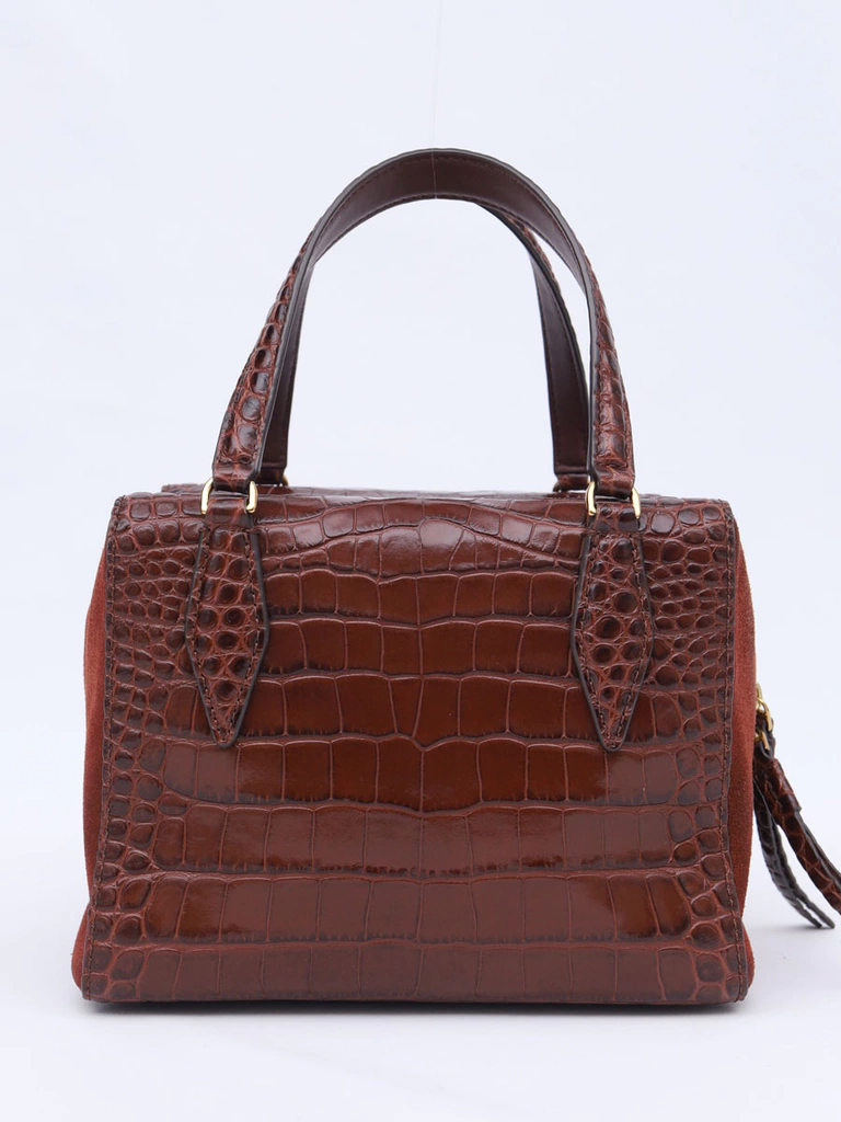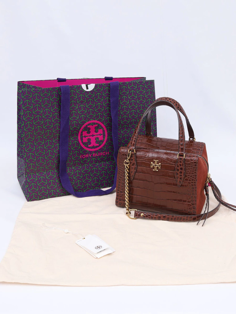 Bolsa Autêntica Tory Burch Kira Embossed Small Satchel produzida em couro estruturado com estampa em relevo croco, detalhes em couro camurça nas laterais e metais dourados. Apresenta alças de mão, uma alça longa removível com ajuste de comprimento e uma abertura superior com dois zíperes com práticos puxadores em tiras de couro. Seu interior em tecido jacquard com um bolso com zíper é de fácil acesso e apresenta grande capacidade de armazenamento devido a boa profundidade do modelo.