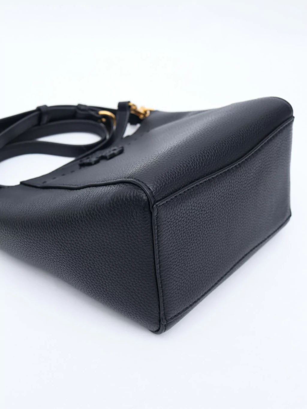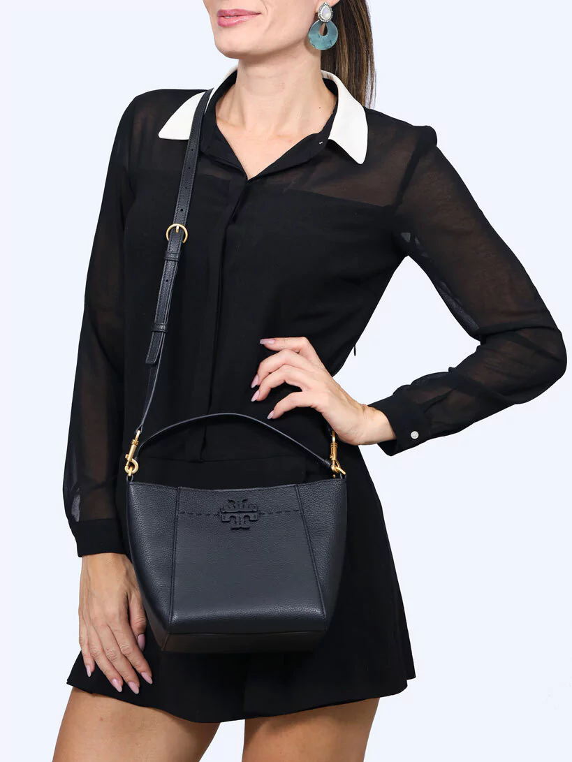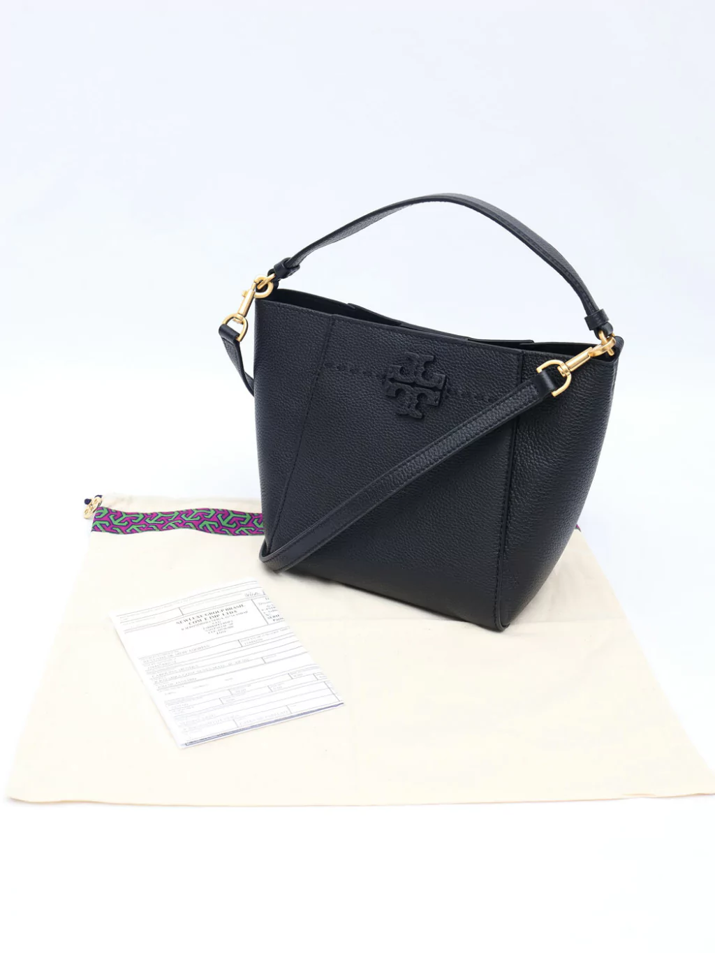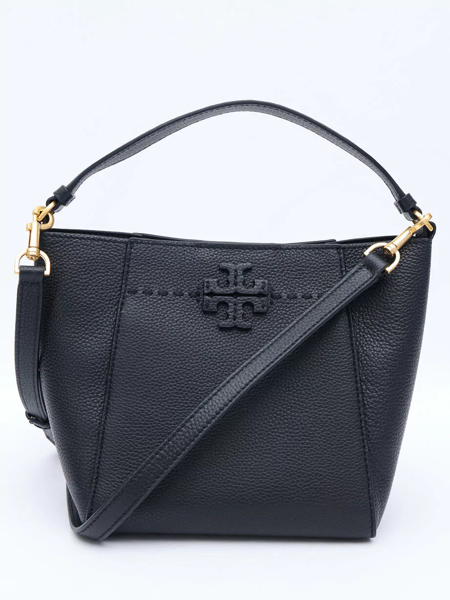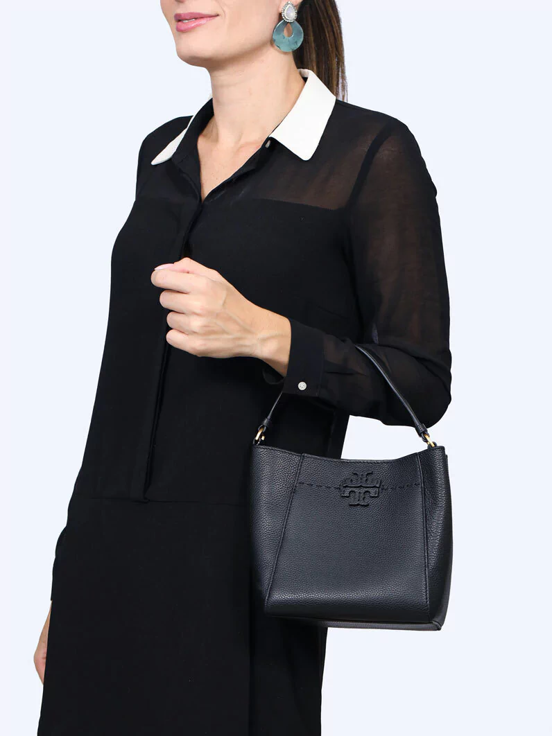 Bolsa AutênticaTory Burch Mcgraw Hobo Pequena produzida em couro granulado preto, alça longa removível com ajuste de comprimento, alça de mão e lindo logo com as letras T invertidas em couro. Apresenta interior aveludado com detalhes em couro com dois bolsos abertos. Uma bolsa muito prática para passeios e uso diário.