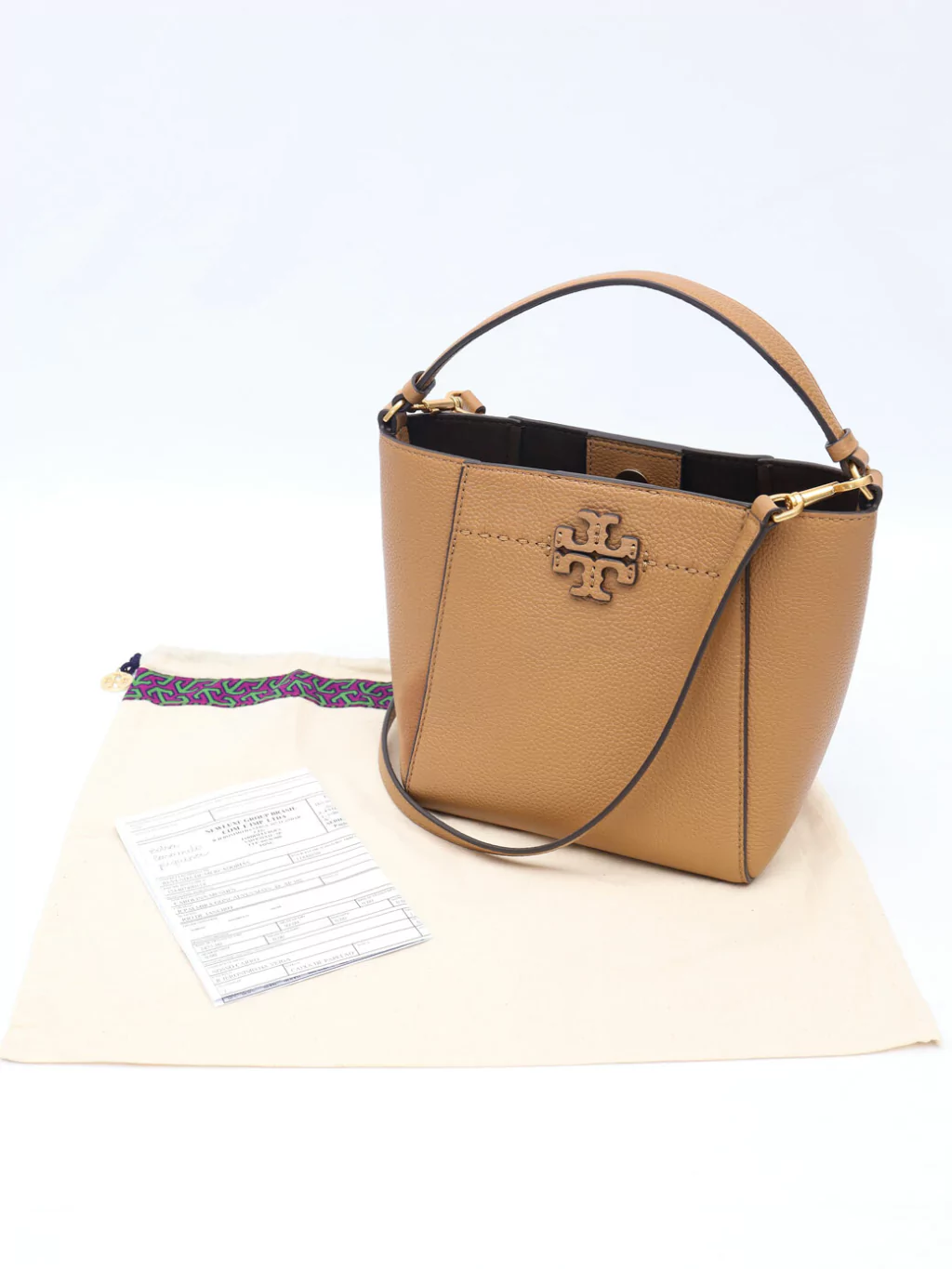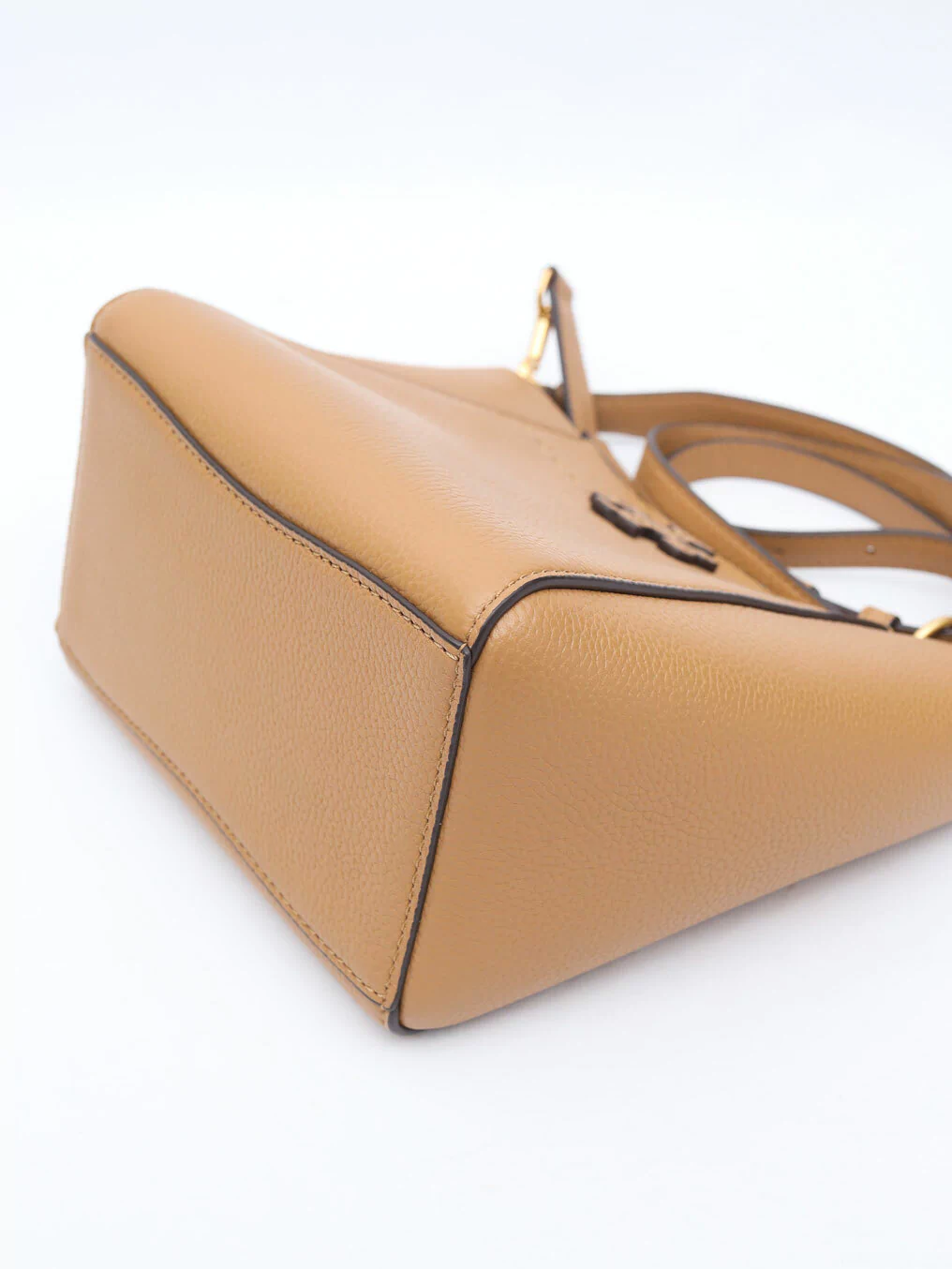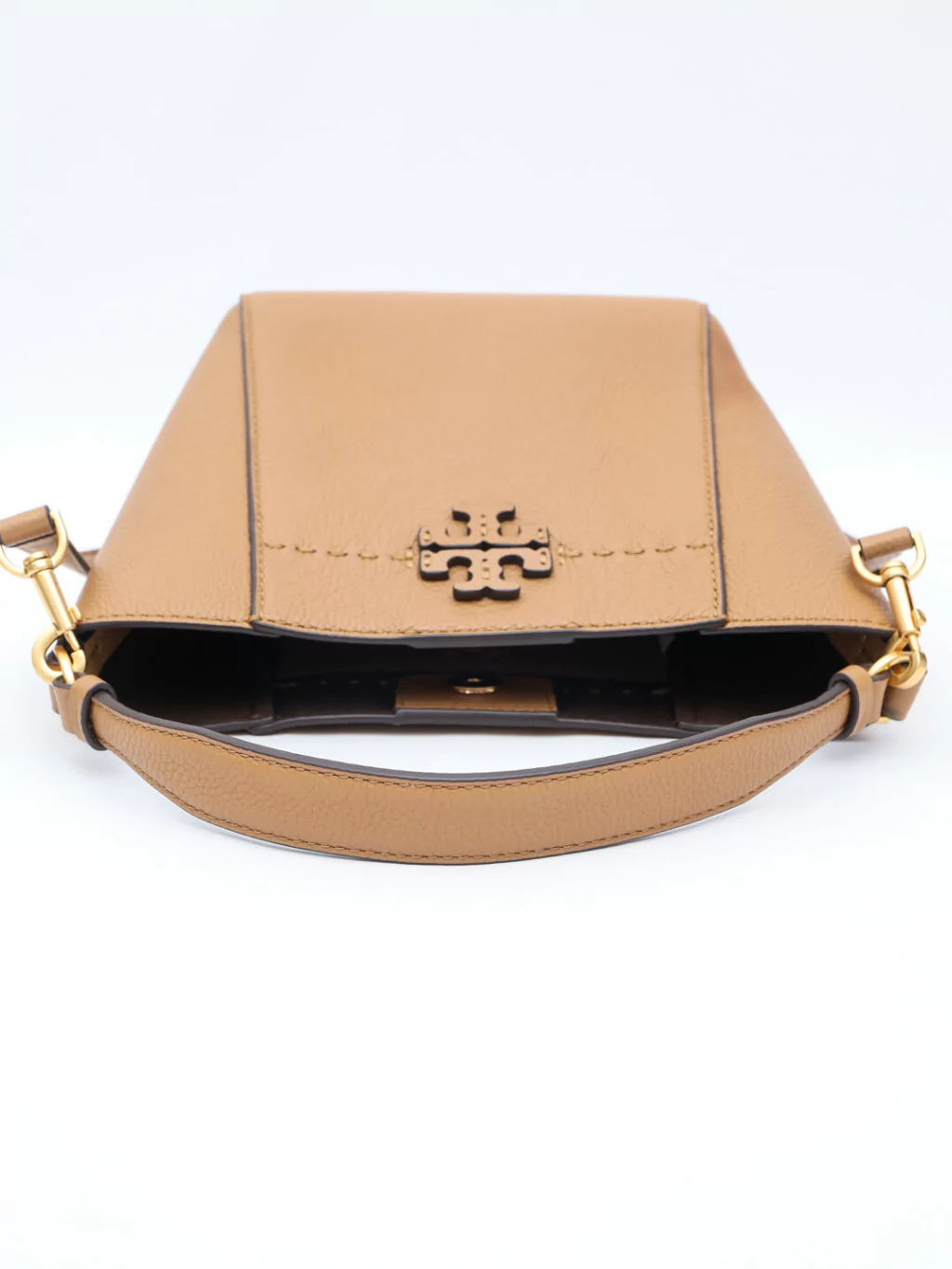 Bolsa AutênticaTory Burch Mcgraw Hobo Pequena produzida em couro granulado caramelo, alça longa removível com ajuste de comprimento, alça de mão e lindo logo com as letras T invertidas em couro. Apresenta interior aveludado com detalhes em couro com dois bolsos abertos. Uma bolsa muito prática para passeios e uso diário.
