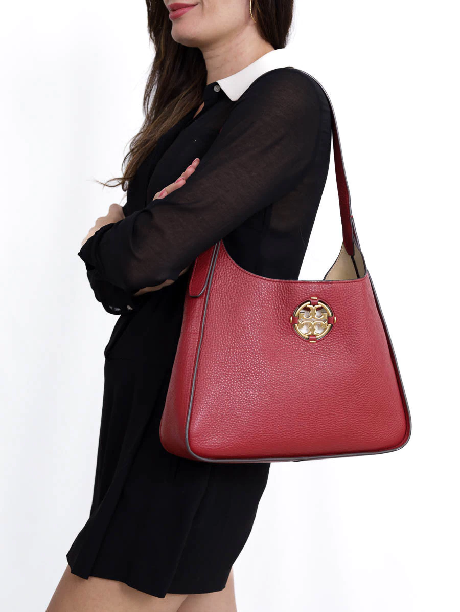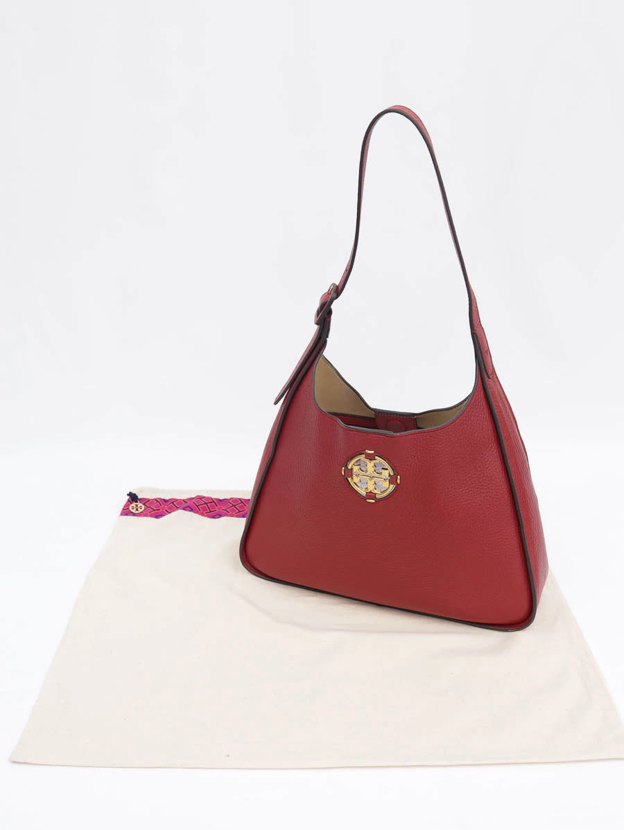 Bolsa Original Tory Burch Millerproduzida em couro na cor vermelha e metais dourados. Apresenta alça de ombro, abertura por fecho magnético e compartimento único com dois bolsos, um bolso aberto e um bolso com zíper.