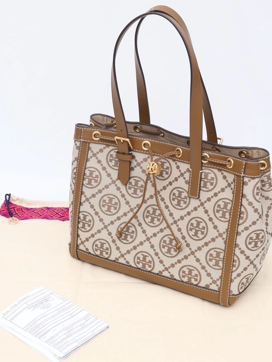 Bolsa AutênticaTory Burch Tote T Monogram Jacquard produzida em tecido sintético Jacquard com estampa monograma. A bolsa tote tem acabamento em couro liso marrom, com alças ajustáveis e fecho de cordão com um mecanismo push-lock duplo T de latão. Forrado em micro camurça macia, o interior possui um bolso para organização.