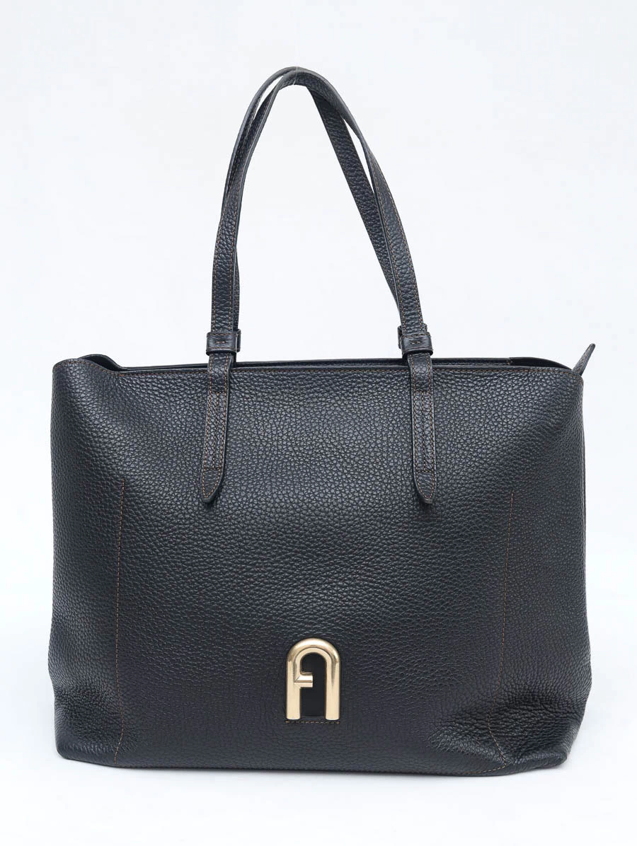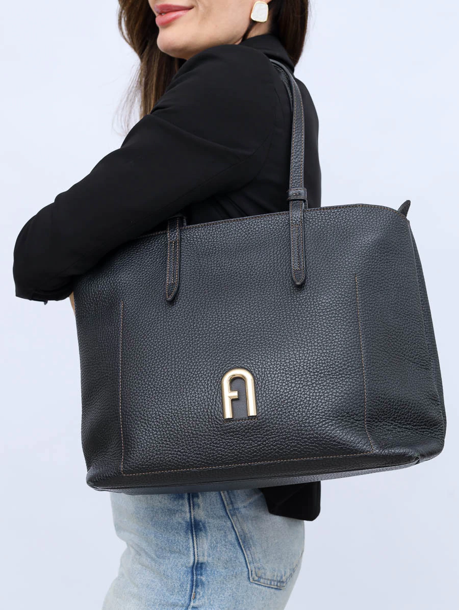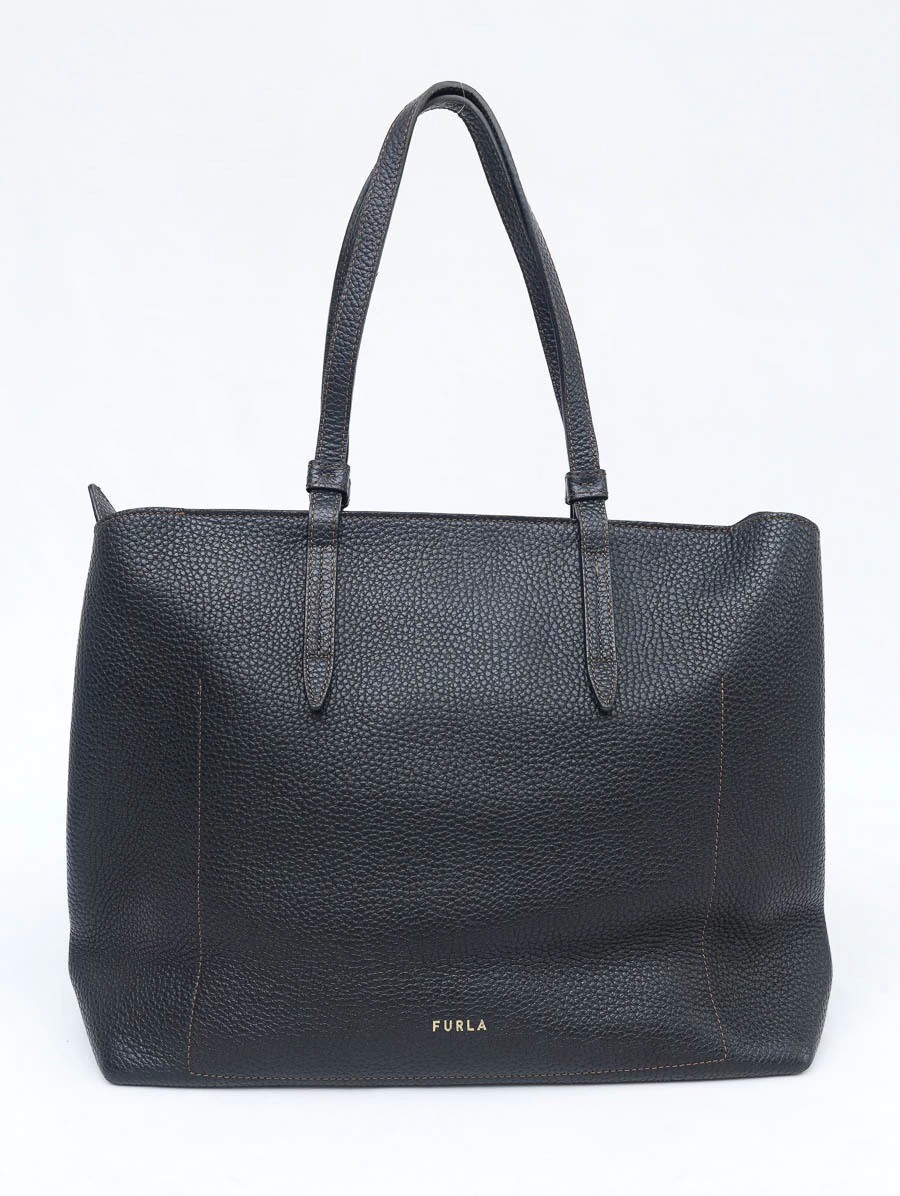 Bolsa original Furla Vittoria Tote em couro preto texturizado, com design minimalista, alças estruturadas e detalhe do logo dourado na parte frontal. Espaçosa e versátil, ideal para a rotina com elegância.