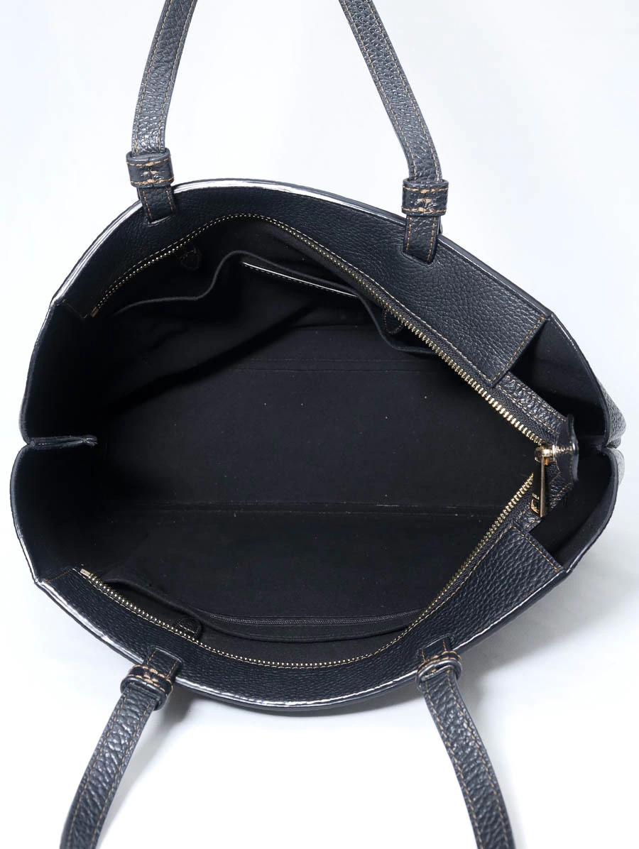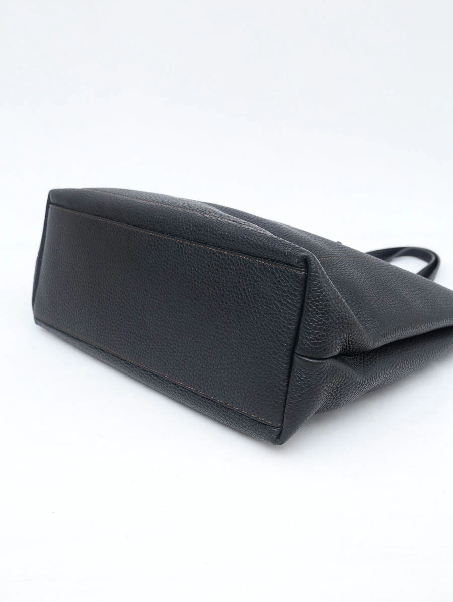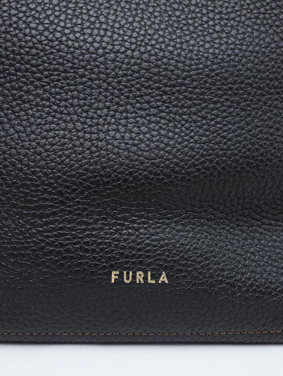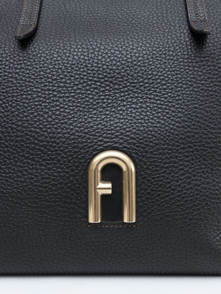 Bolsa original Furla Vittoria Tote em couro preto texturizado, com design minimalista, alças estruturadas e detalhe do logo dourado na parte frontal. Espaçosa e versátil, ideal para a rotina com elegância.