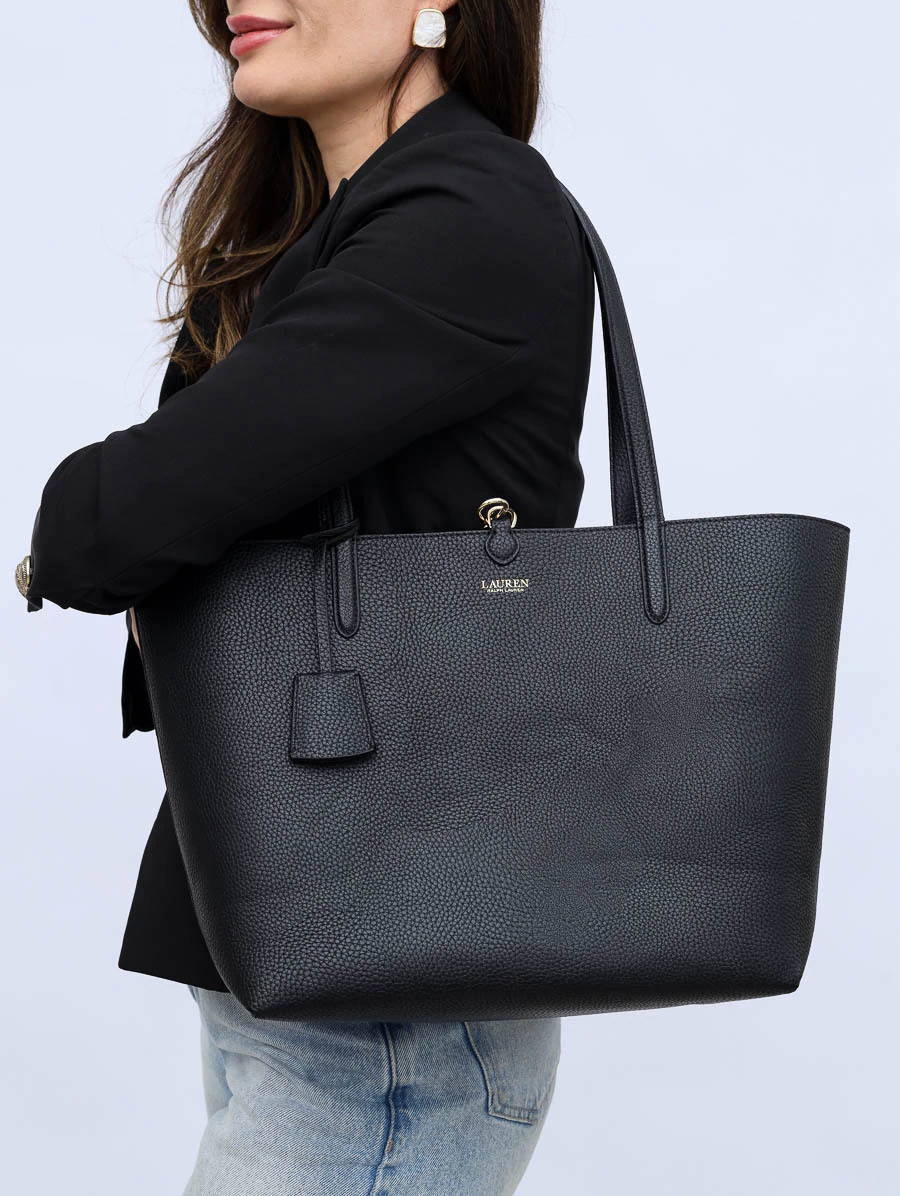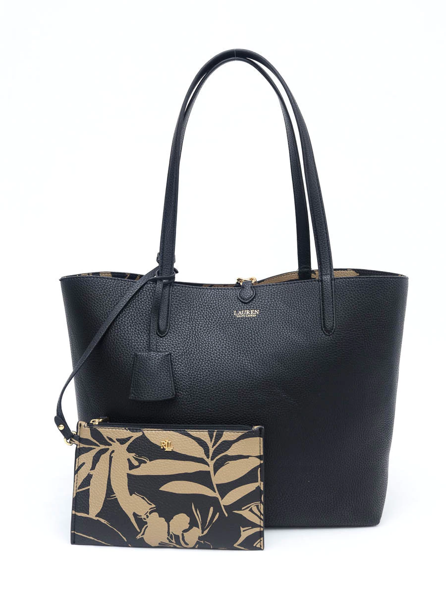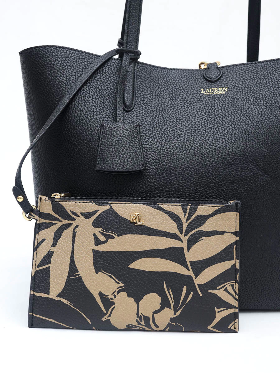 Bolsa original Lauren Ralph Lauren Bennington Tote em couro preto texturizado, com design clássico e espaçoso, ideal para a rotina. Acompanha pouch destacável com estampa botânica em preto e dourado, trazendo um toque moderno ao conjunto.