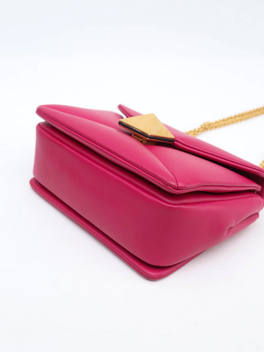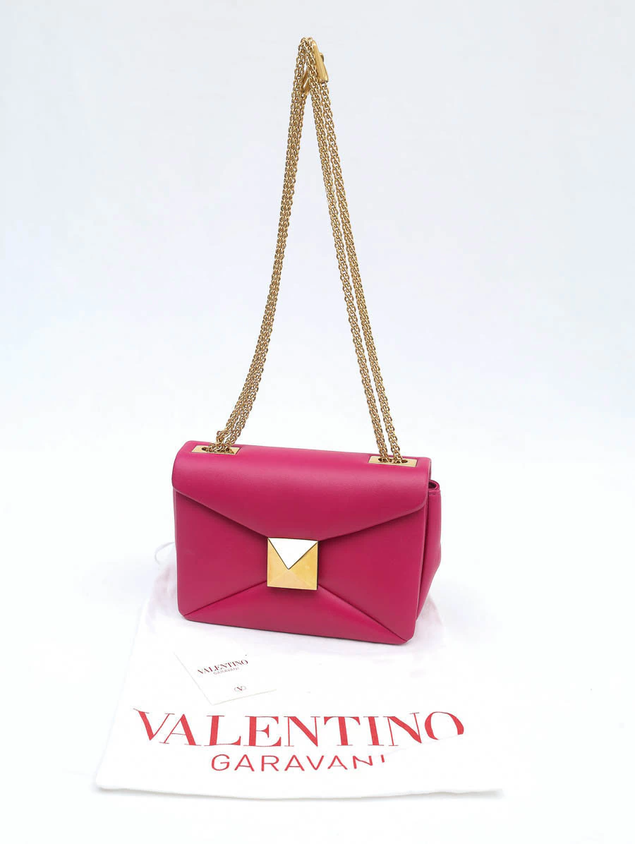 Bolsa original Valentino Garavani Roman Stud em couro rosa vibrante, com fechamento em maxi stud dourado e alça dupla em corrente. Ícone moderno da marca, une elegância e um visual marcante para compor looks sofisticados.