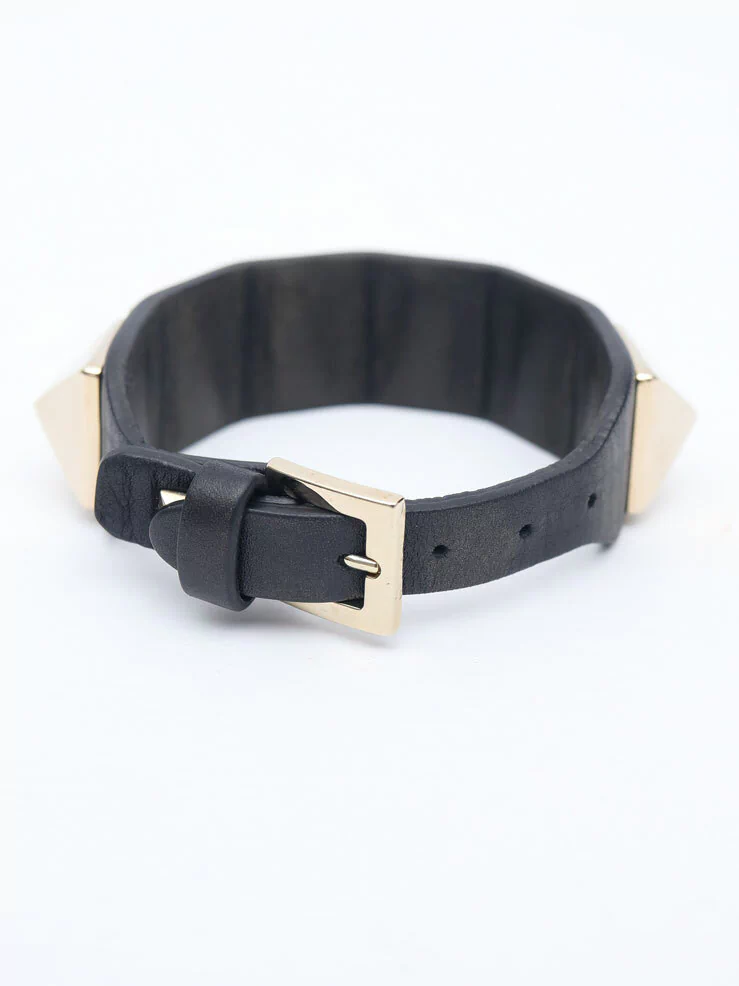 Autêntico Bracelete Valentino Large Rockstud produzida em couro com tachas em metal dourado. Apresenta fivela de ajuste com 5 furações para melhor ajuste no pulso. Esse lindo bracelete se encontra em excelente estado de conservação, com os metais polidos e brilhantes e couro bem conservado com pequenas marquinhas naturais de uso.