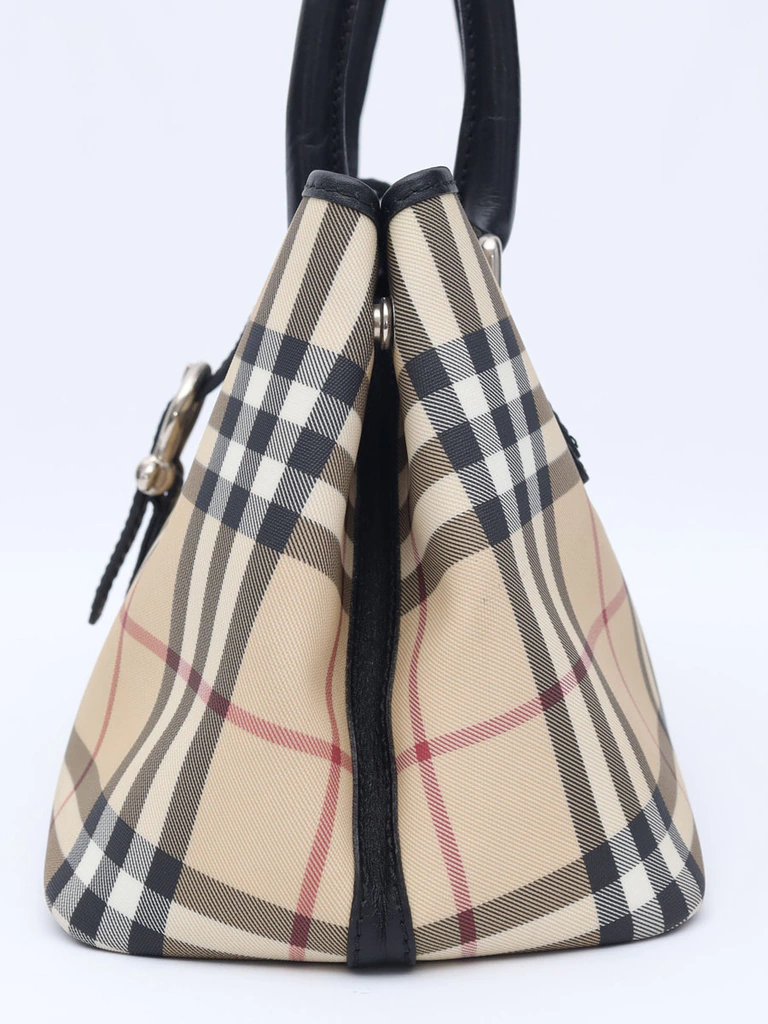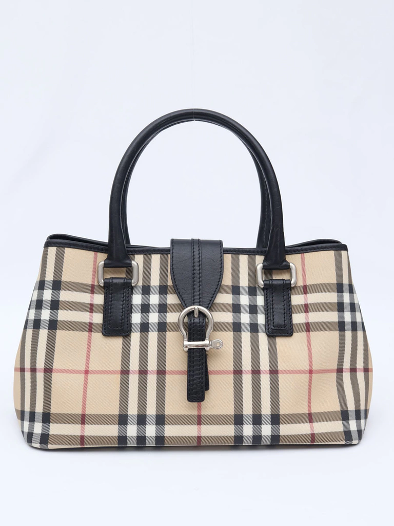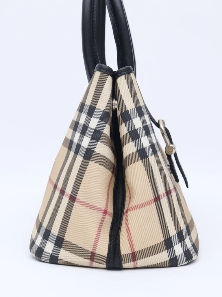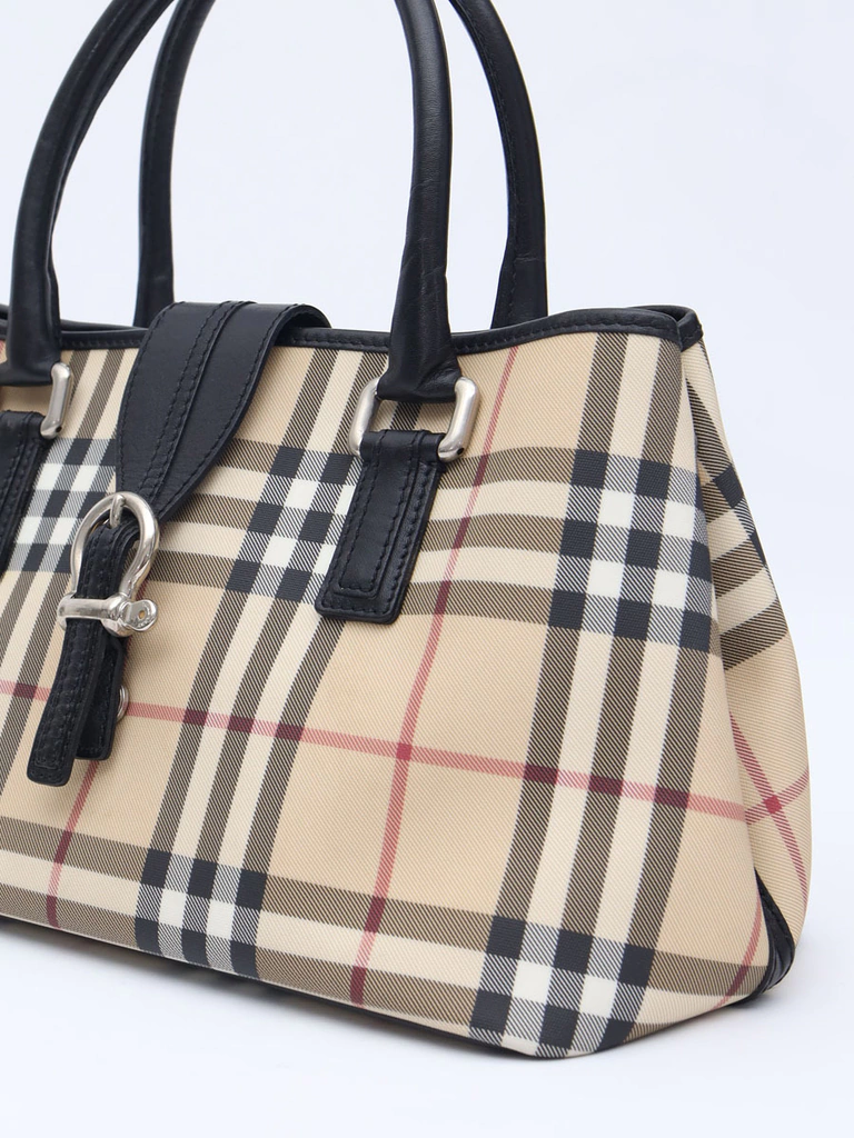 A autêntica Bolsa Burberry Classic Nova Check é uma excelente opção de bolsa média, charmosa e elegante. Com estampa clássica xadrez "Nova Check" em lona sintética de alta durabilidade "canvas" e detalhes em couro preto, possui botões laterais para expansão da capacidade de armazenamento e abertura superior com fechamento através de uma aba de couro com uma fivela decorativa e fecho magnético oculto.