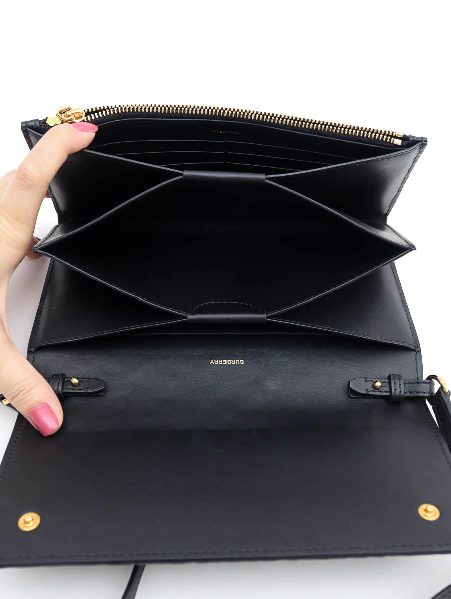A Bolsa Original Burberry Hazelmere Wallet on Strap é um acessório sofisticado e funcional, ideal para eventos especiais ou saídas à noite. Confeccionada em couro com logos em relevo estampado, apresenta um design elegante com abertura flap que revela um interior bem organizado. Possui compartimentos abertos, um deles com fechamento em zíper, além de 8 slots para cartões, garantindo praticidade no tamanho compacto.