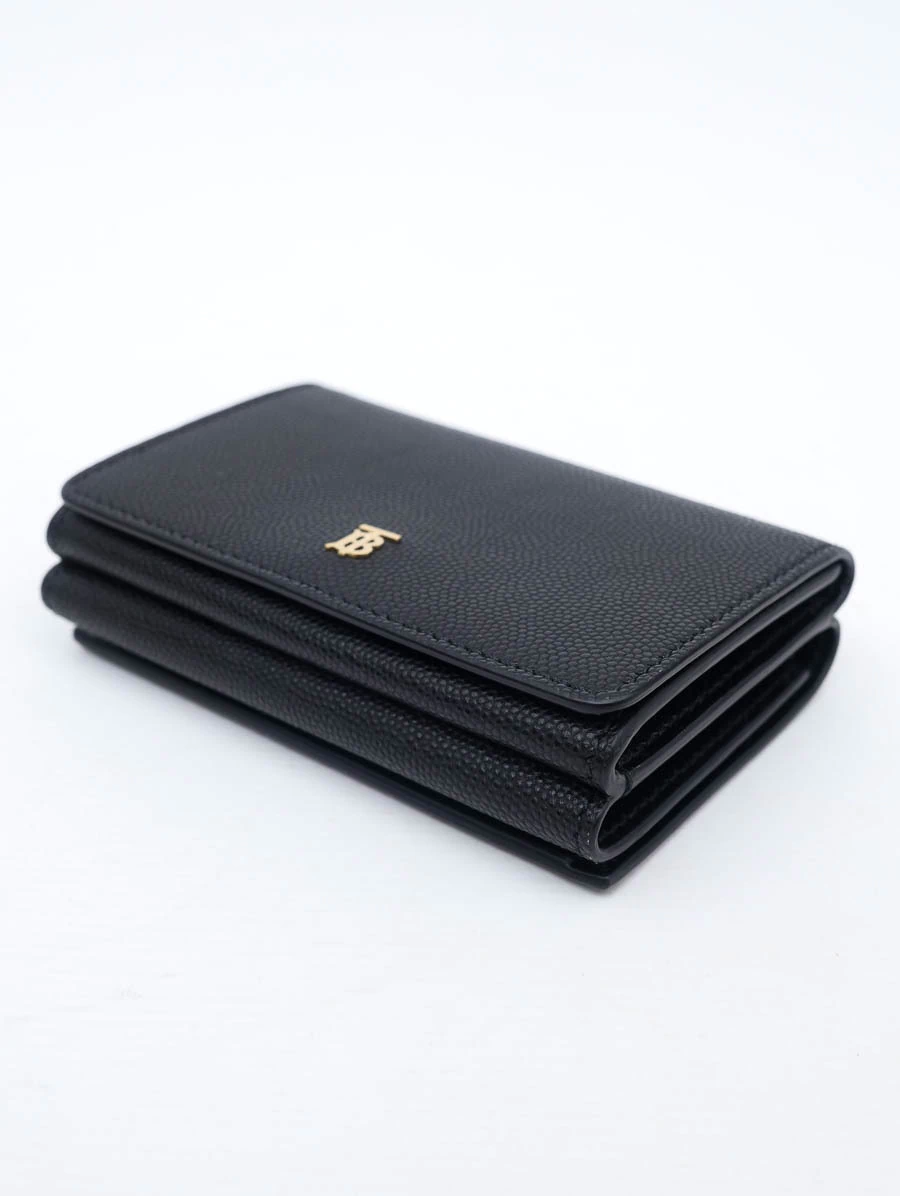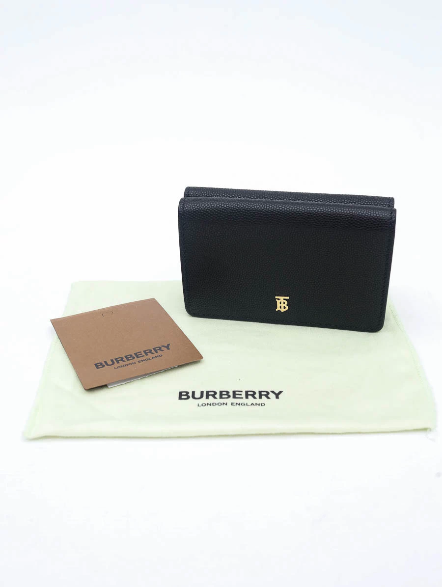 O destaque fica por conta do icônico monograma "TB" dourado na frente, uma homenagem ao fundador da Burberry, Thomas Burberry. Este detalhe refinado adiciona um toque luxuoso ao design minimalista da carteira.