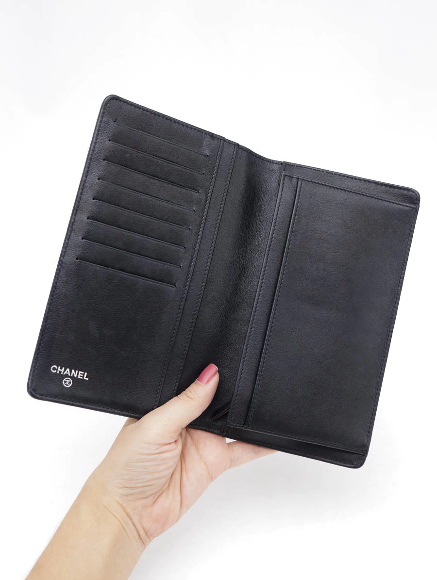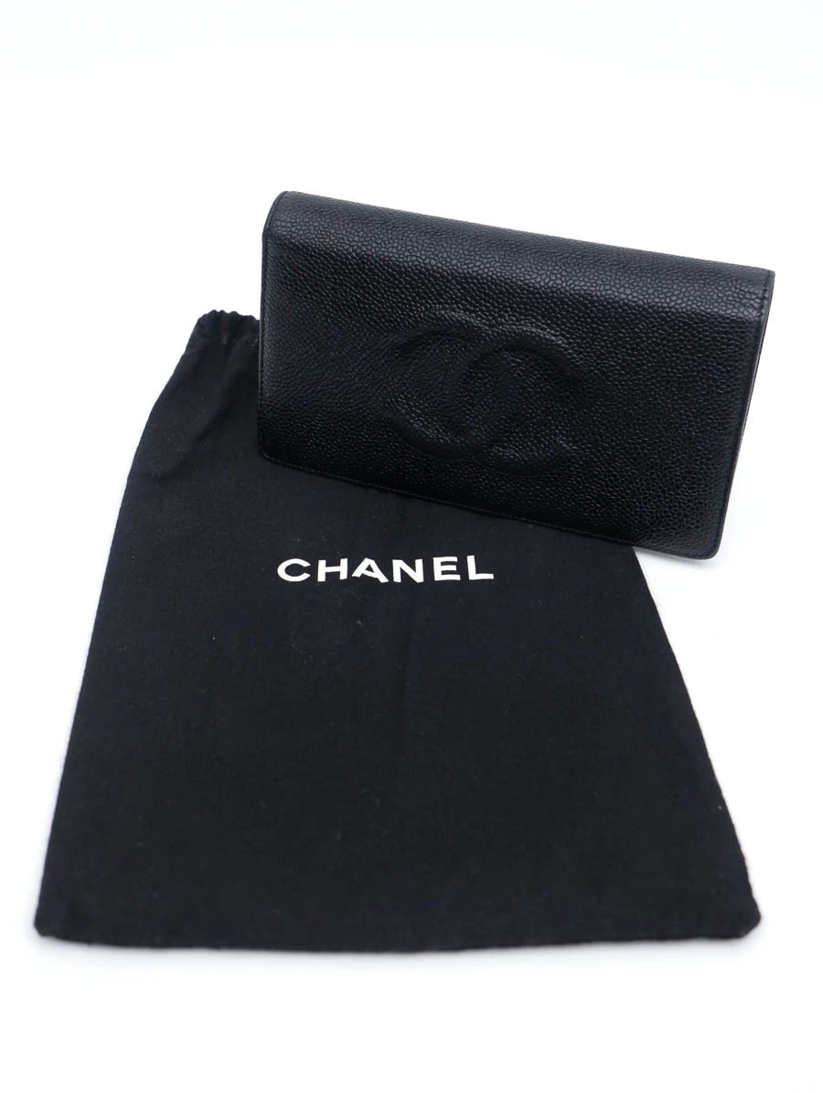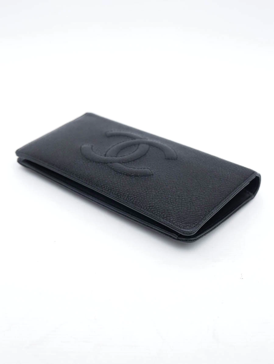 Carteira Original Chanel L-Yen Caviar Preto produzida em couro e logo da amrca em alto relevo na parte frontal. Apresenta cinco compartimentos, sendo um deles com fechamento por zíper e 8 divisórias para cartões.