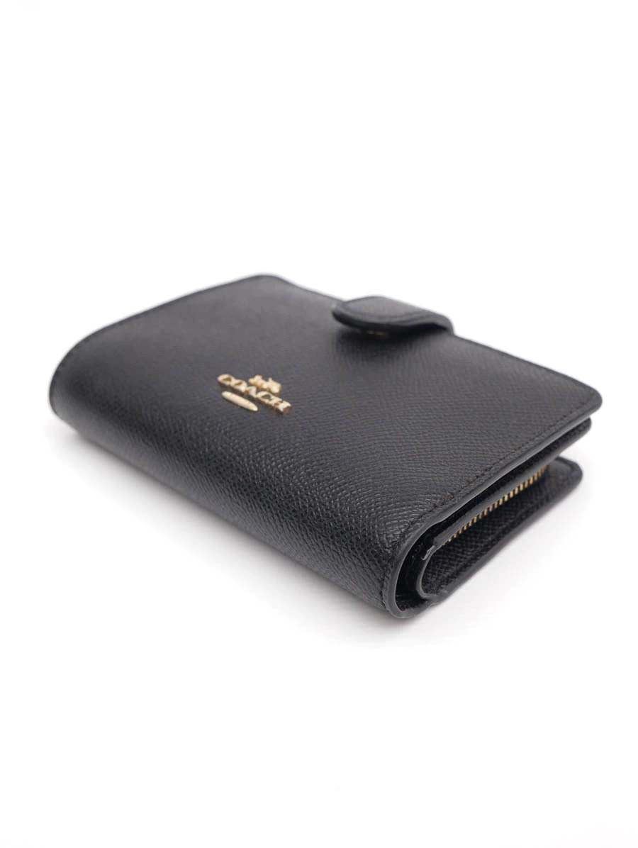 Carteira Coach Preta produzida em couro granulado na cor preta e ferragens douradas. Apresenta abertura por fecho de pressão, três compartimentos, um bolso com zíper e 8 divisórias para cartões.