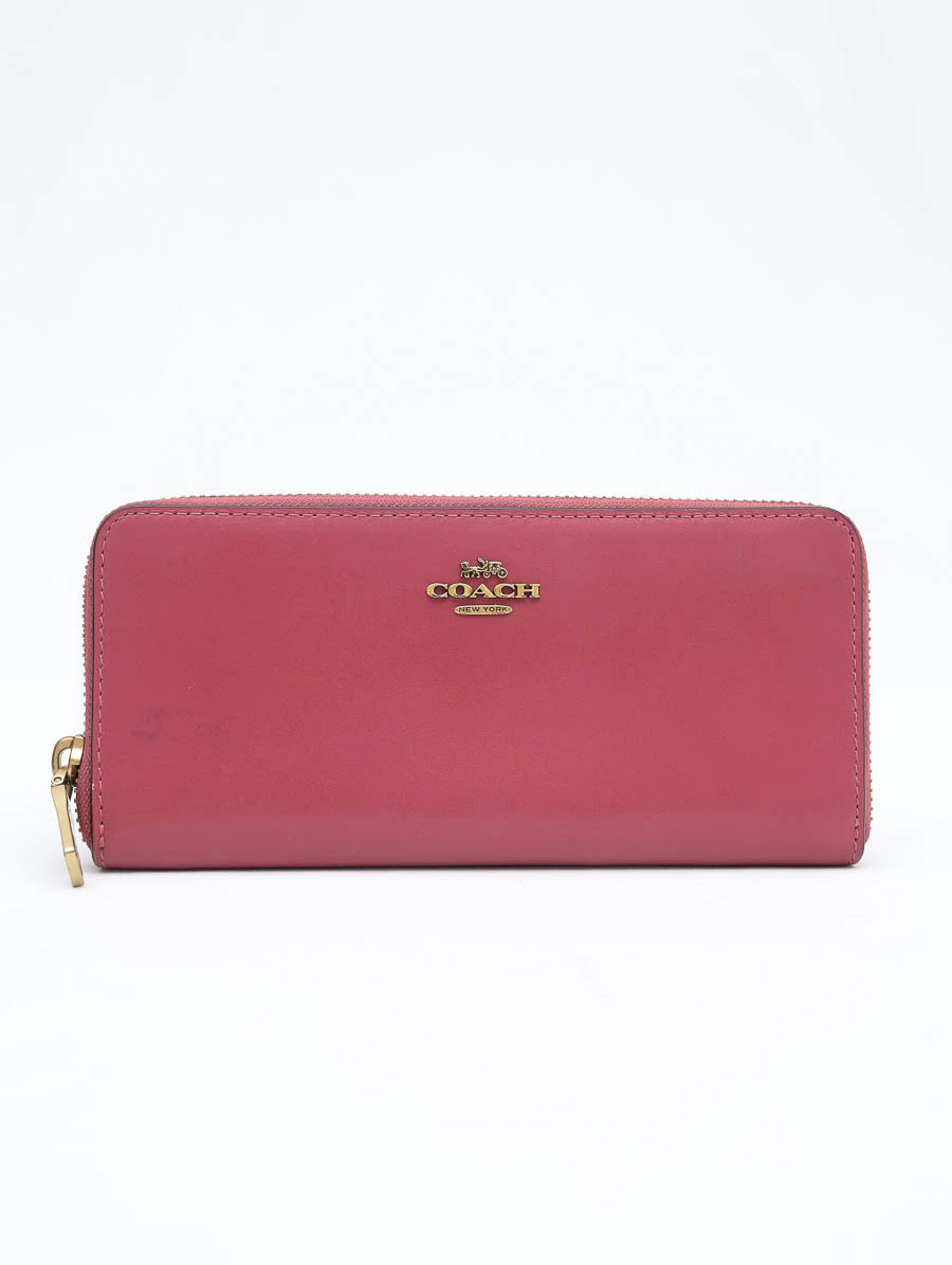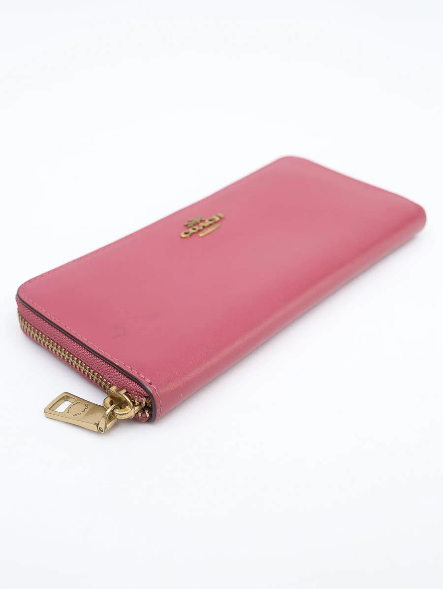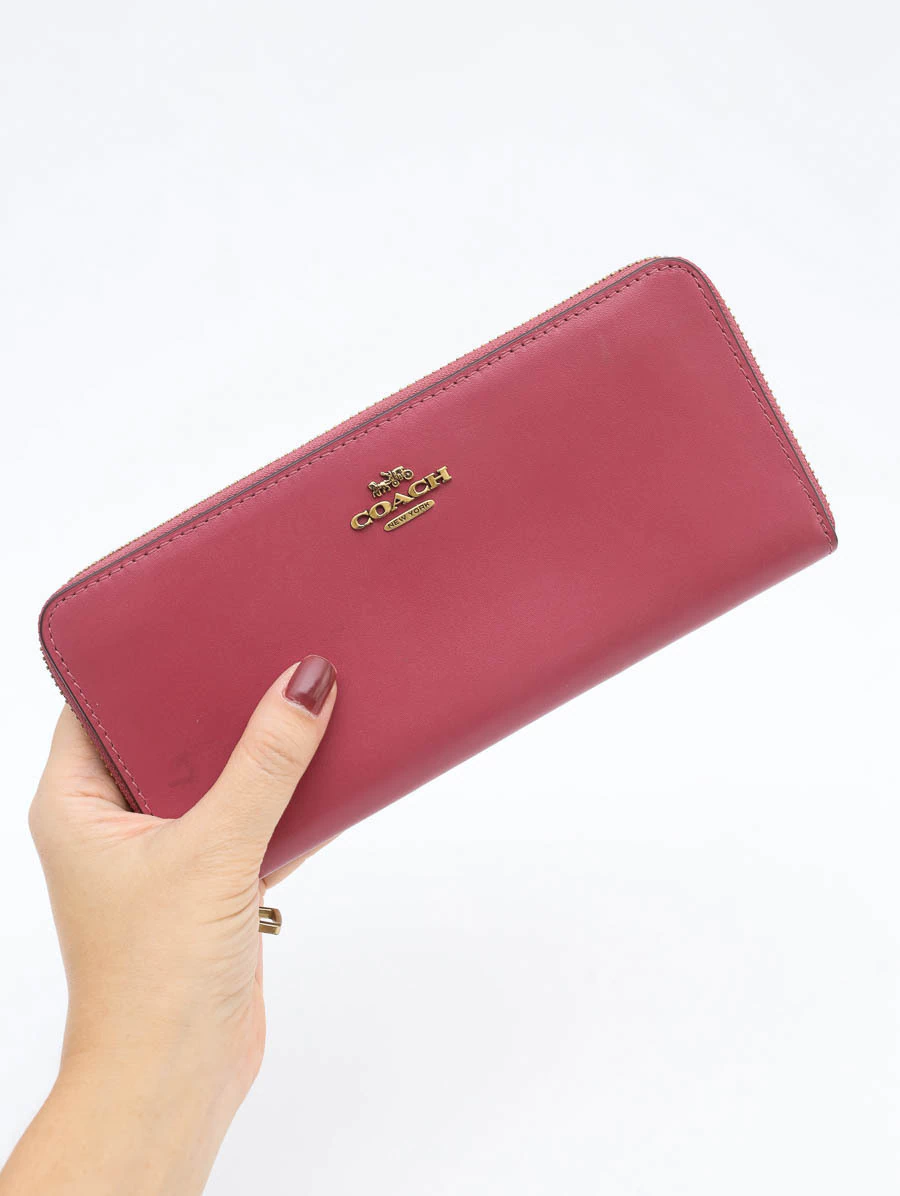 Carteira Coach Slim Accordion Zip produzida em couro na cor rosa queimado e metais dourados. Apresenta abertura por zíper, interior com cinco compartimentos sendo o central com zíper e 8 divisórias para cartões.