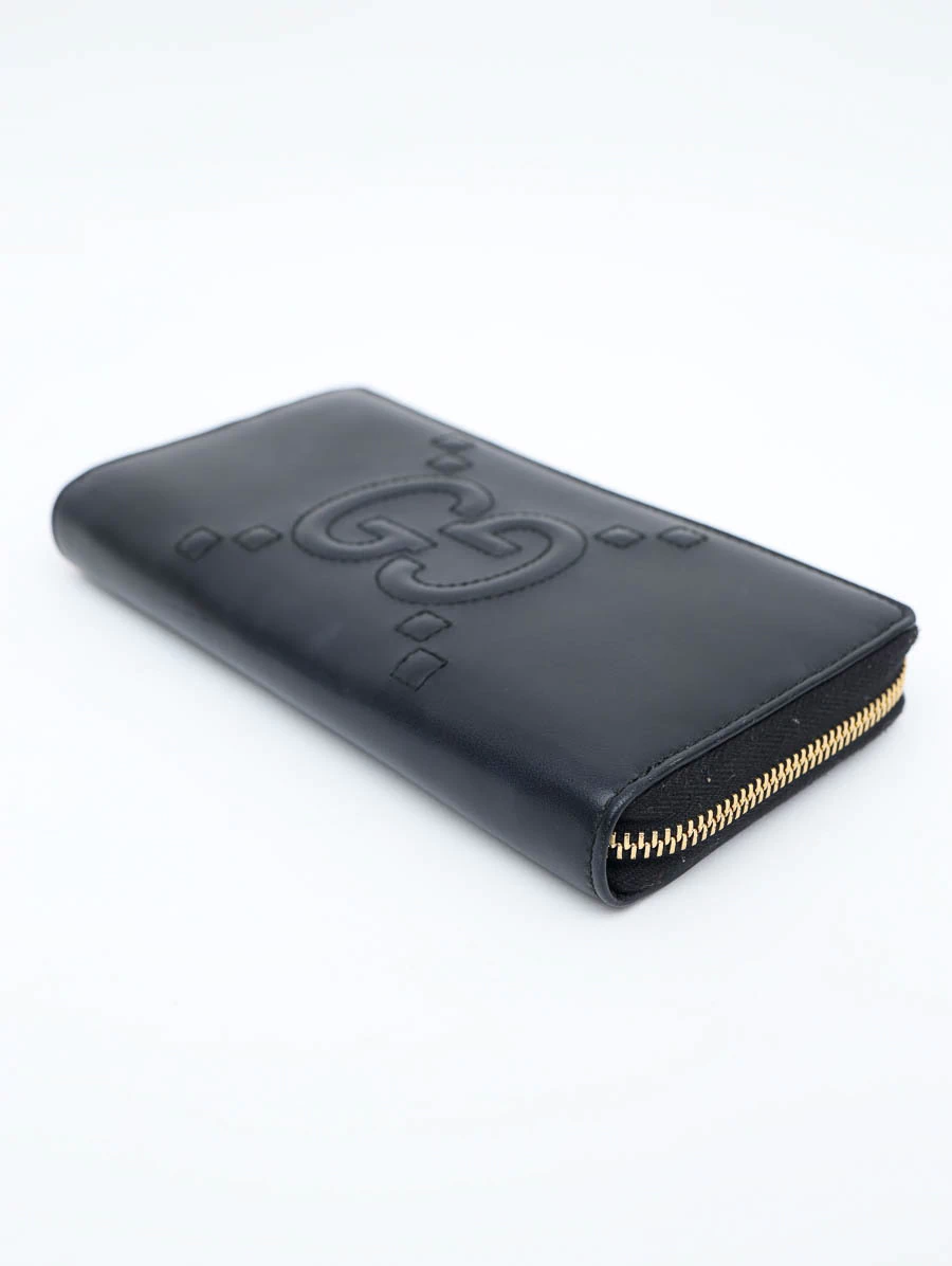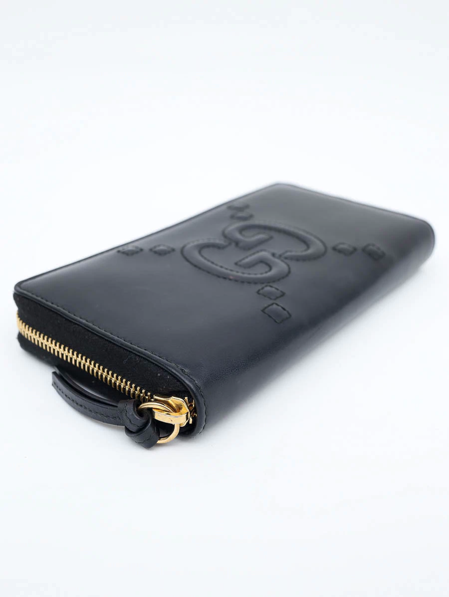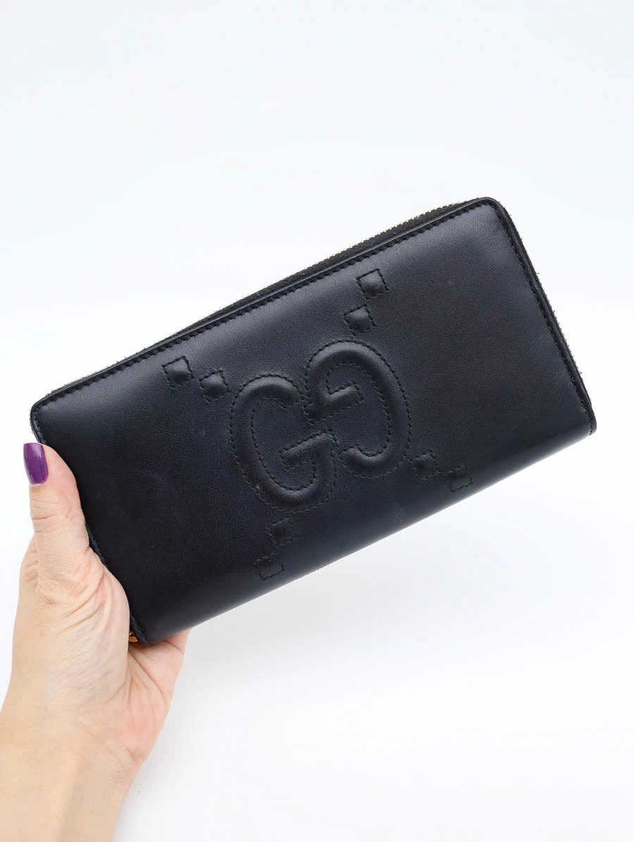 Carteira Original Gucci GG Black Leather produzida em couro liso com as letras GG invertidas da marca na parte frontal, abertura com zíper e interior com três compartimentos e 12 slots para cartões.