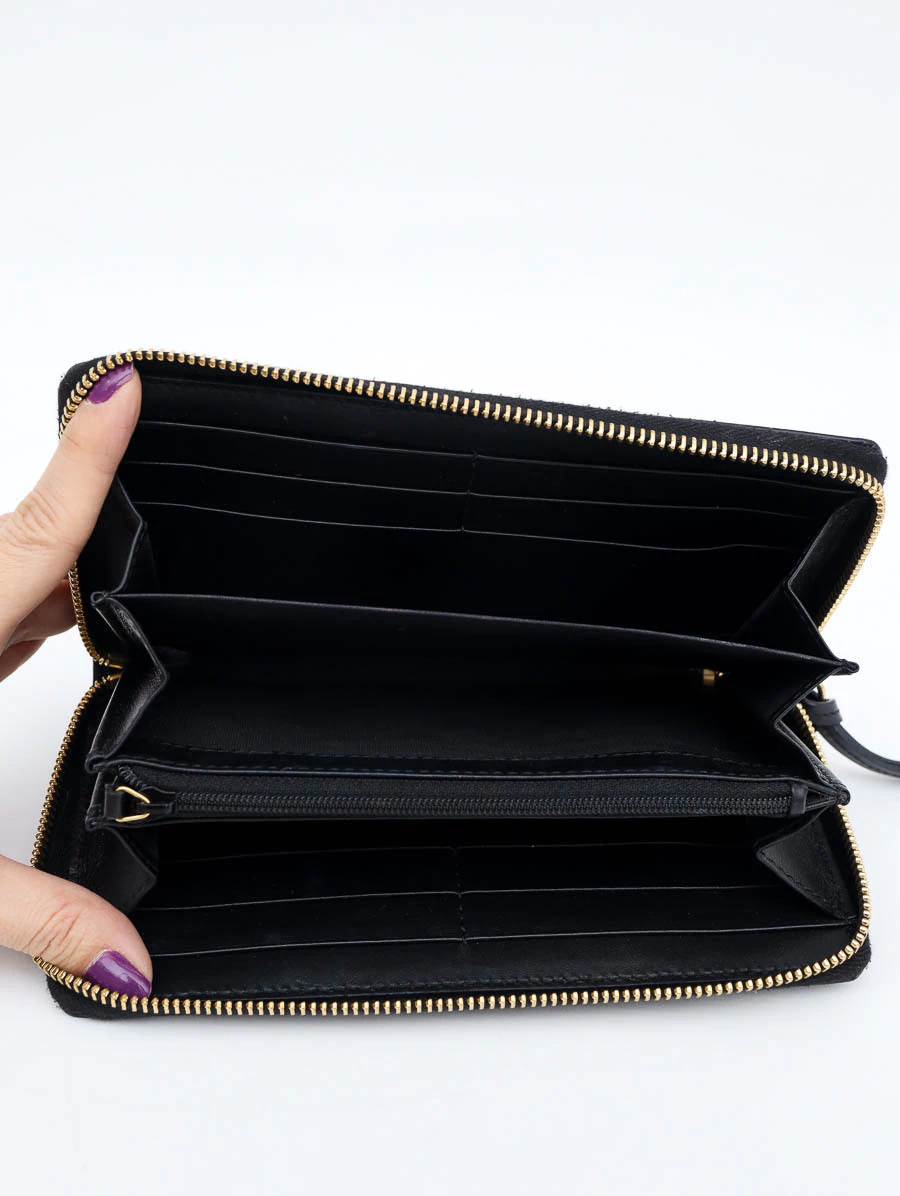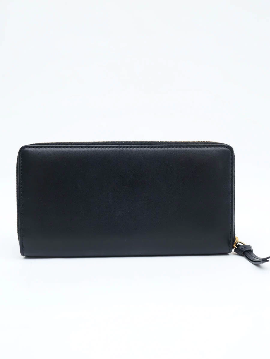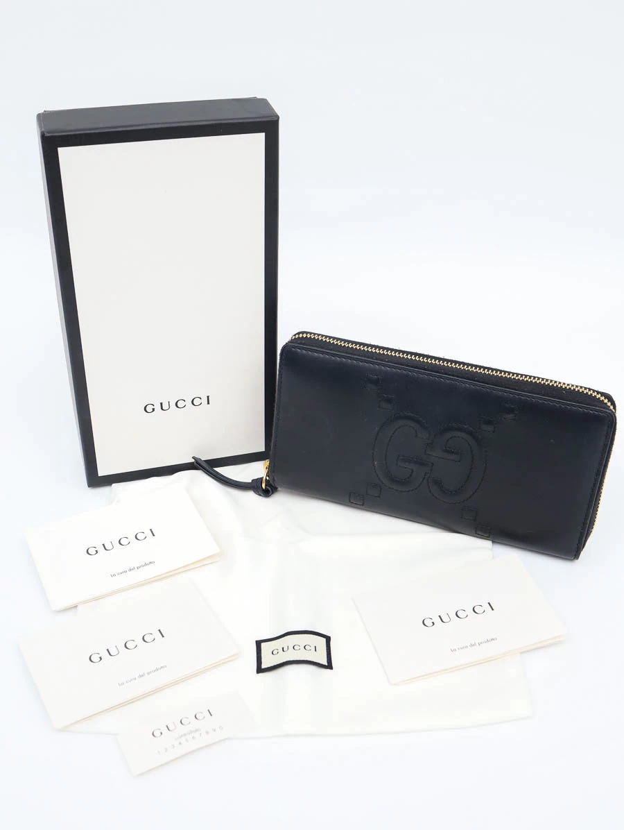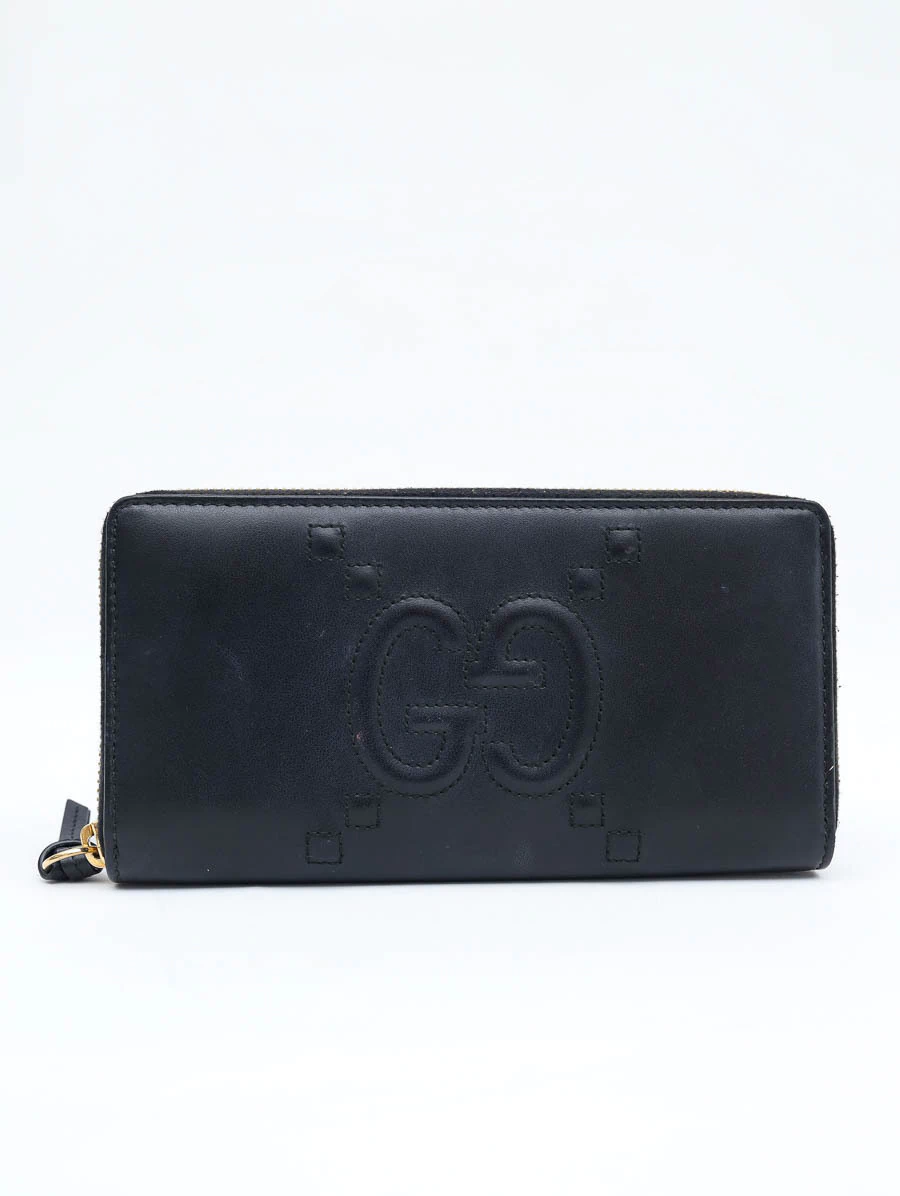 Carteira Original Gucci GG Black Leather produzida em couro liso com as letras GG invertidas da marca na parte frontal, abertura com zíper e interior com três compartimentos e 12 slots para cartões.
