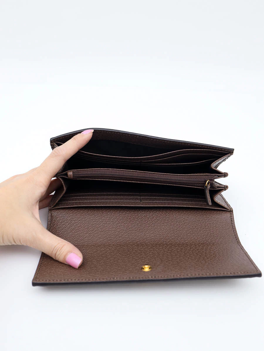 Carteira Original Gucci Ophidia produzida em material Lona Sintética Canvas com estampa monograma Gucci GG, detalhes em couro na cor marrom e uma faixa Gucci WEB em tecido na cor verde e vermelha. Apresenta abertura por fecho de encaixe, 4 compartimentos abertos e um com zíper e 12 slots para cartões.