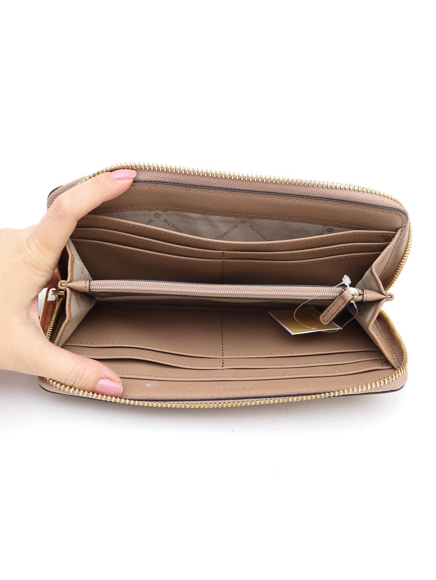 A Carteira Jet Set Travel Média de Couro Bege da Michael Kors é a definição de elegância funcional. Confeccionada em couro Saffiano bege, combina durabilidade com um design sofisticado e atemporal. O logo da marca em metal dourado na parte frontal adiciona um toque de luxo discreto, enquanto seu tamanho médio oferece praticidade sem abrir mão do estilo.
