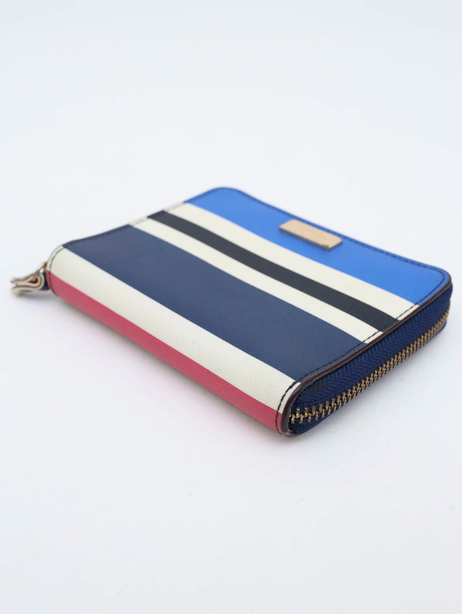 A Carteira Kate Spade Darci Laurel Way combina sofisticação e praticidade em um design compacto e moderno. Confeccionada em couro saffiano, possui estampa listrada em tons de azul, preto, branco e vermelho que garante um visual elegante e contemporâneo.