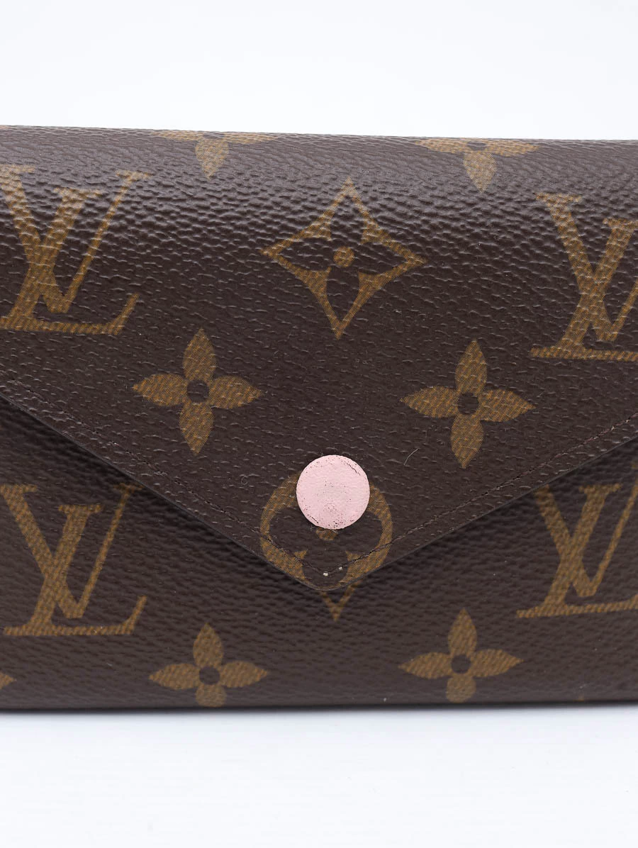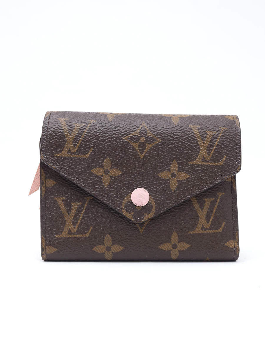 Carteira Original Seminova Louis Vuitton Victorine confeccionada em canvas com estampa monograma, abertura com fecho de encaixe rosa, interior também em rosa com 4 compartimentos, sen do um com zíper e 6 slots para cartão.