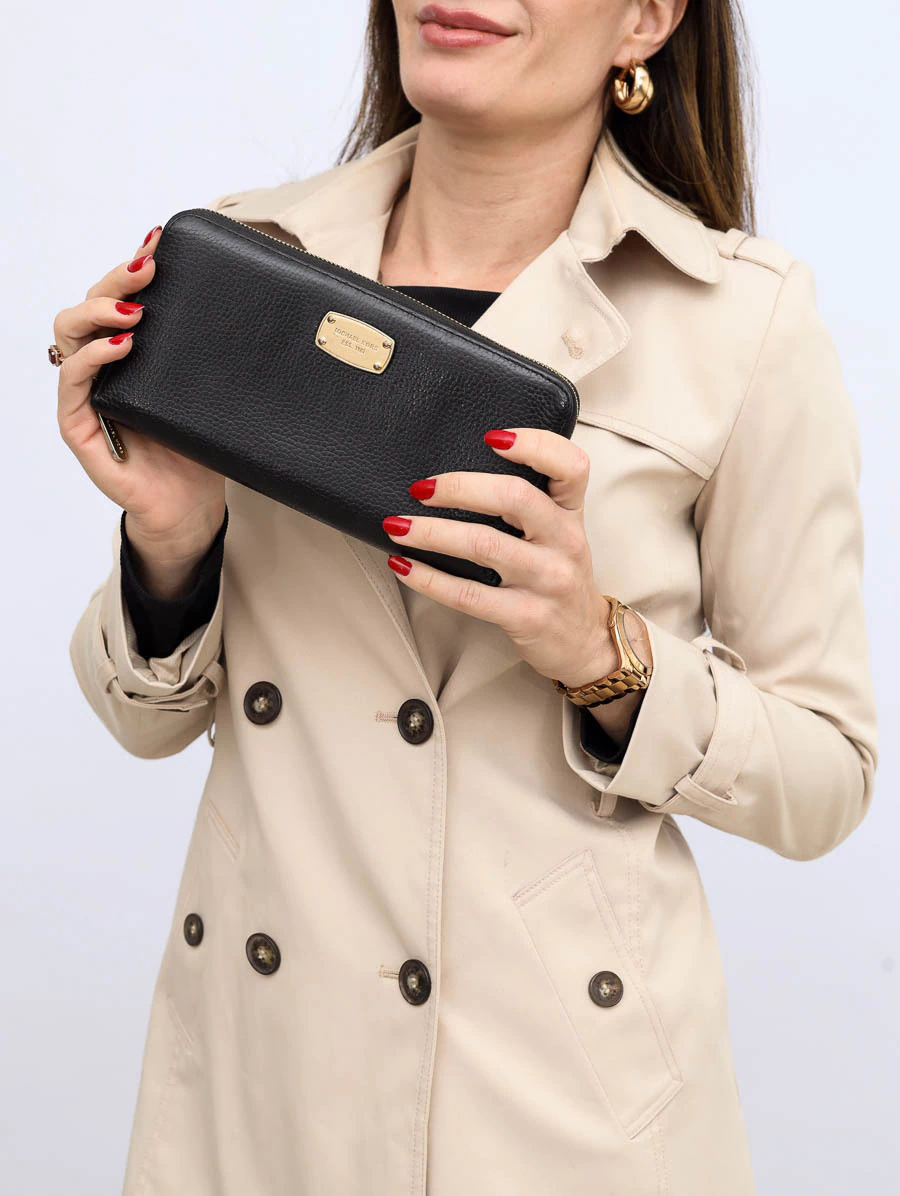 Carteira Original Seminova Michael Kors Jet Set Preta confeccionada em couro com textura granulada na cor preta, abertura com zíper a redor da carteira, 14 slots para cartões, 5 compartimentos internos, sendo um com zíper, mais 6 slots para cartões e um porta documentos.