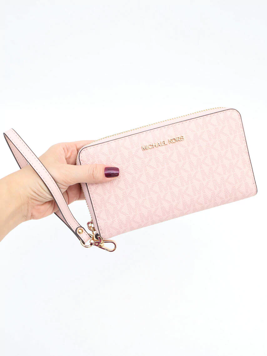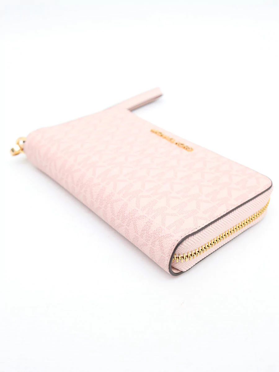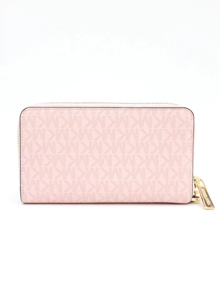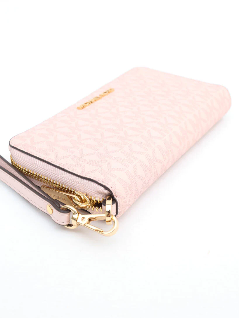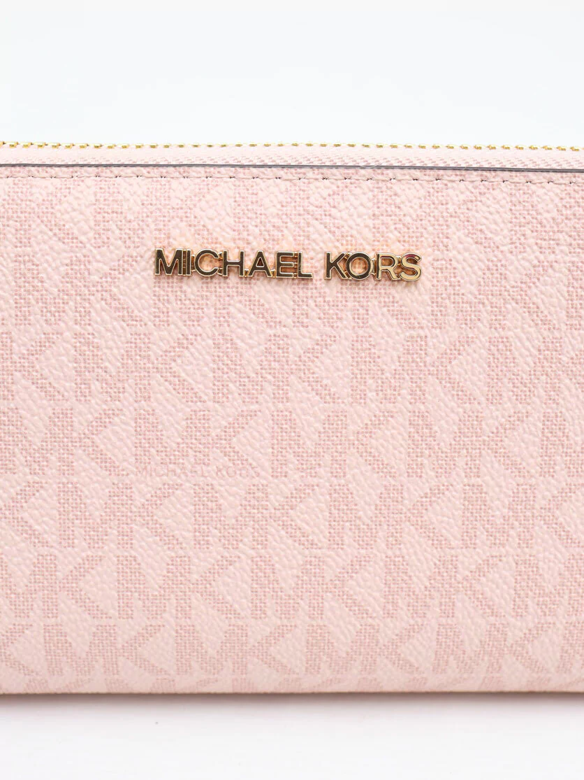 Carteira Michael Kors Jet Set Travel Monograma produzida em material canvas e couro na cor rosa. Apresenta fechamento com zíper, divisórias para colocar cartões, uma divisória com visor transparente para documento e uma com zíper. Possui ferragens douradas, alça pequena removível e logo Michael Kors na frente da carteira.
