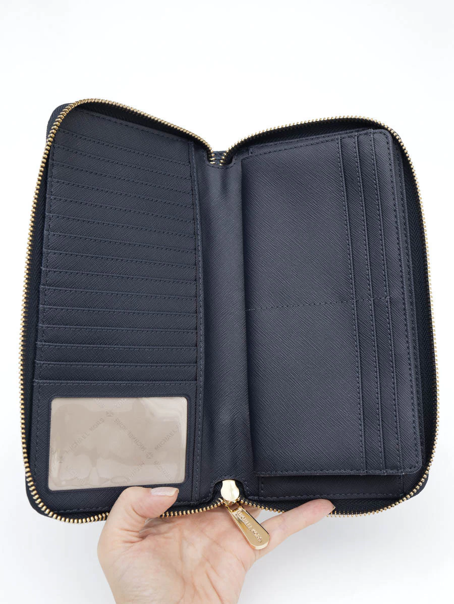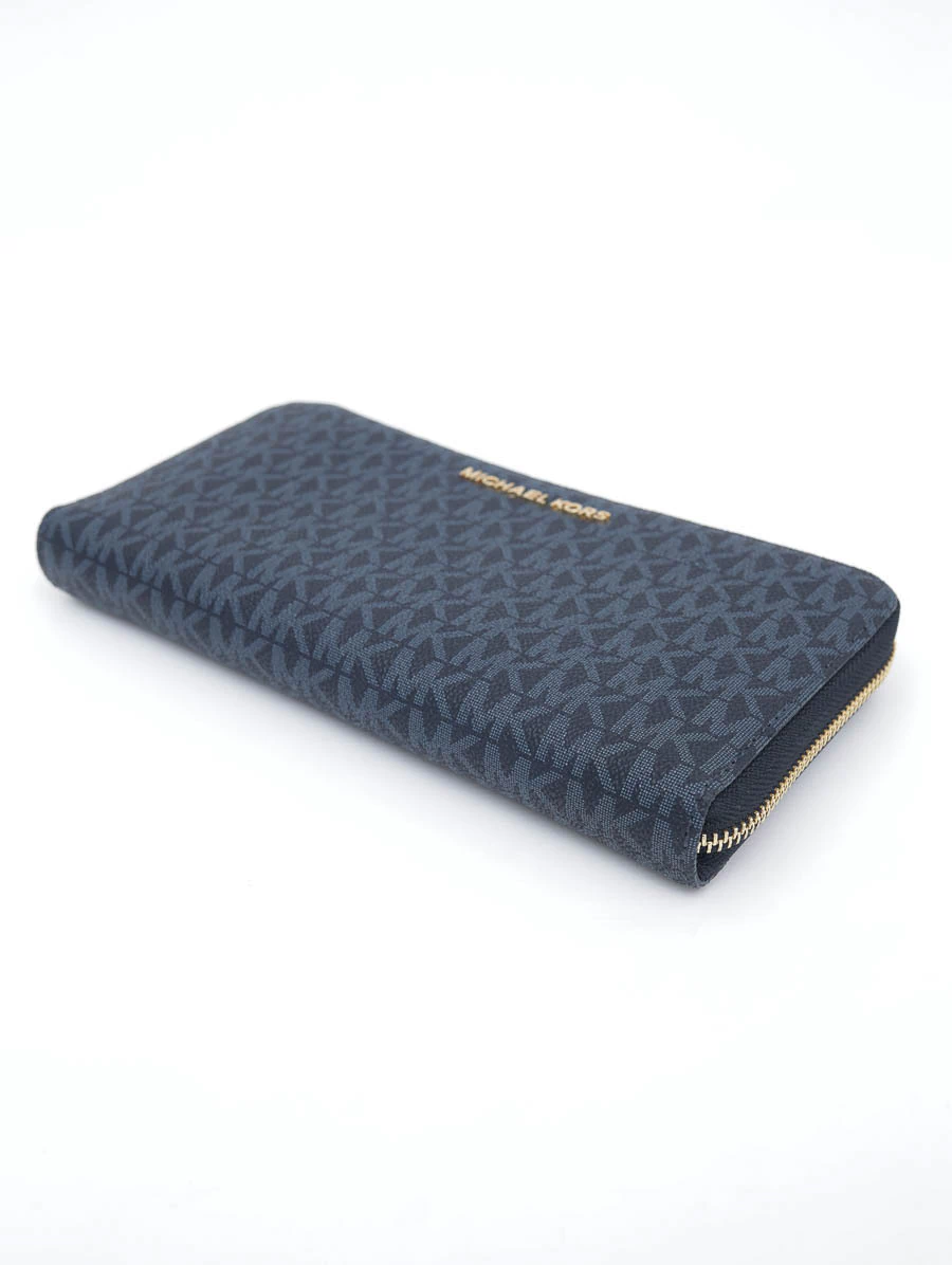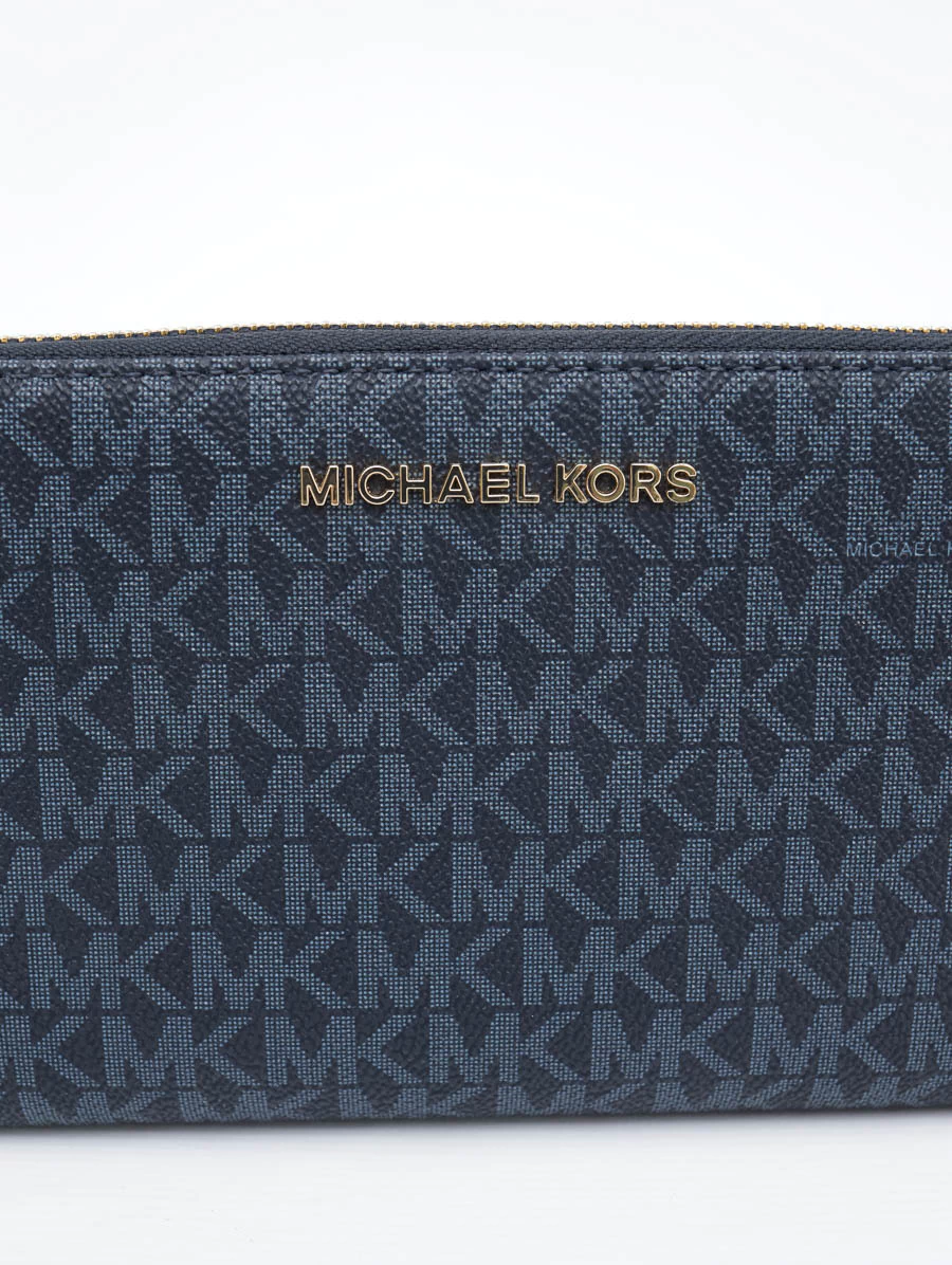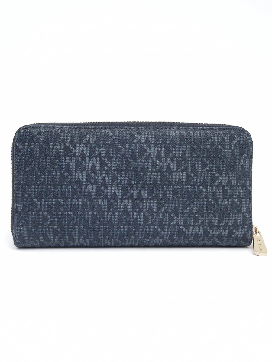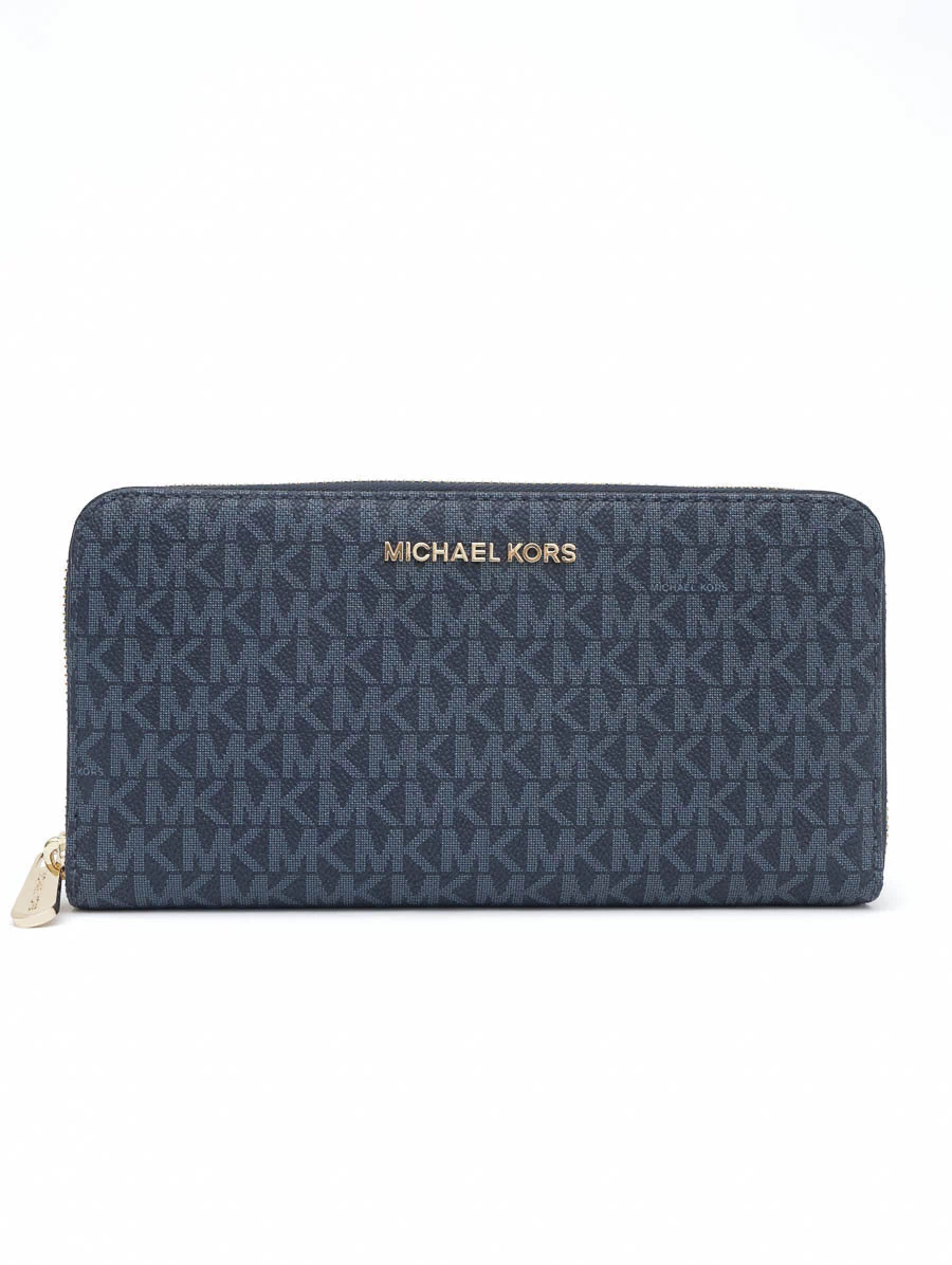 Carteira Michael Kors Large Monogram produzida em canvas com estampa MK na cor azul marinho e ferragens douradas. Apresenta abertura por com zíper, interior com 20 slots para cartões, porta documento, 6 compartimentos, sendo um deles com zíper.