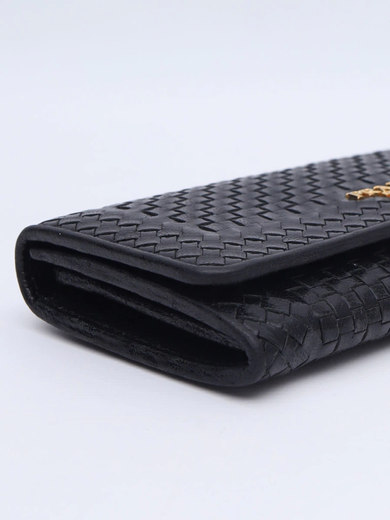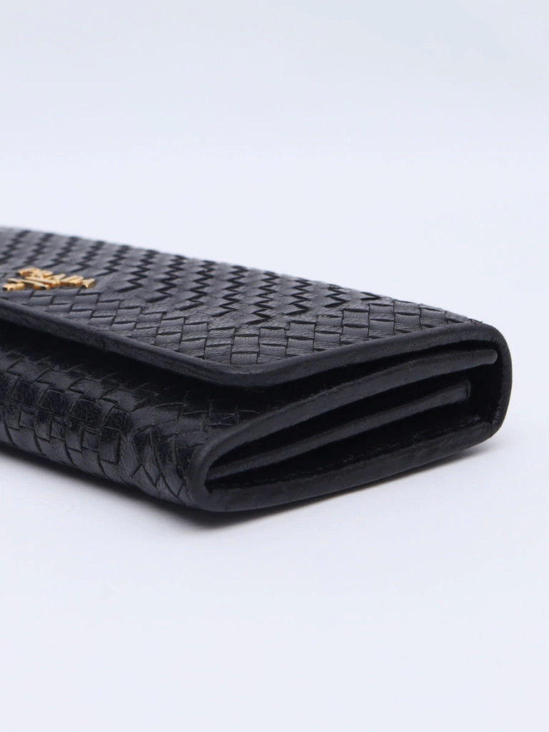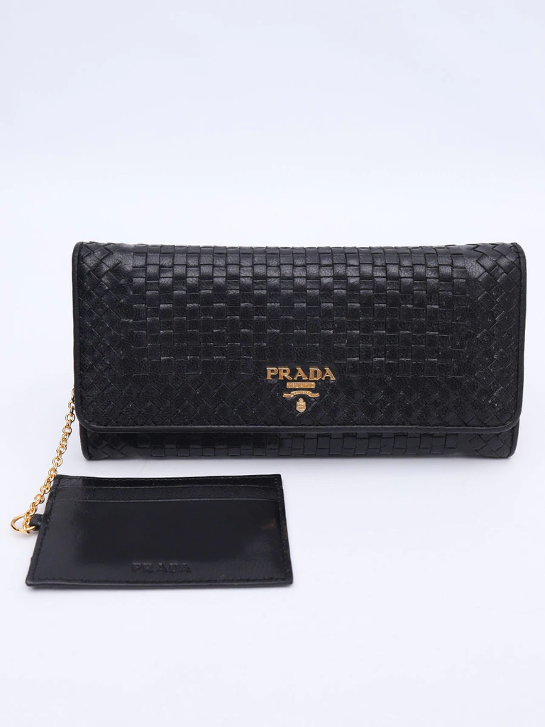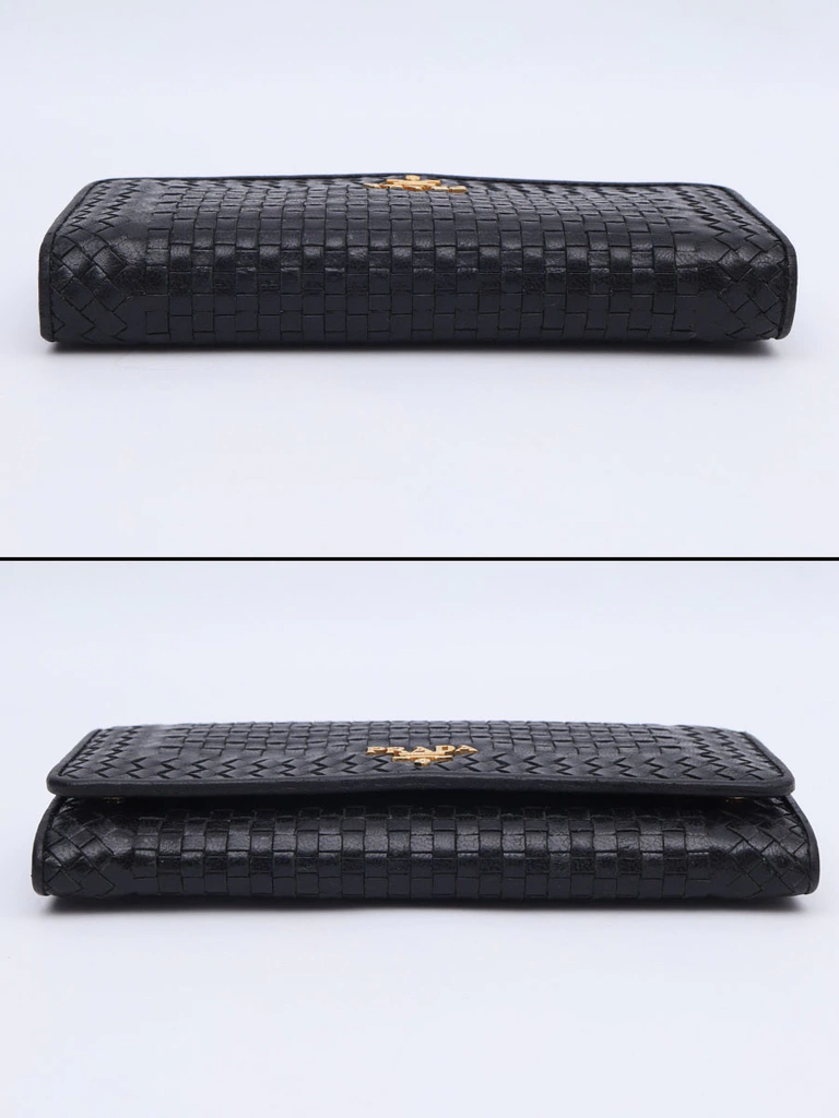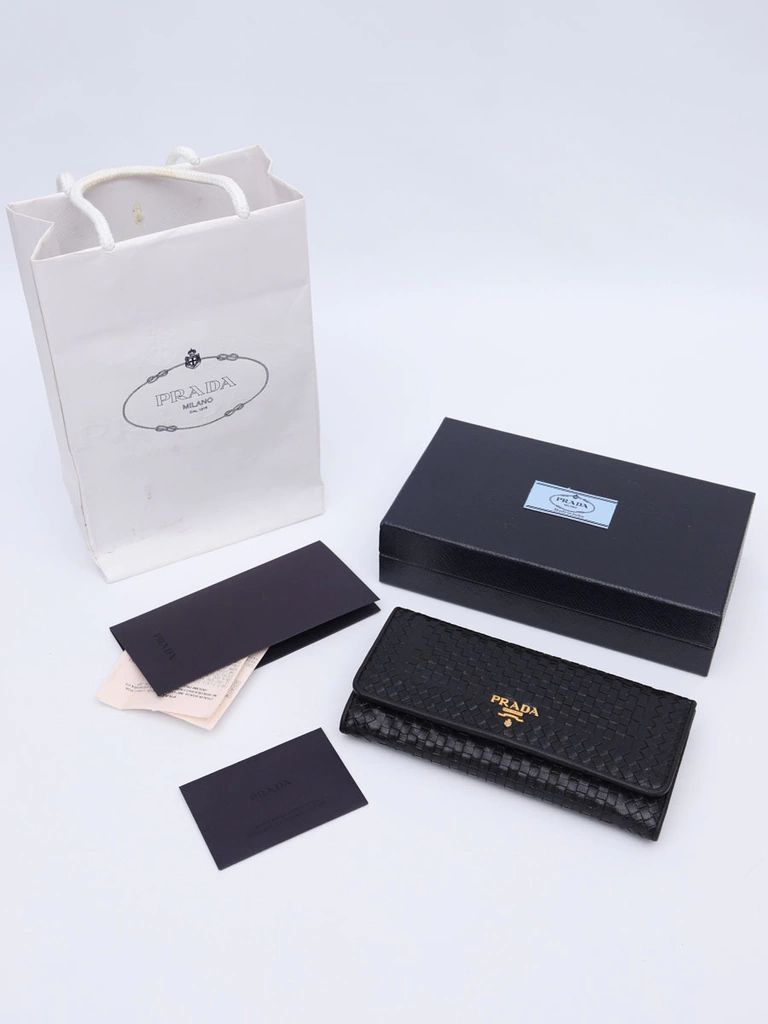 ACarteira Original Prada Madras Nero 1M1132 é produzida 100% em couro de cabra entrelaçado na corpreta. Apresenta tamanho médio, abertura "flap" com dois botões de pressão e diversos compartimentos em seu interior, perfeita para organizartodos os seus pertences: são 10 espaços para cartões, pequeno porta documento e cartões removível através de um corrente, um compartimento com zíper, dois compartimentos internos principais e dois compartimentos secundários.