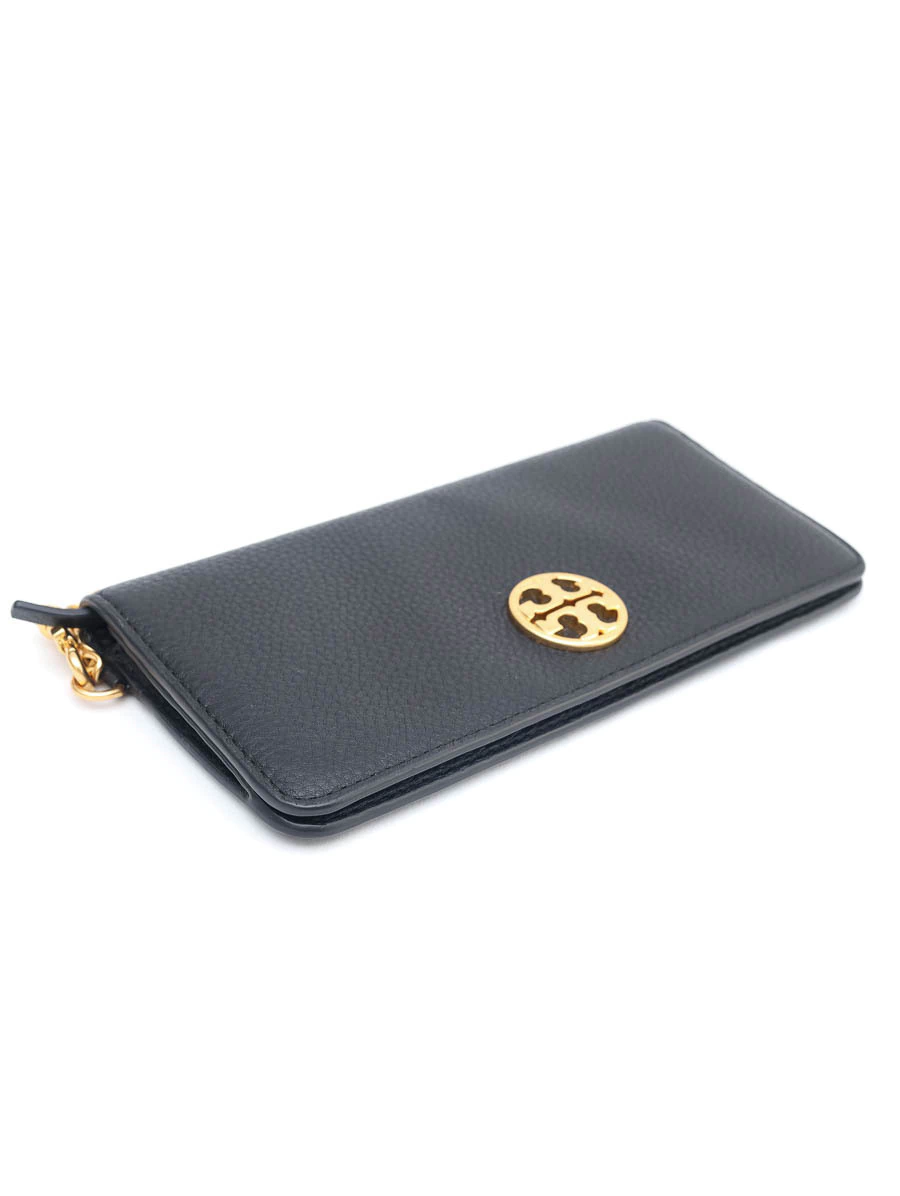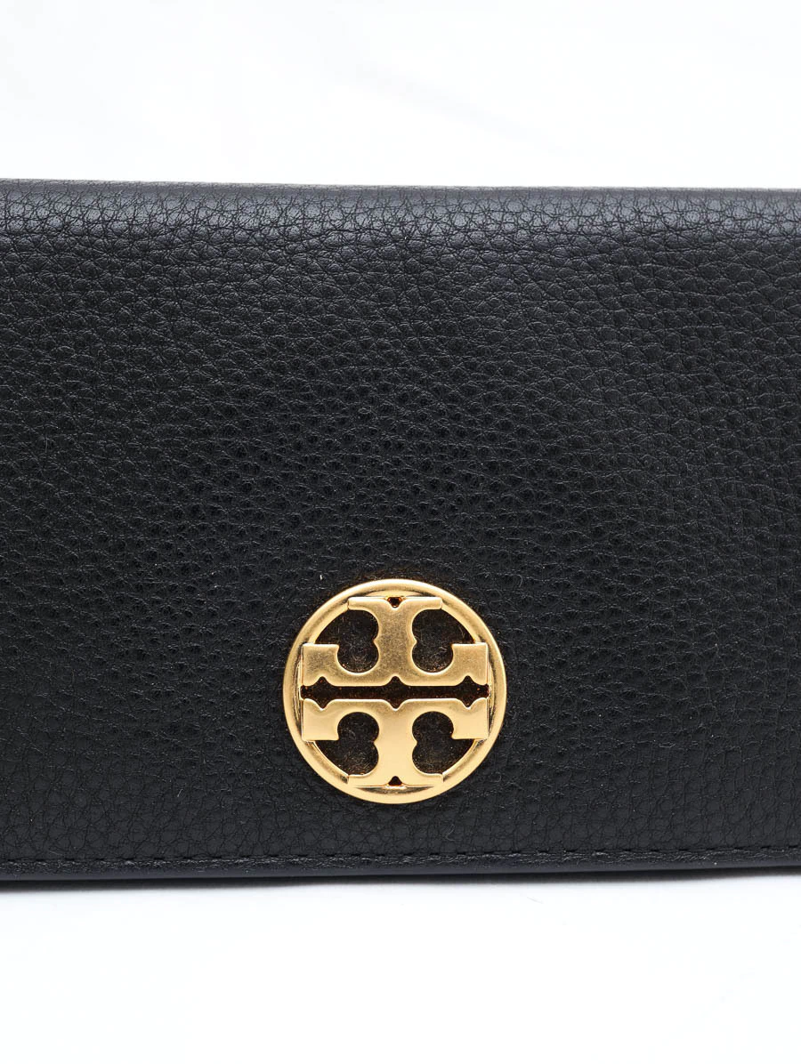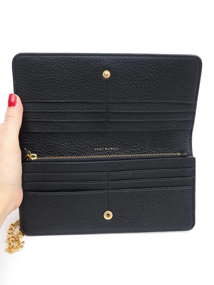 Descubra a elegância atemporal da Carteira Tory Burch Preta, ideal para organizar seus itens essenciais com estilo. Confeccionada em couro granulado de alta qualidade e adornada com ferragens douradas, como o icônico logo da marca em metal aplicado na parte frontal. A funcionalidade é elevada com uma alça de mão em corrente removível. O prático fecho magnético, discreto e eficiente, assegura um acesso rápido e seguro aos seus pertences essenciais, mantendo o design clean e minimalista da carteira quando fechada. O interior conta com três compartimentos principais e doze slots dedicados para cartões.
