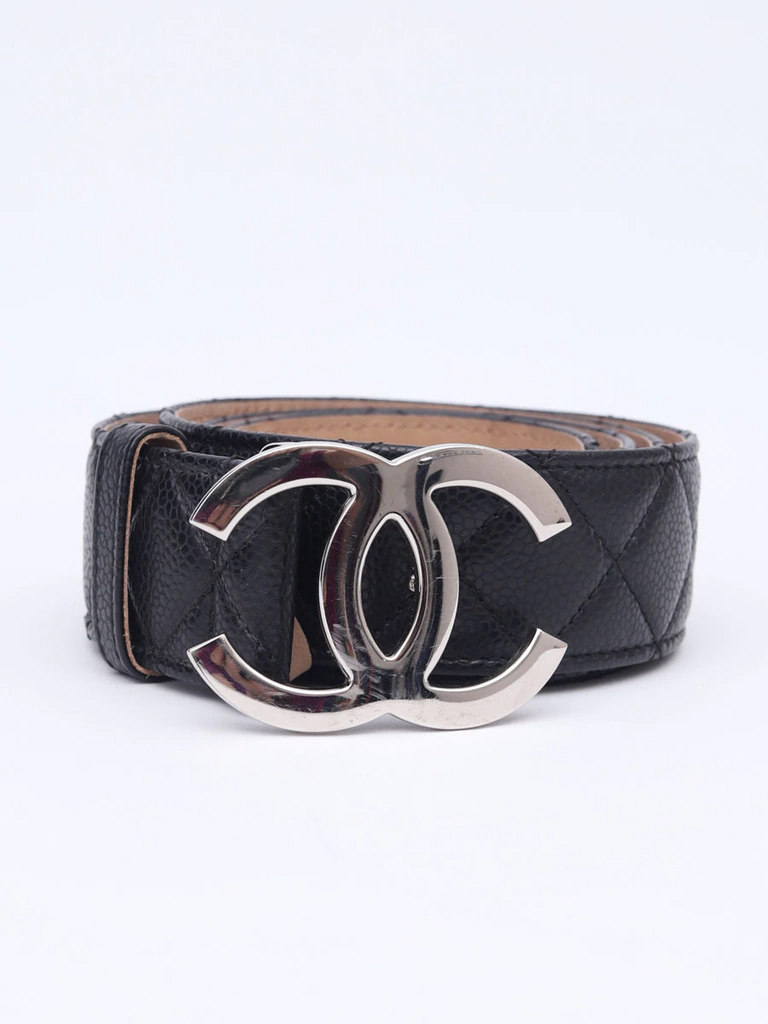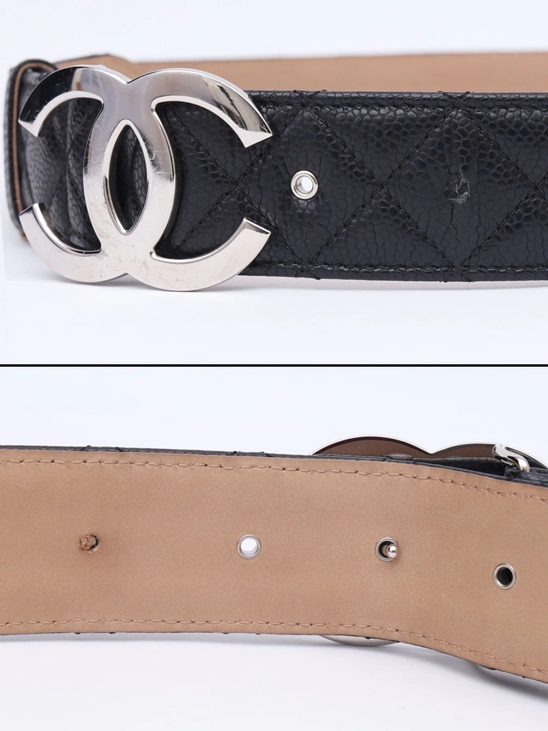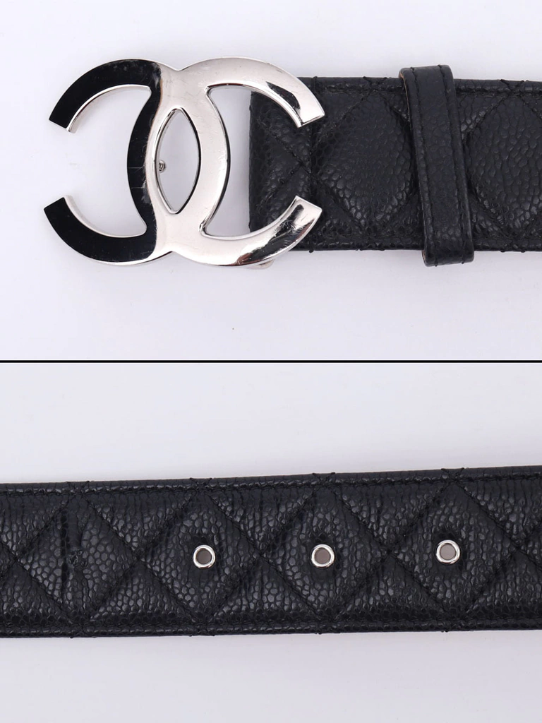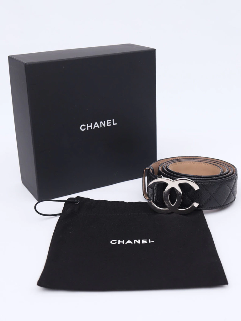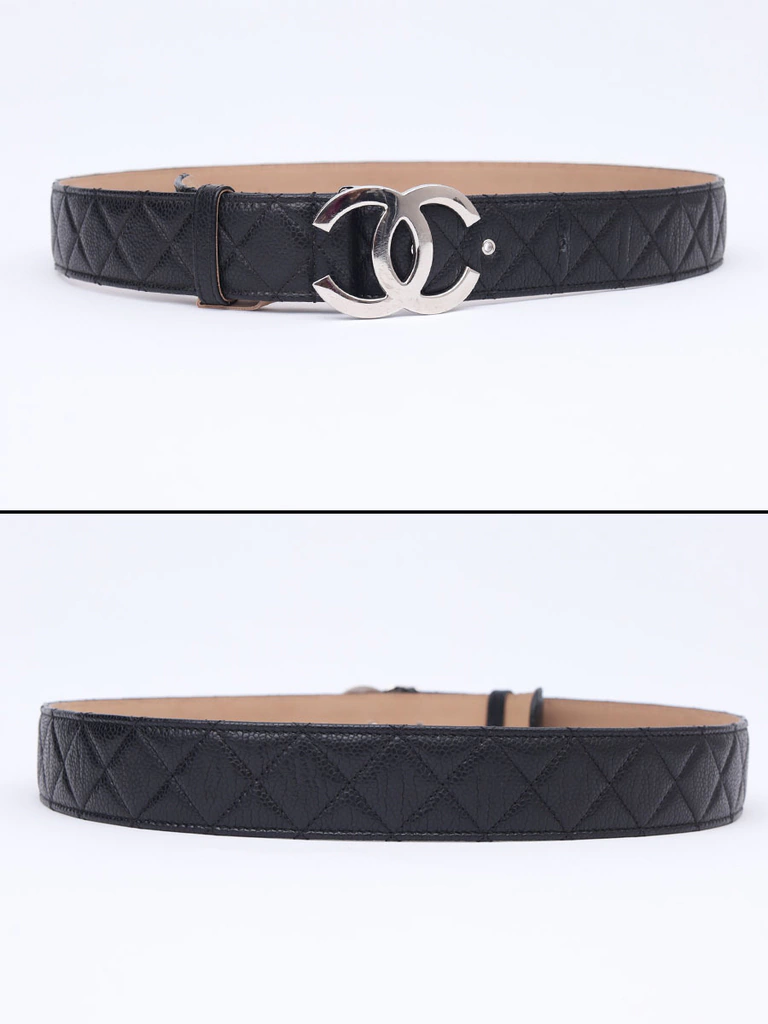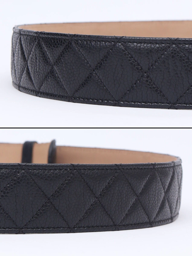 Autêntico Cinto Chanel CC Buckle no tamanho 95, produzido no couro Chanel Caviar na cor preto com pesponto no formato matelassê e fecho com pino em metal com as letras CC invertidas. Um clássico cinto da marca Chanel.