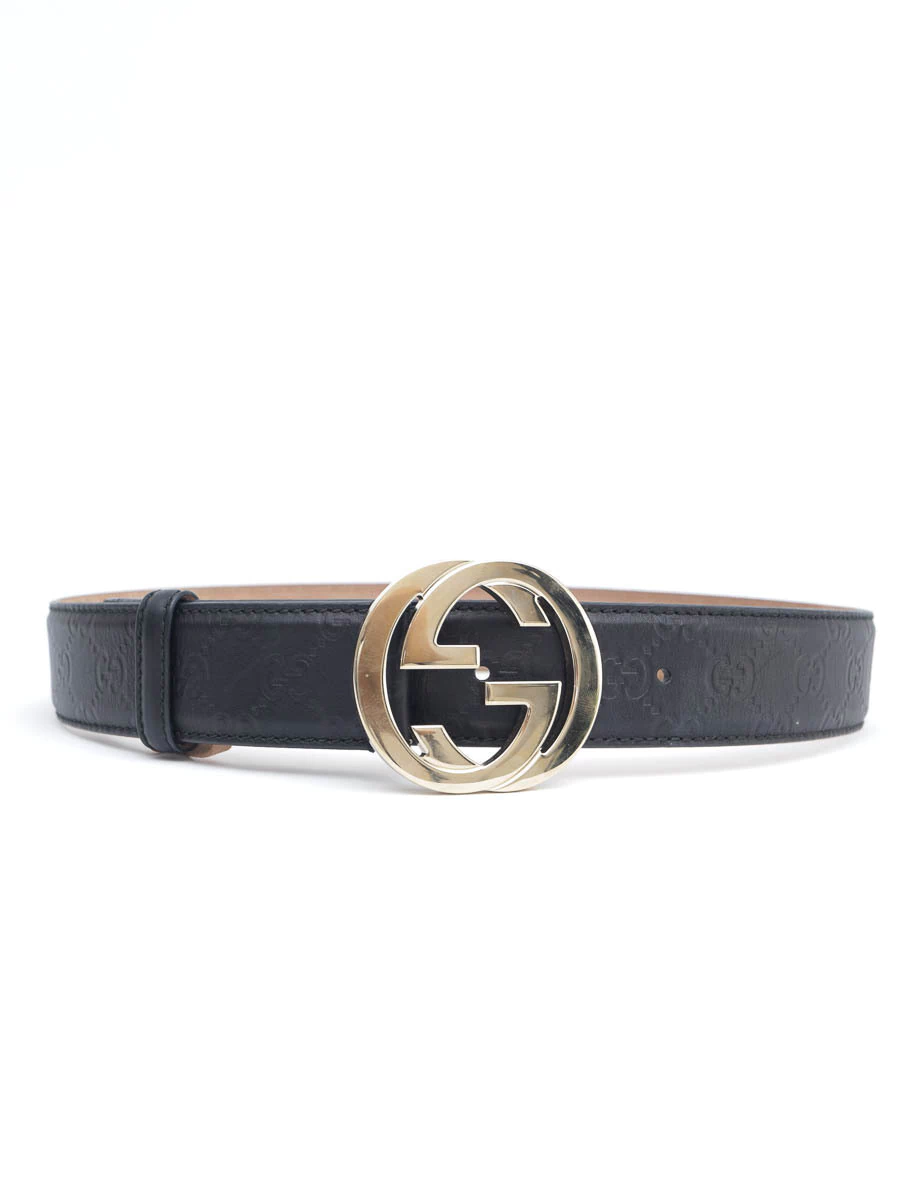 Cinto Gucci Interlocking Buckle Preto tamanho 85. Produzido em couro com relevo com estampa Gucci na cor preta e uma fivela de logotipo com as letras GG invertidas em metal com banho dourado.