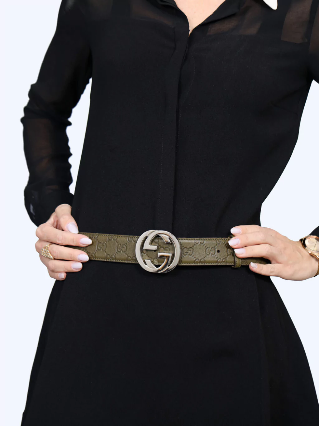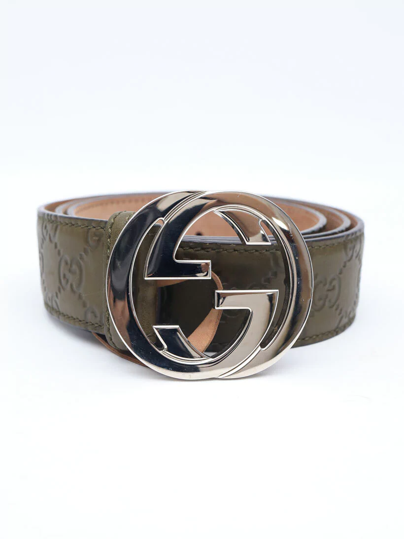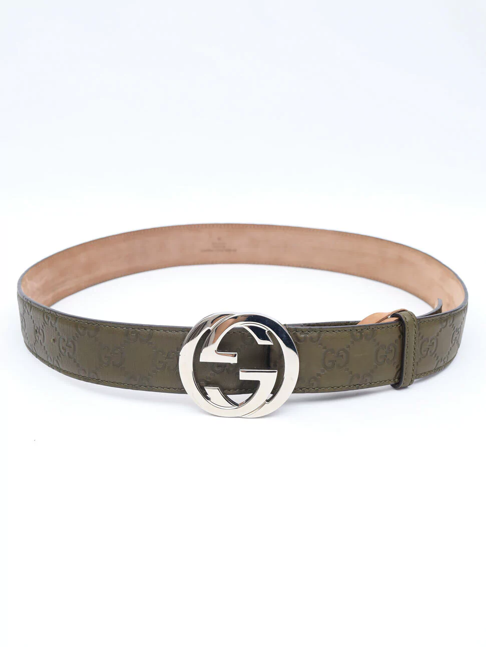 O Cinto Autêntico Gucci Interlocking Buckle tamanho 100 é perfeito qualquer ocasião. Produzido em couro com estampa em relevo na cor verde militar e uma fivela de logotipo com as letras GG invertidas em metal com banho prata.