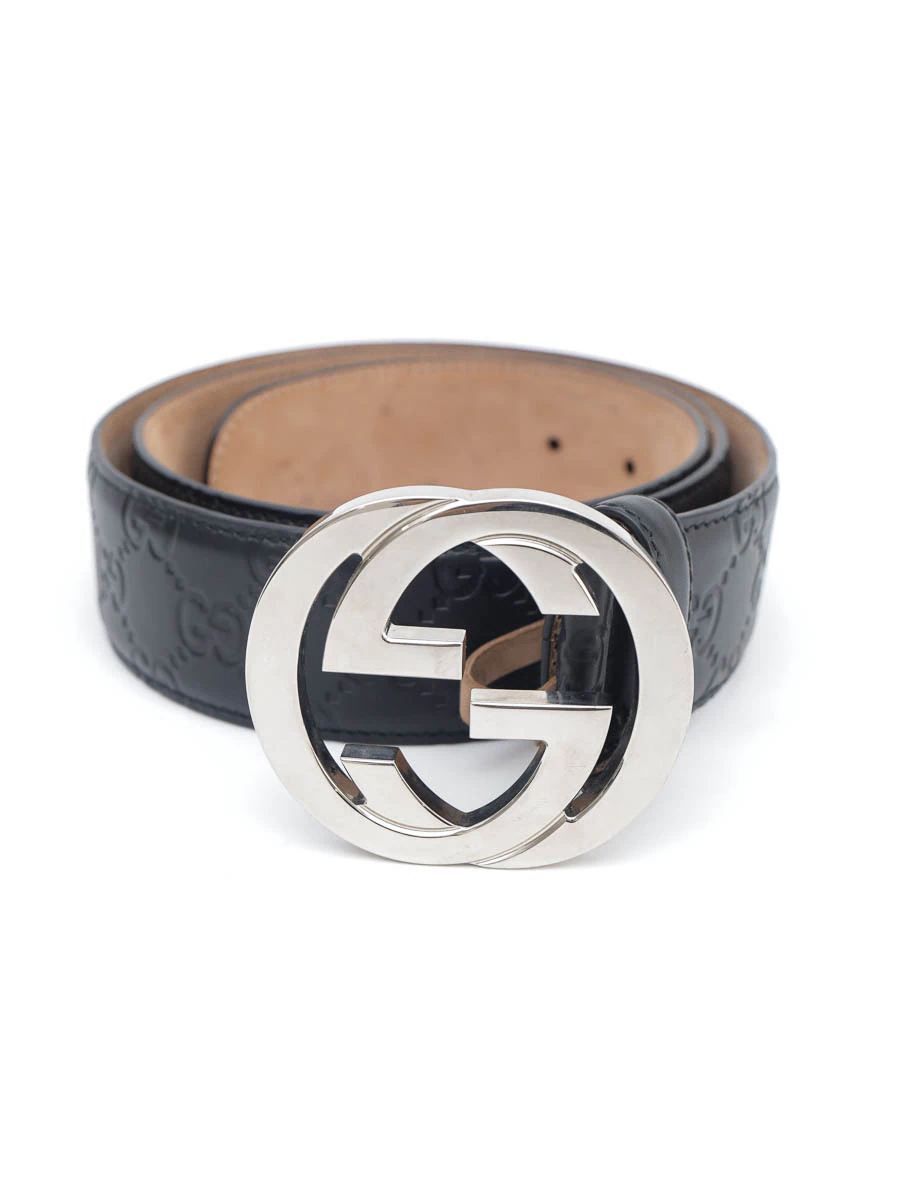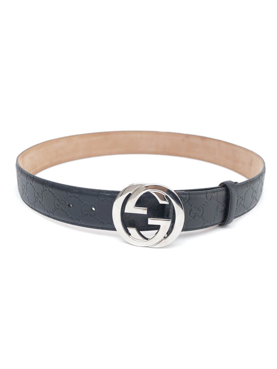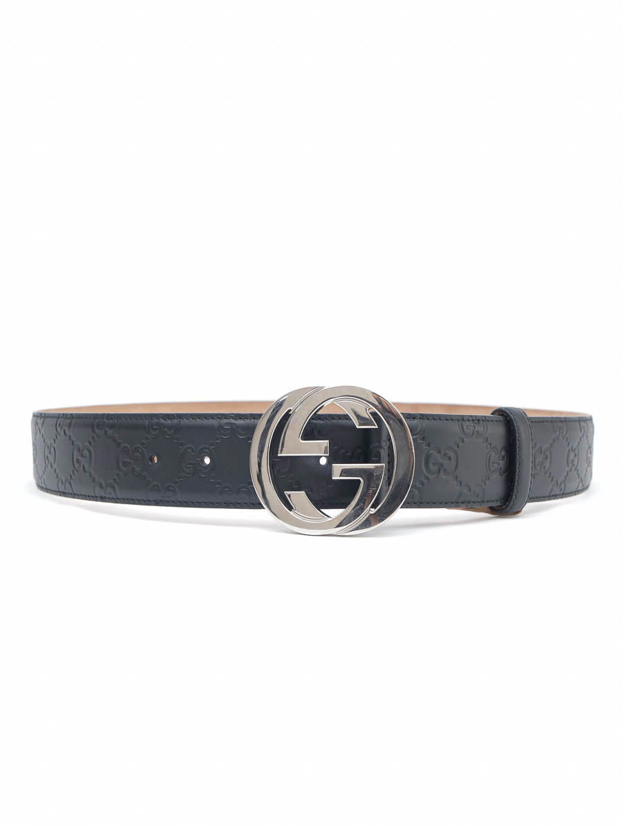 Cinto Gucci Interlocking Preto tamanho 95. Produzido em couro com relevo na cor preta e uma fivela de logotipo com as letras GG invertidas em metal com banho prata.