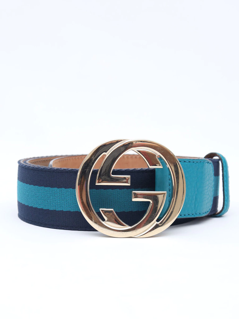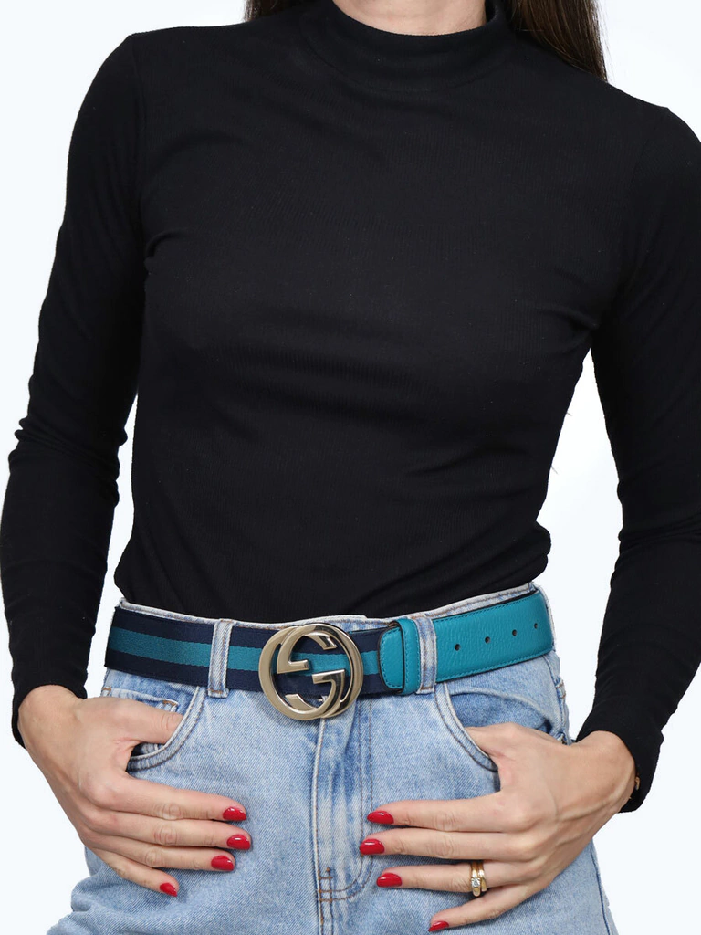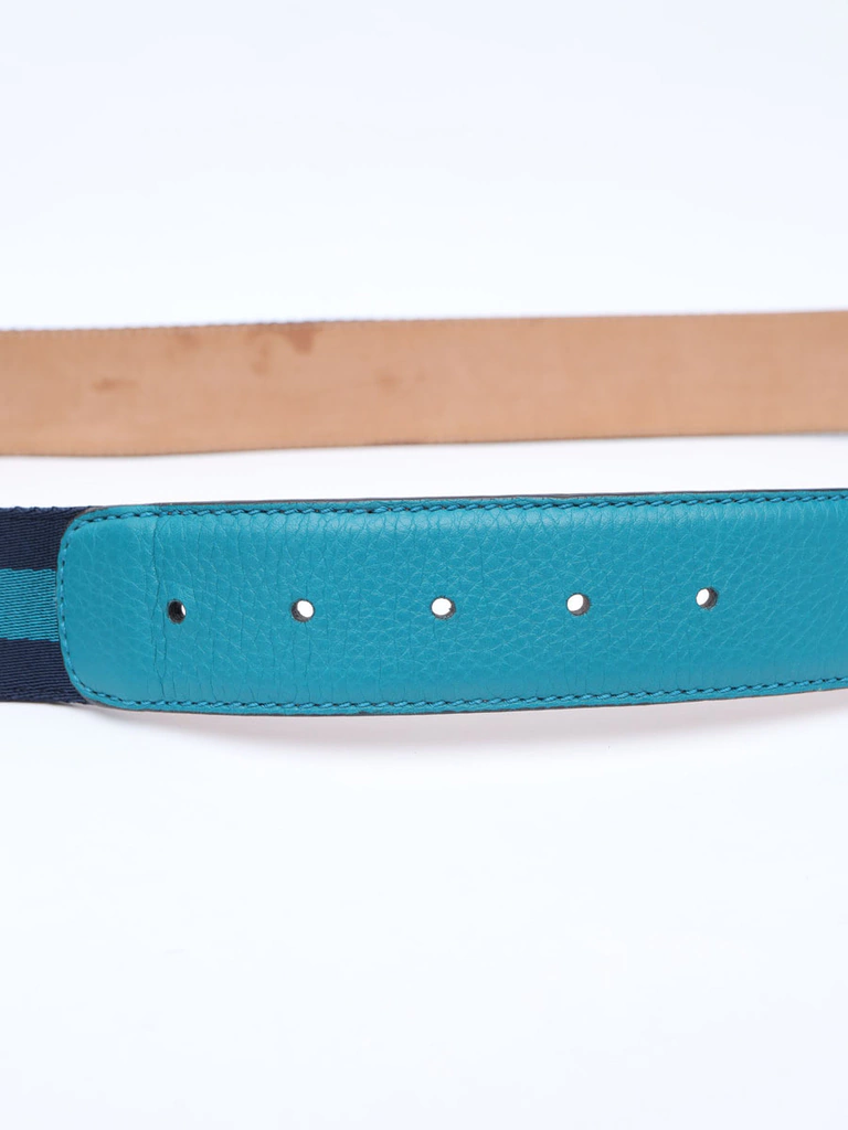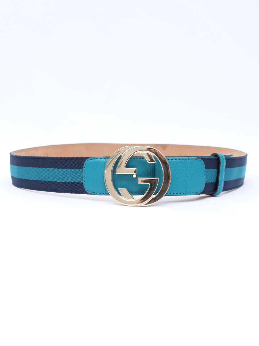 O Cinto Original Gucci Web Interlocking GG tamanho 95 é perfeito para eventos casuais. Produzido em tecido canvas na clássica faixa web Gucci nas cores azul turquesa e azul marinho, apresenta detalhes em couro na cor azul turquesa. Apresenta uma fivela de logotipo com as letras GG invertidas em metal com banho dourado.