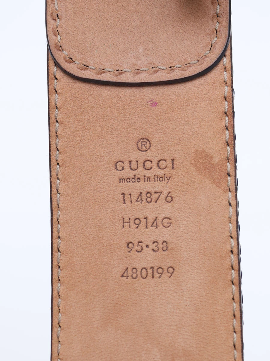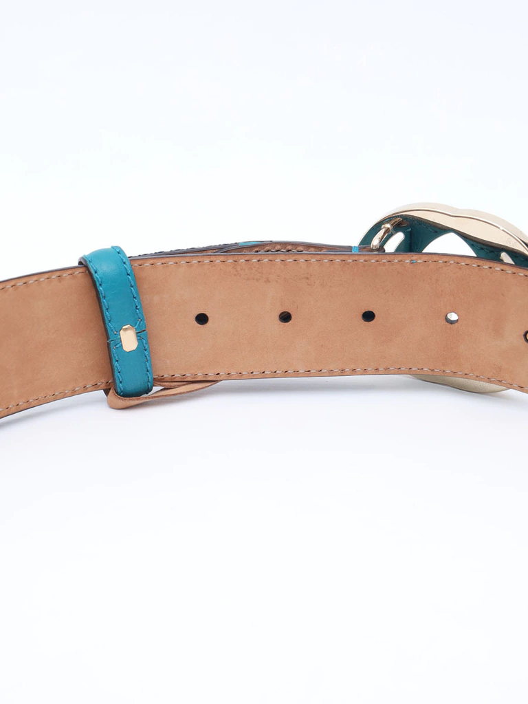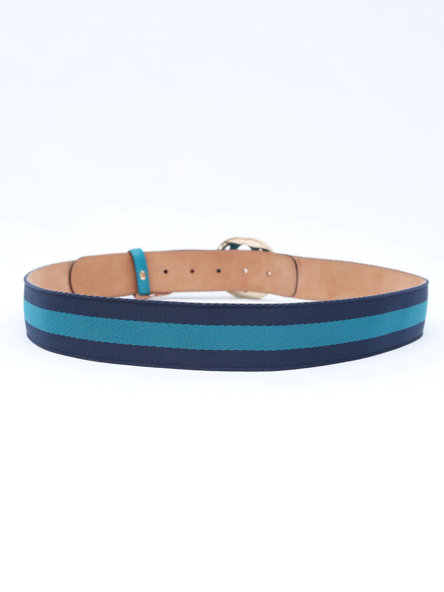 O Cinto Original Gucci Web Interlocking GG tamanho 95 é perfeito para eventos casuais. Produzido em tecido canvas na clássica faixa web Gucci nas cores azul turquesa e azul marinho, apresenta detalhes em couro na cor azul turquesa. Apresenta uma fivela de logotipo com as letras GG invertidas em metal com banho dourado.