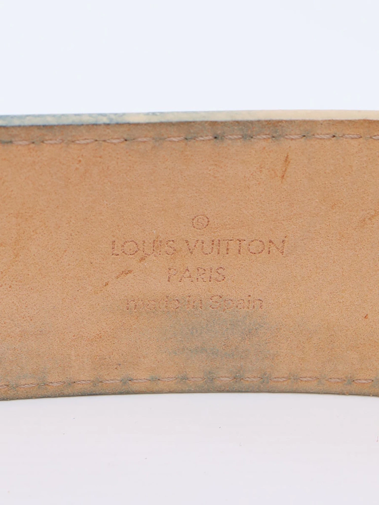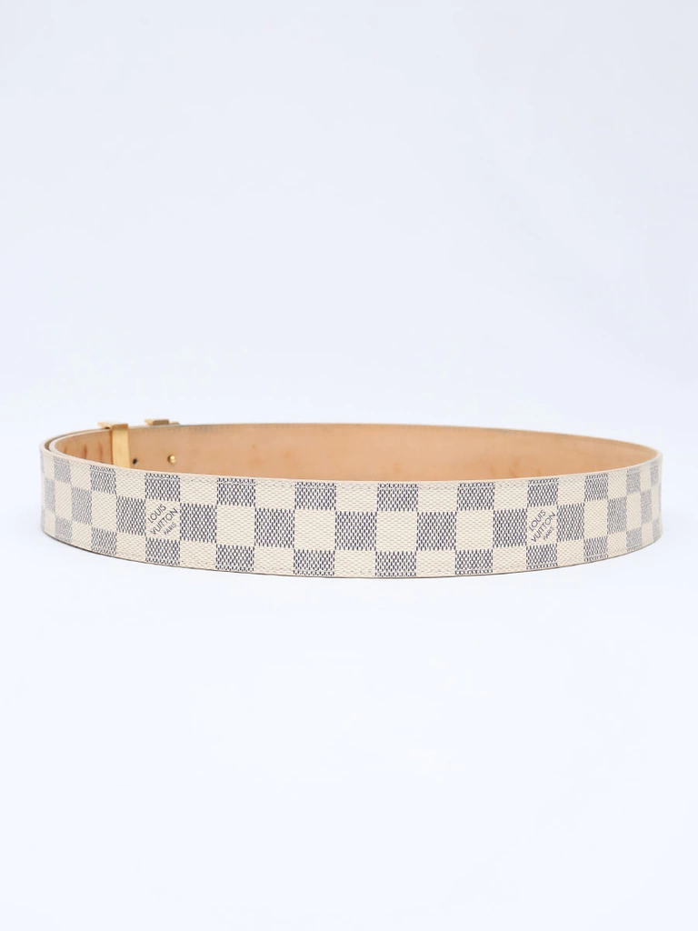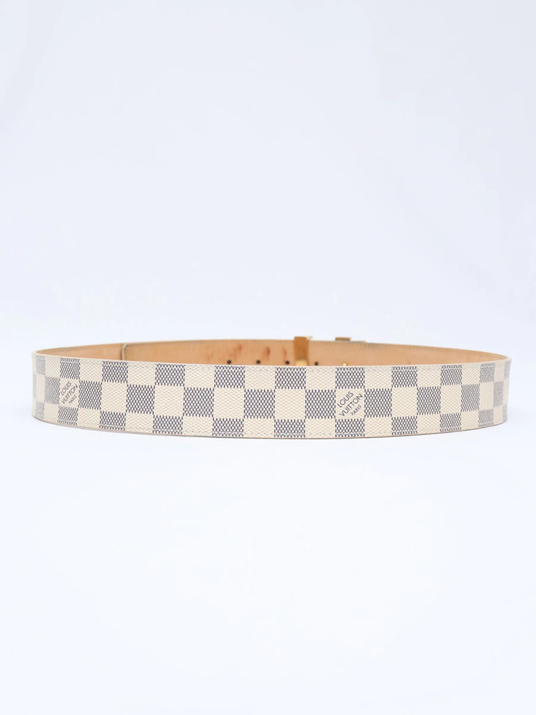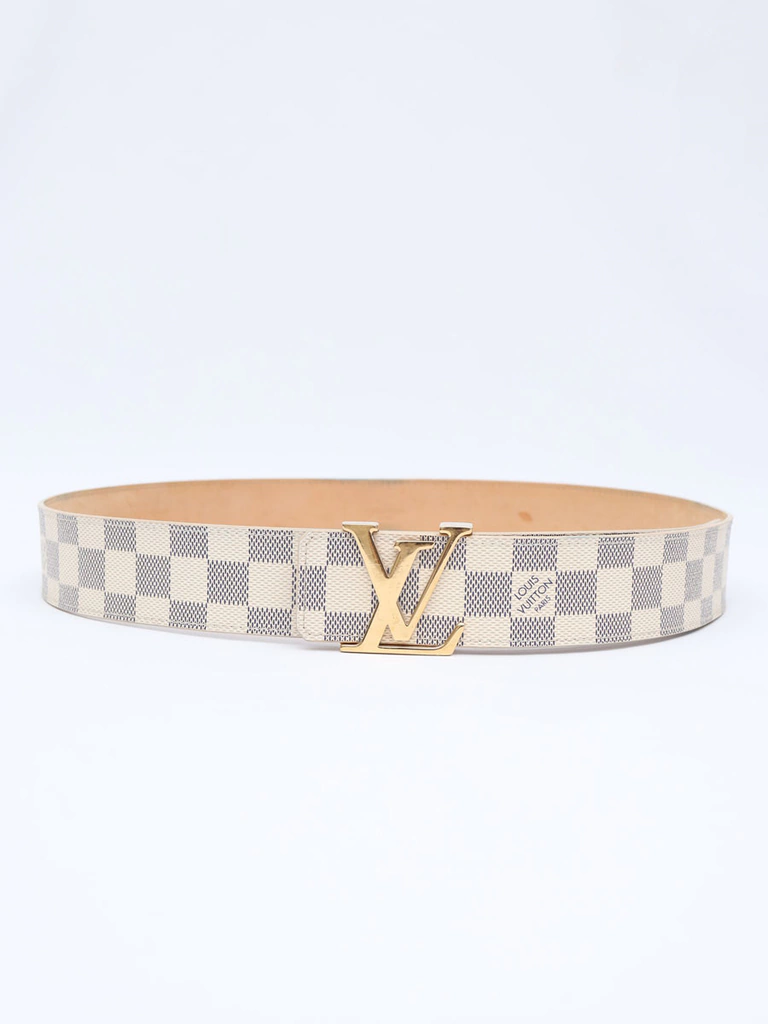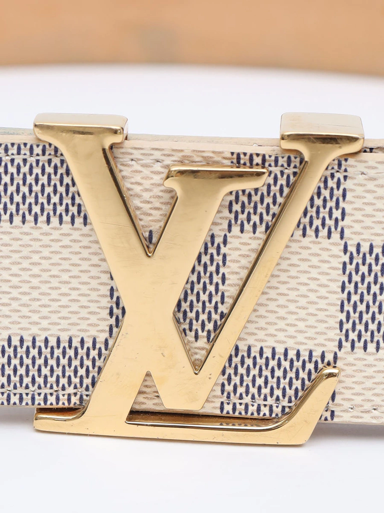 Cinto Autêntico Louis Vuitton Initiales 40mm tamanho 95 em canvas de alta durabilidade e com estampa Damier Azur é um clássico da LV. Com ferragens em metal dourado com brilho e fivela com as iniciais LV.