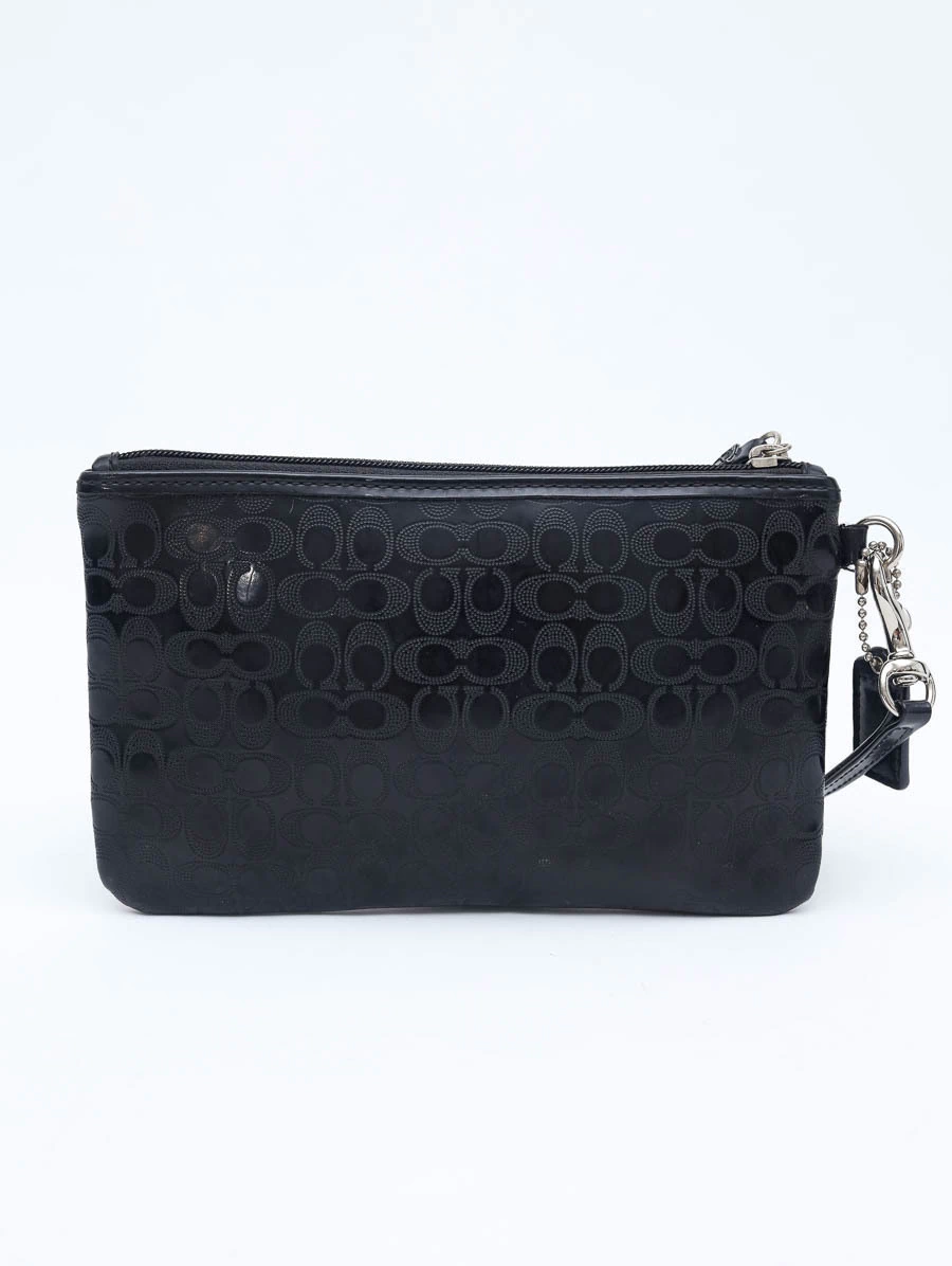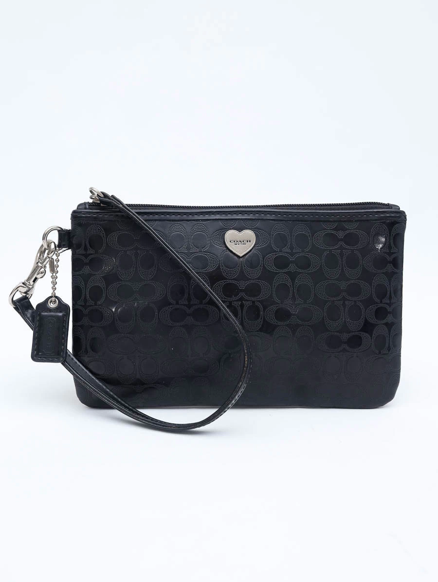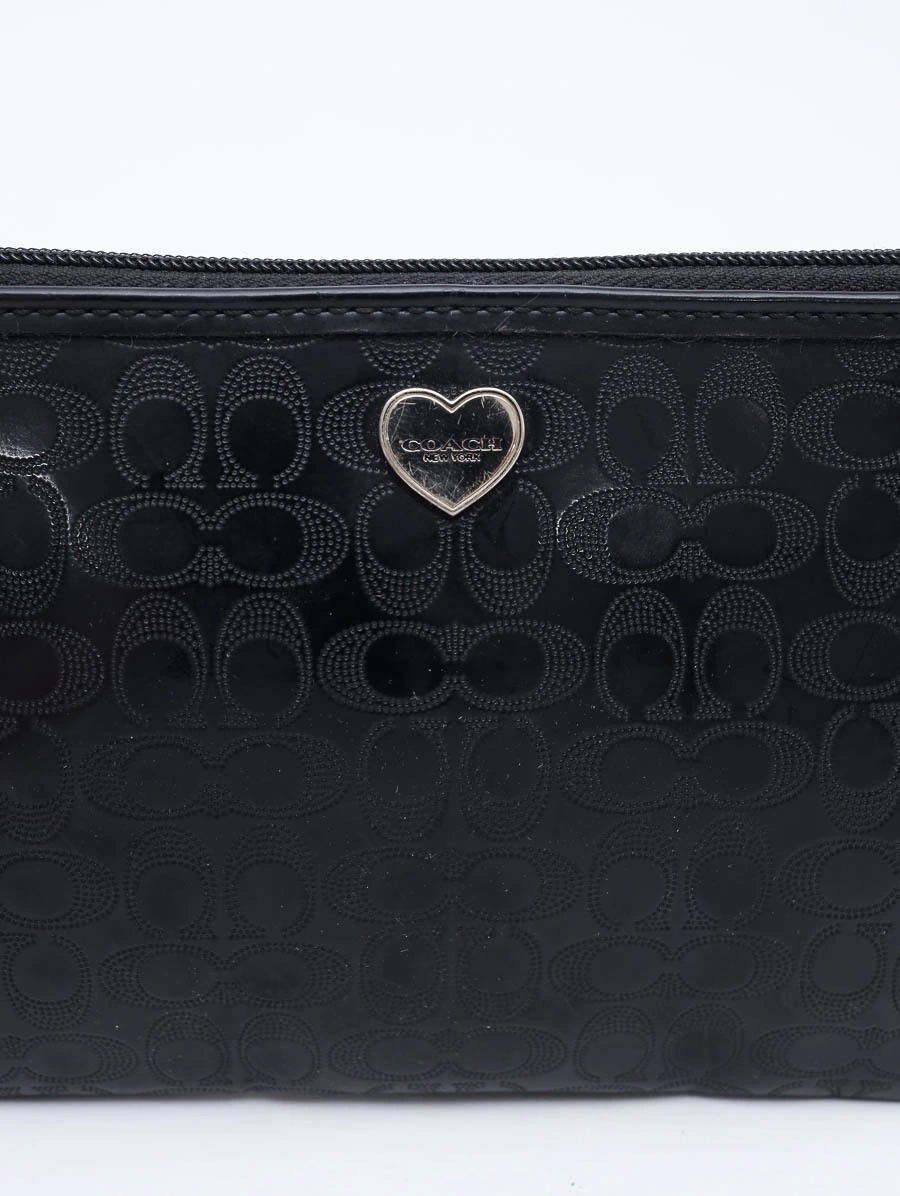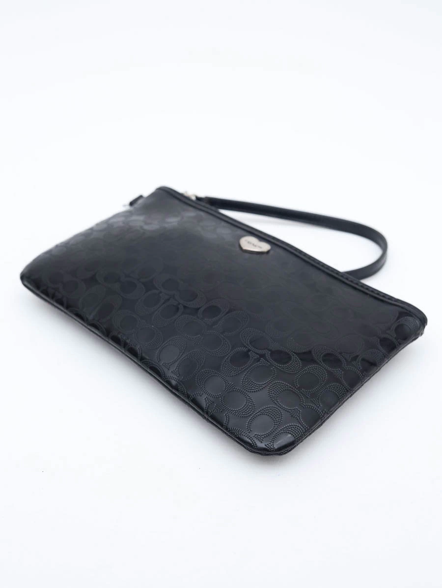 A Clutch Coach Perforated Liquid Gloss é perfeita para quem busca praticidade sem abrir mão de estilo. Feita em couro envernizado na cor preta, seu destaque está na textura em relevo com os ícones clássicos da marca — um toque divertido e elegante ao mesmo tempo, além de um coração metálico na parte frontal.