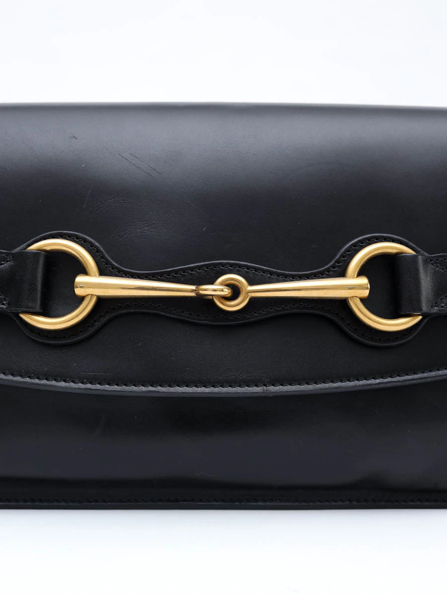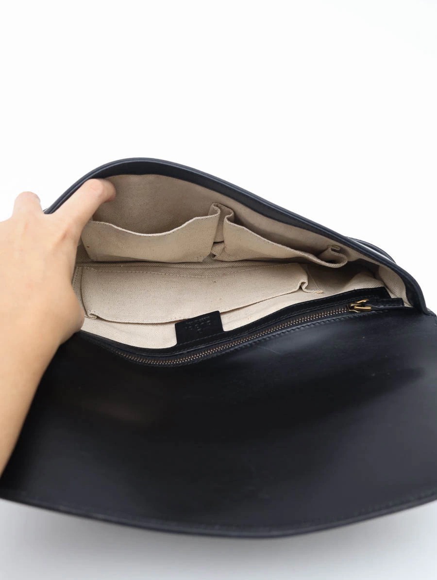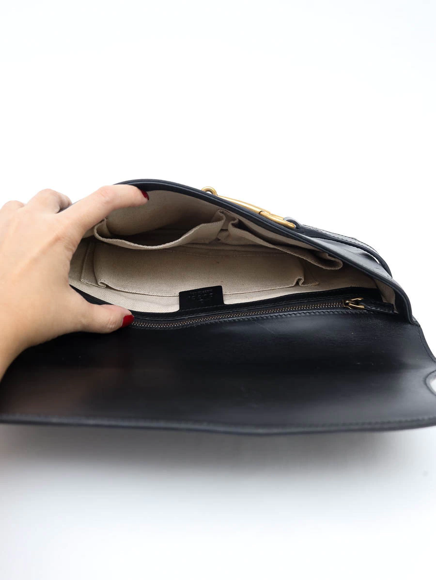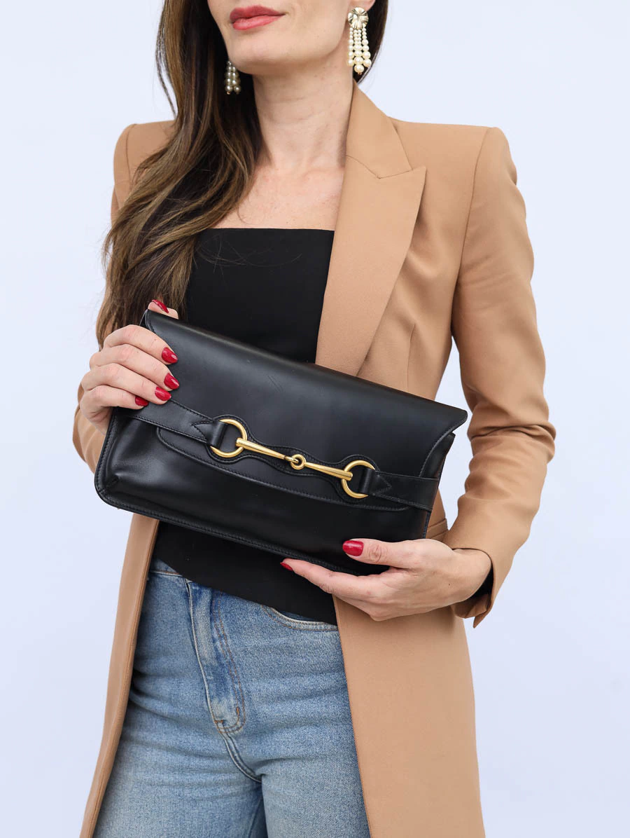 A Clutch Gucci Bright Bit é uma peça sofisticada que combina elegância atemporal com o design icônico da marca. Confeccionada em couro preto de alta qualidade, apresenta o emblemático Horsebit em metal dourado na parte frontal, simbolizando a tradição e o luxo da Gucci. Esta clutch possui um design compacto e funcional, ideal para ocasiões formais ou eventos especiais. O interior espaçoso permite acomodar itens essenciais como celular, cartões e maquiagem. Apresenta bolsos internos, incluindo um bolso com fecho de zíper, para organização adicional.