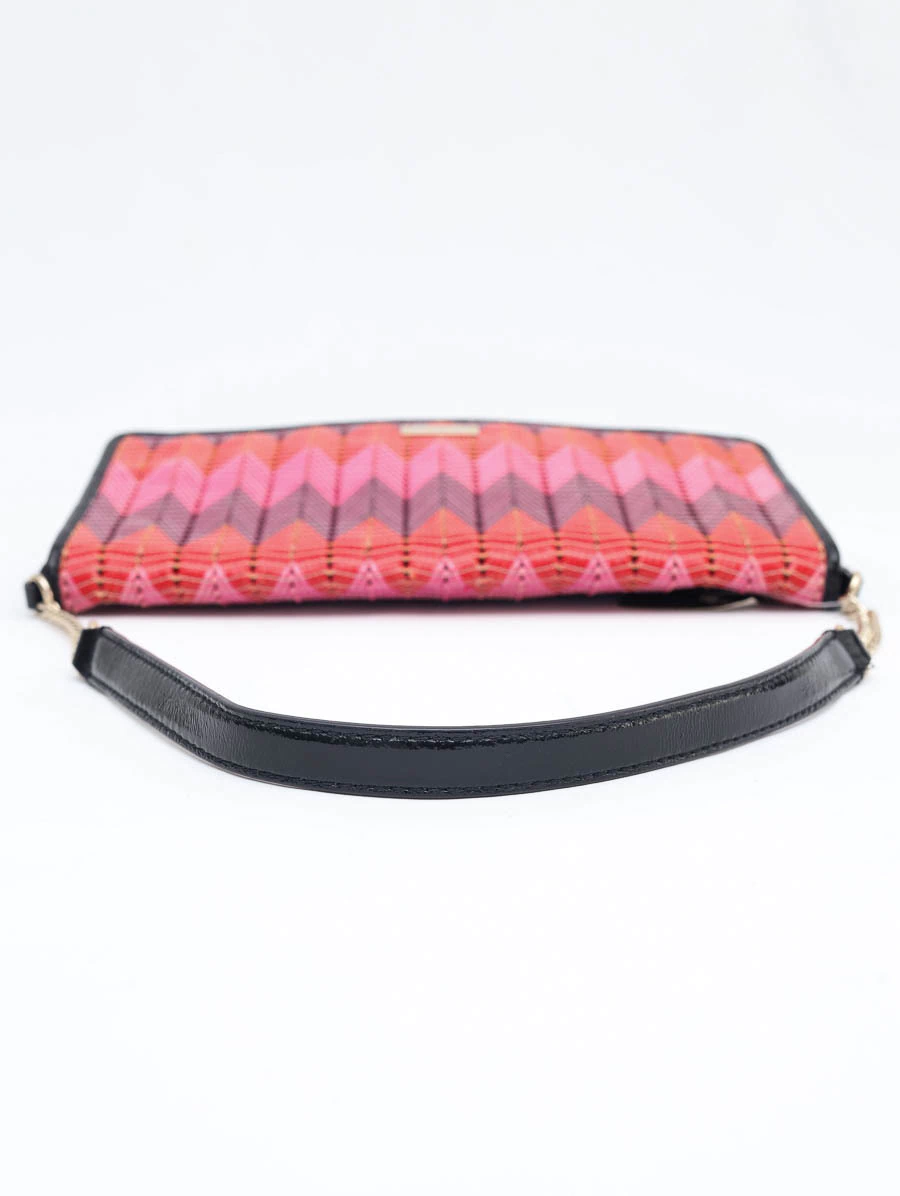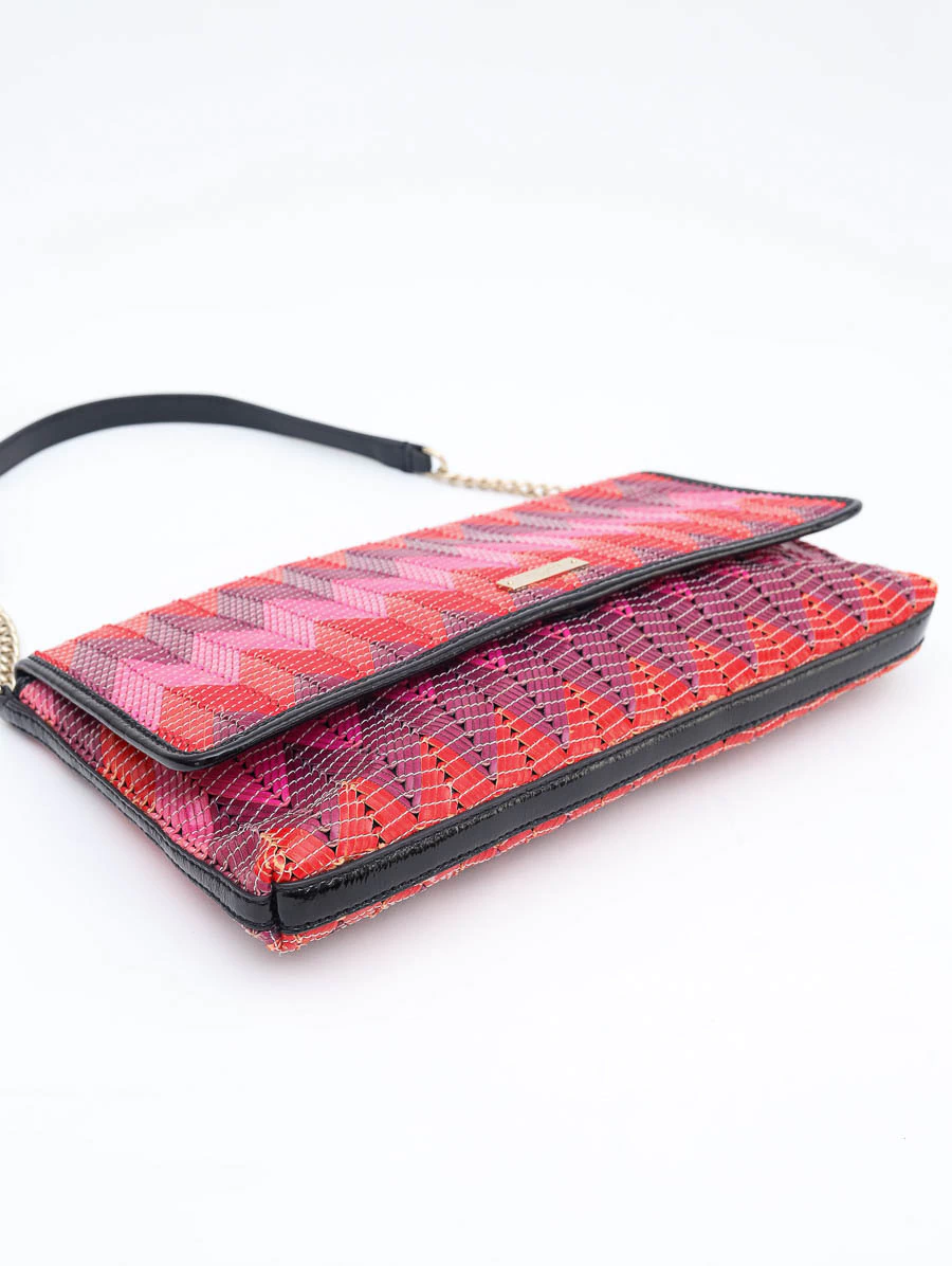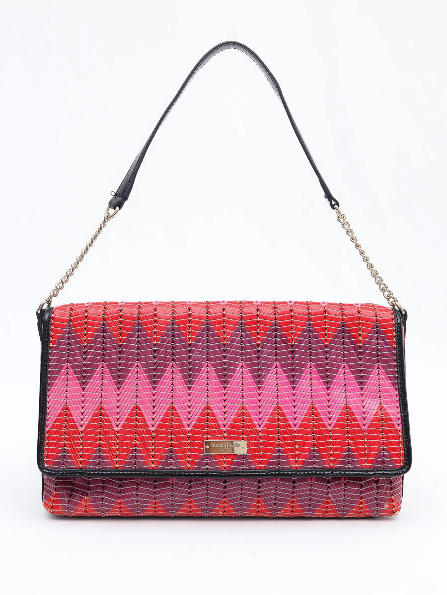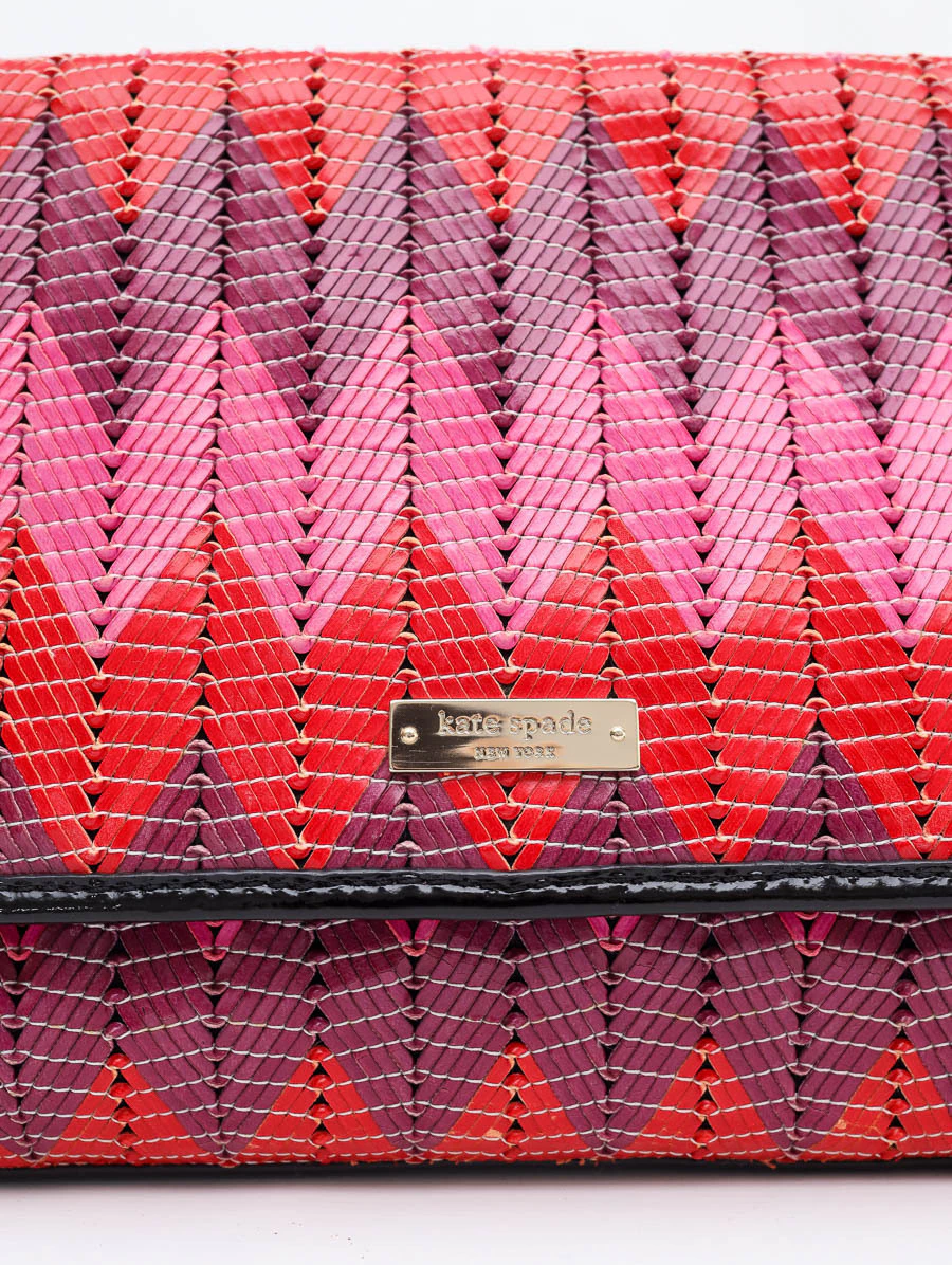 Clutch Kate Spade Beverly Breeze Abrielle. Produzida em padrão zig zag nas cores rosa, roxo e vermelho, essa peça é um verdadeiro destaque. A estrutura em tecido texturizado e acabamento com detalhes em couro preto garante elegância e durabilidade.