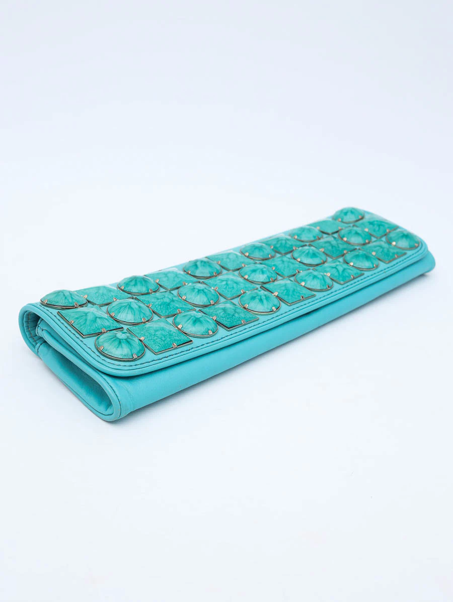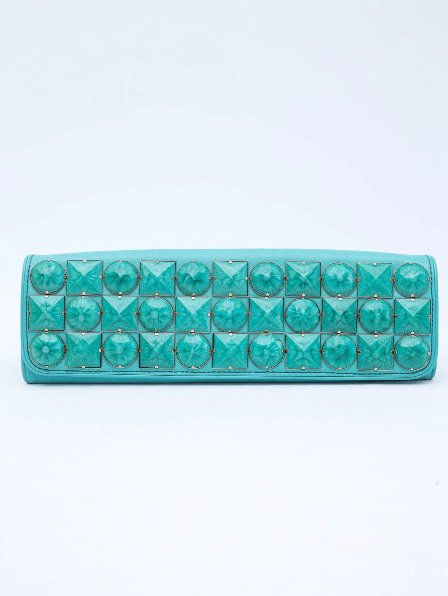 Em excelente estado de conservação, a clutch apresenta suas pedras sem nenhum defeito, refletindo sua beleza original. O couro está extremamente conservado, com apenas pequenas ondulações na estrutura, enquanto o interior permanece em perfeito estado de conservação.