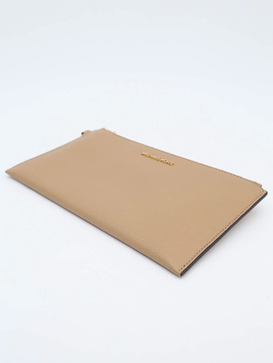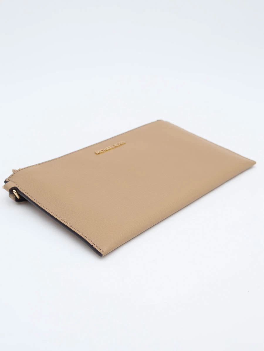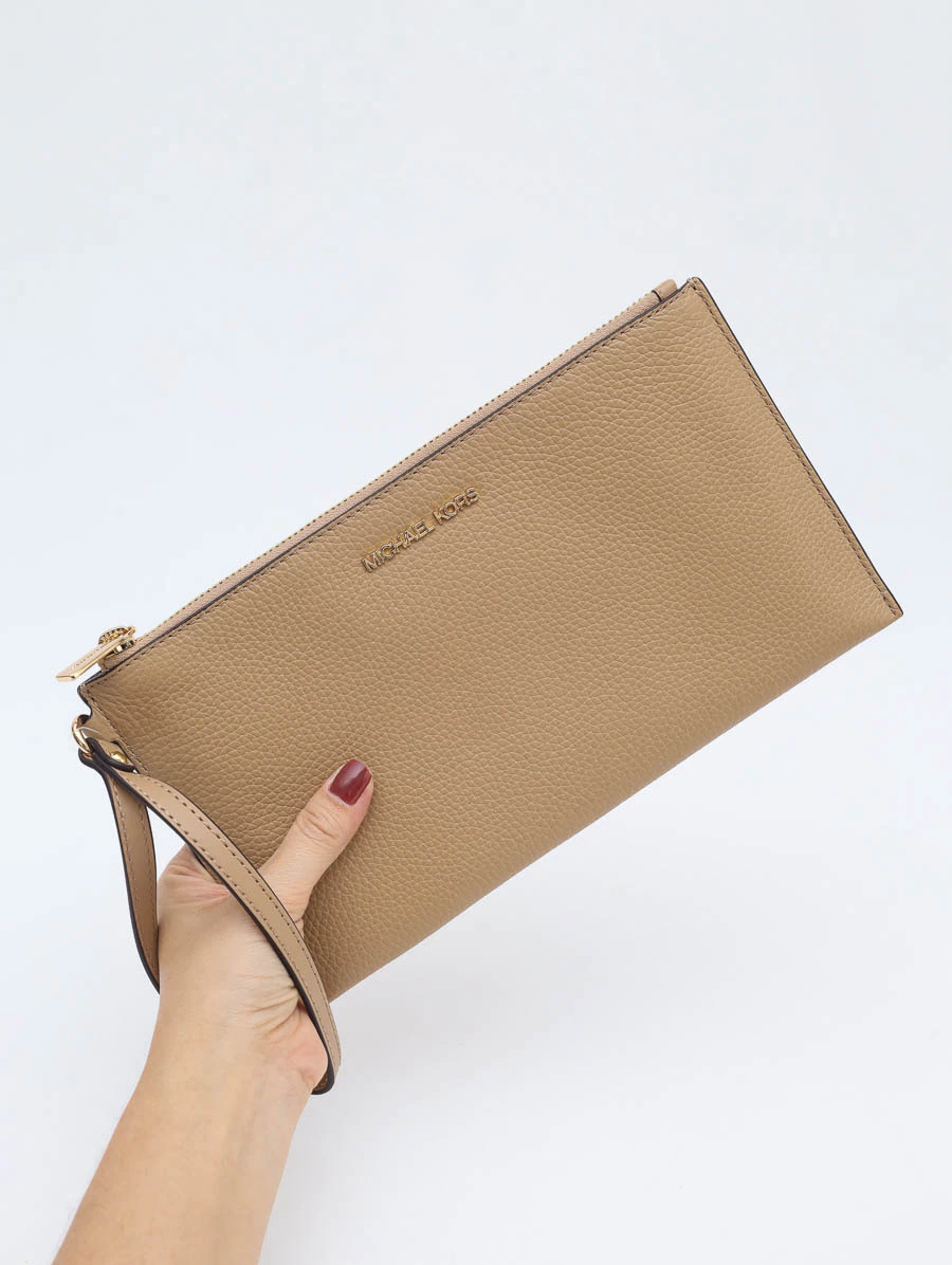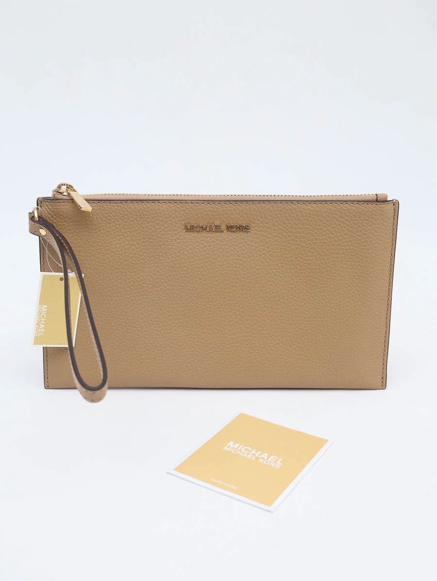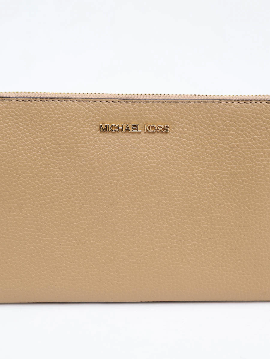 Clutch Michael Kors Bege produzida em couro na cor bege/marrom e ferragens douradas. Apresenta uma alça de punhos, abertura com zíper e compartimento único com um bolso aberto.
